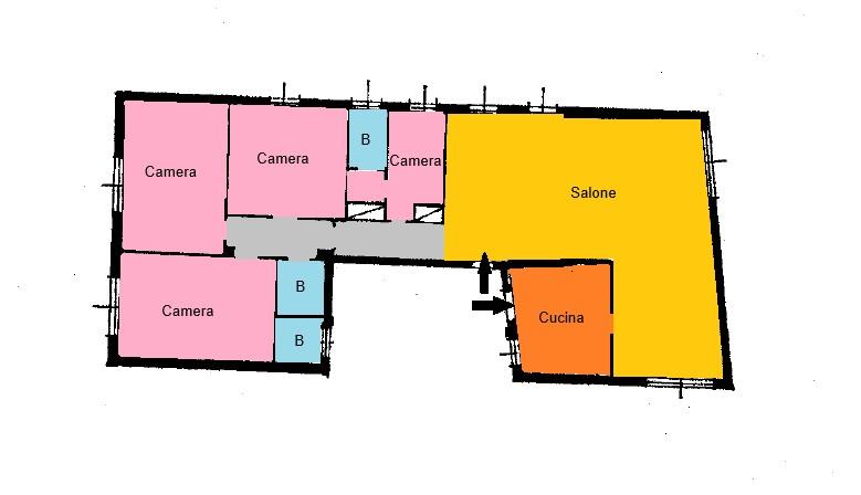 L'immobile dotato di un doppio ingresso si compone internamente di: salone doppio, cucina con tinello, quattro camere da letto e tripli servizi.