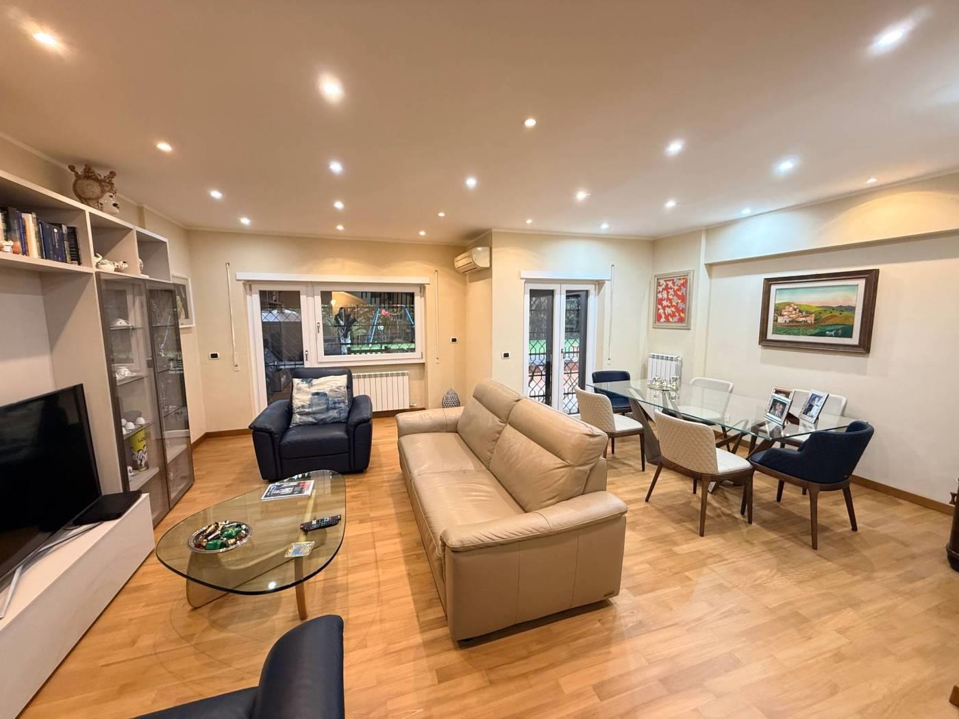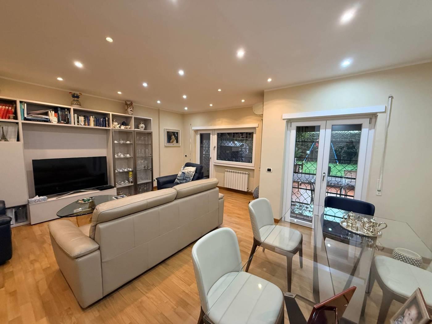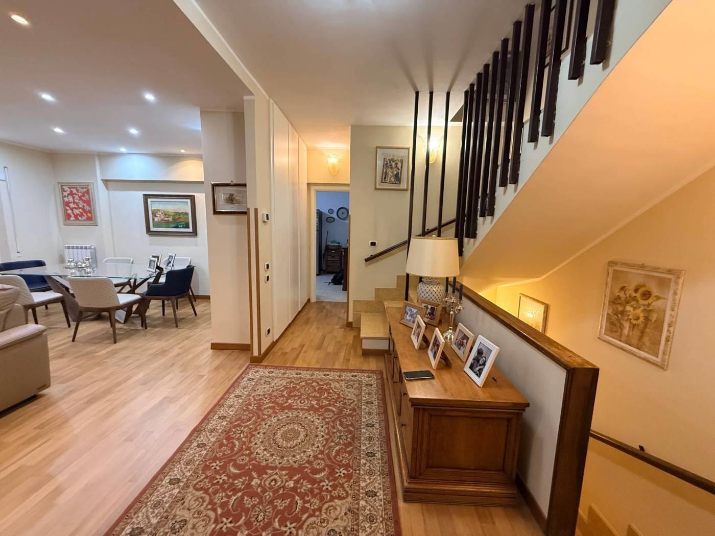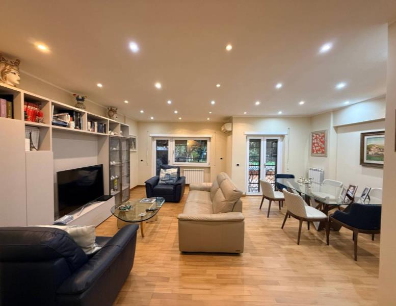 Scopri questo splendido appartamento situato in una palazzina completamente ristrutturata nel cuore di Mostacciano. Con una superficie commerciale di 180 m², l'immobile offre si sviluppa su 3 livelli. Al piano dell'ingresso troviamo un'ampia e luminosa zona giorno grazie alla sua tripla esposizione composta da un ampio salone, un servizio ed una cucina abitabile con accesso diretto al giardino. Gli spazi interni sono rifiniti con pavimentazione in parquet di alta qualità e infissi di marca Schuco, garantendo un'ottima isolamento termico e acustico.