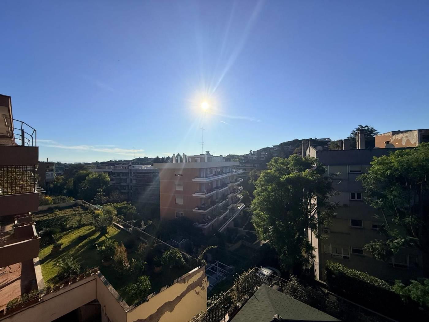 Le due spaziose camere da letto, dotate di parquet e accesso diretto al terrazzo vivibile, garantiscono un ambiente accogliente e luminoso. Grazie alla sua tripla esposizione l'immobile risulta luminoso durante tutto l'arco della giornata. Completano la proprietà due bagni finestrati recentemente ristrutturati e un comodo studio, perfetto per chi lavora da casa. La presenza di due armadi a muro e una cassaforte in una delle camere offrono ulteriore praticità e sicurezza. L'appartamento è dotato di porta blindata, aria condizionata, grate di protezione e zanzariere, assicurando comfort in ogni stagione. Il posto auto coperto e la cantina aggiungono valore a questa proposta già irresistibile.