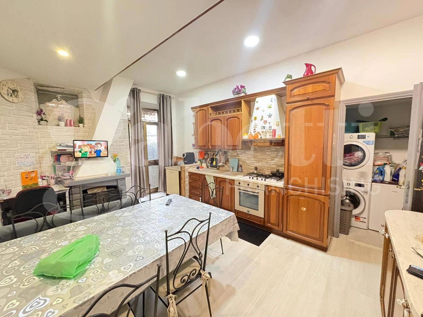 La cucina ampia e abitabile, dove troviamo anche un comodo ripostiglio ad oggi usato come lavanderia, ha accesso diretto al giardino di 30 mq.