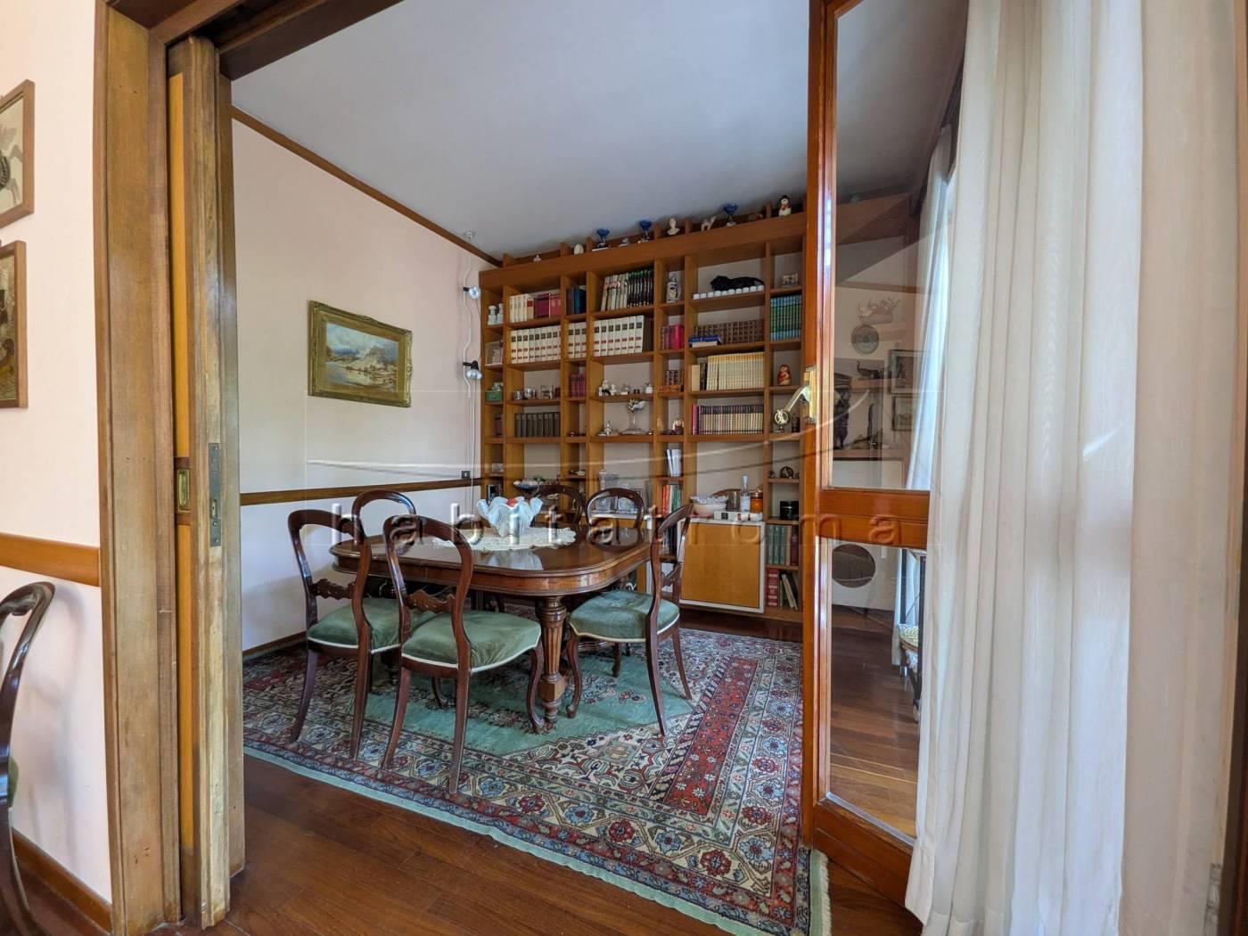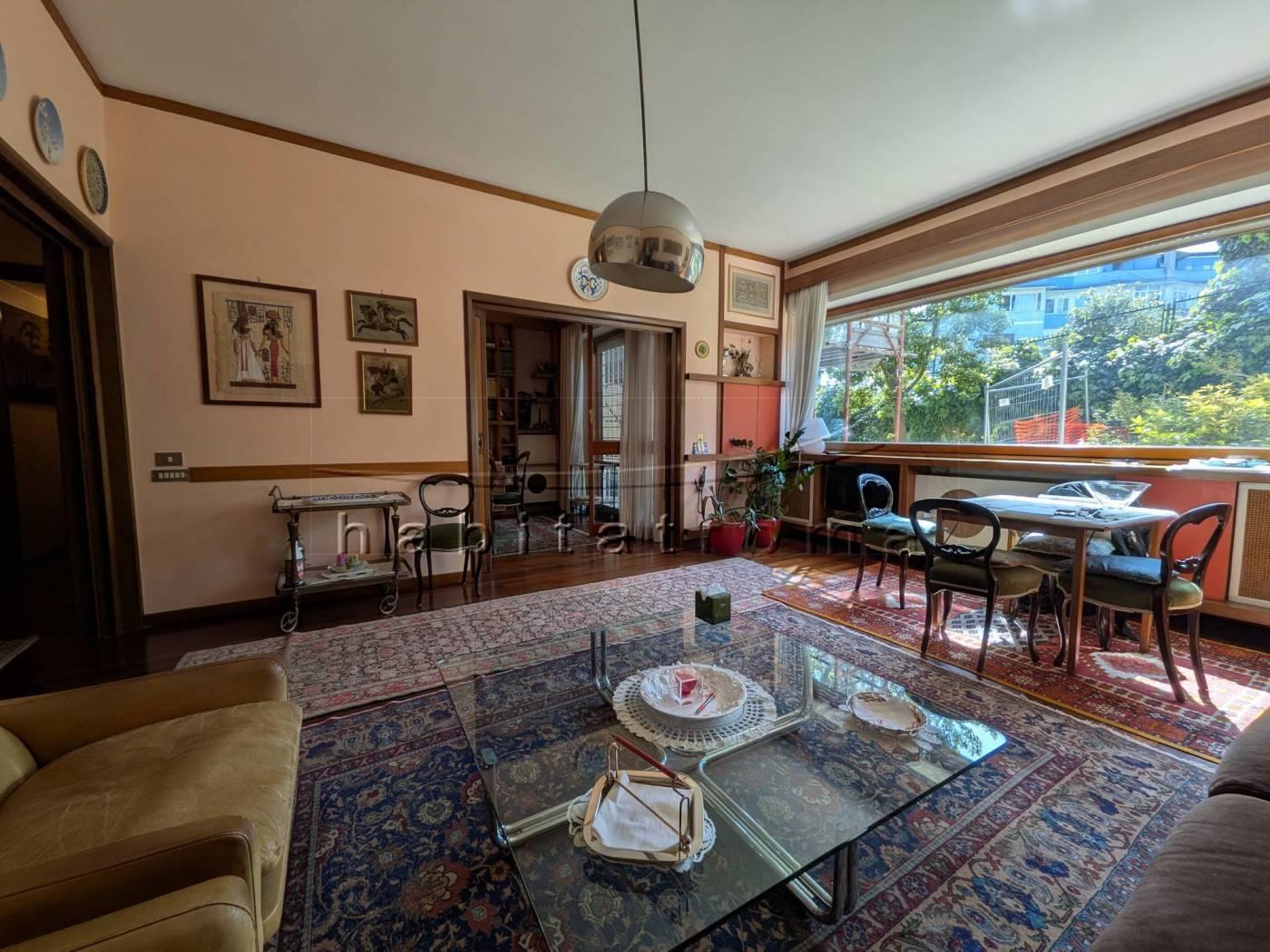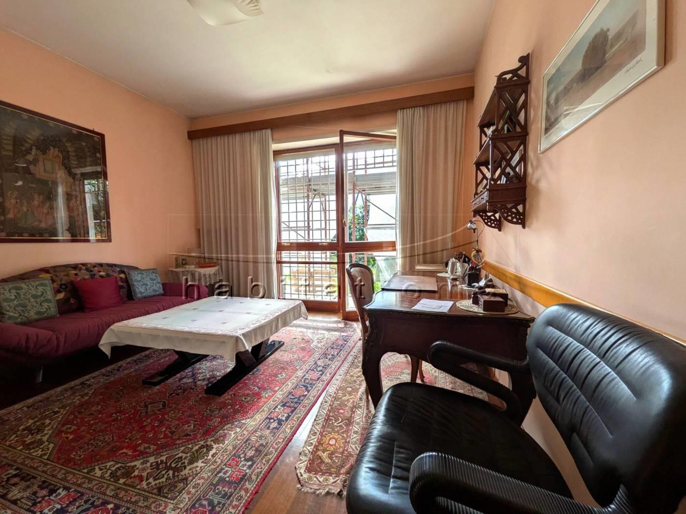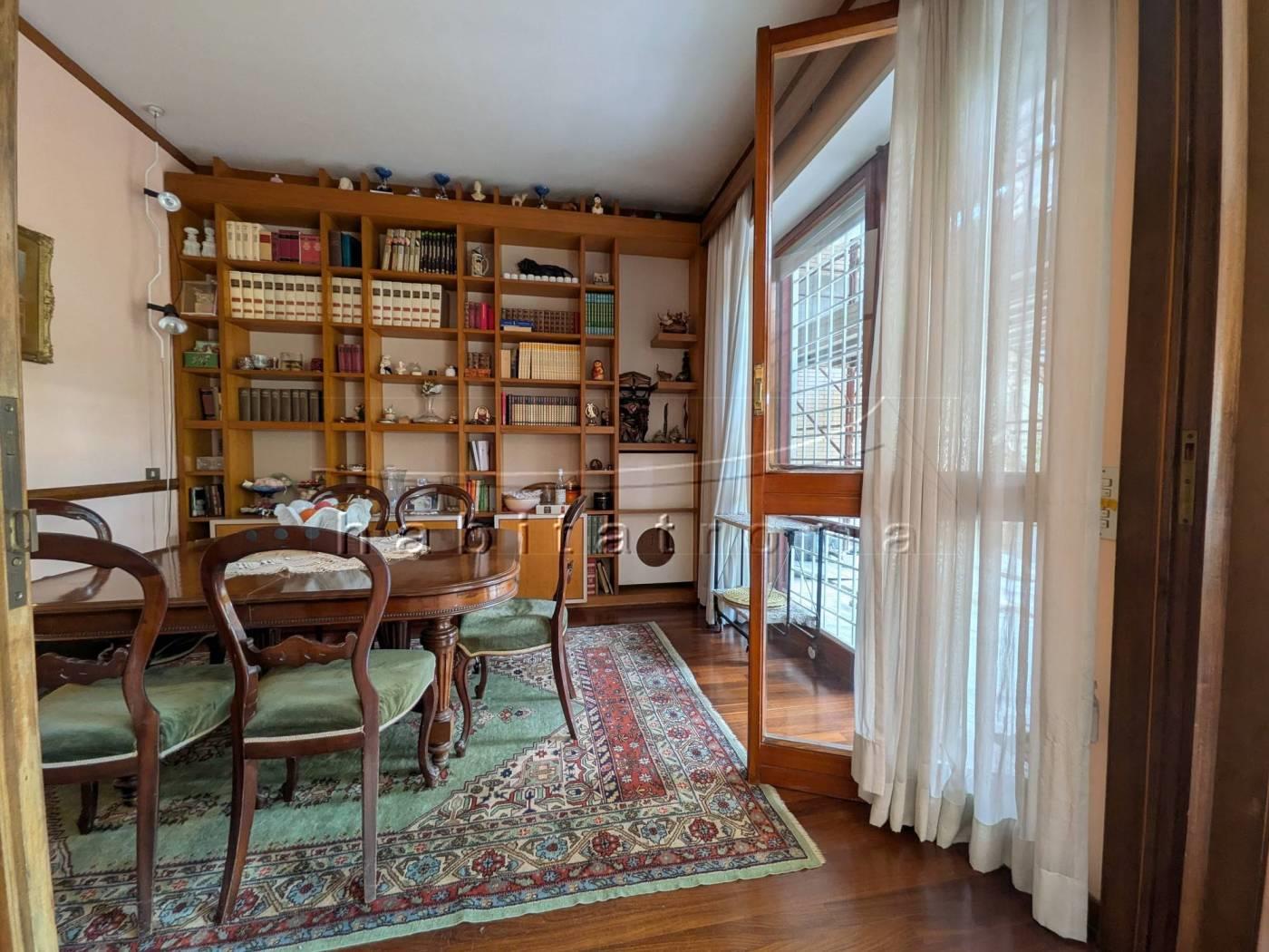 L’appartamento si sviluppa per complessivi 220mq circa, ed affaccia su un guardino privato di circa 550mq, parte a verde e parte terrazzato. La distribuzione originaria dell’immobile è la seguente: ampio ingresso con cabina armadio/guardaroba, salone doppio di rappresentanza con ampie vetrate ed uscite sul giardino, comunicante studio/sala pranzo, corridoio di accesso alla zona notte, tre camere da letto, doppi servizi e disimpegni; la zona servizi è costituita dal secondo ingresso, office/tinello ed adiacente cucina, camera e bagno di servizio.