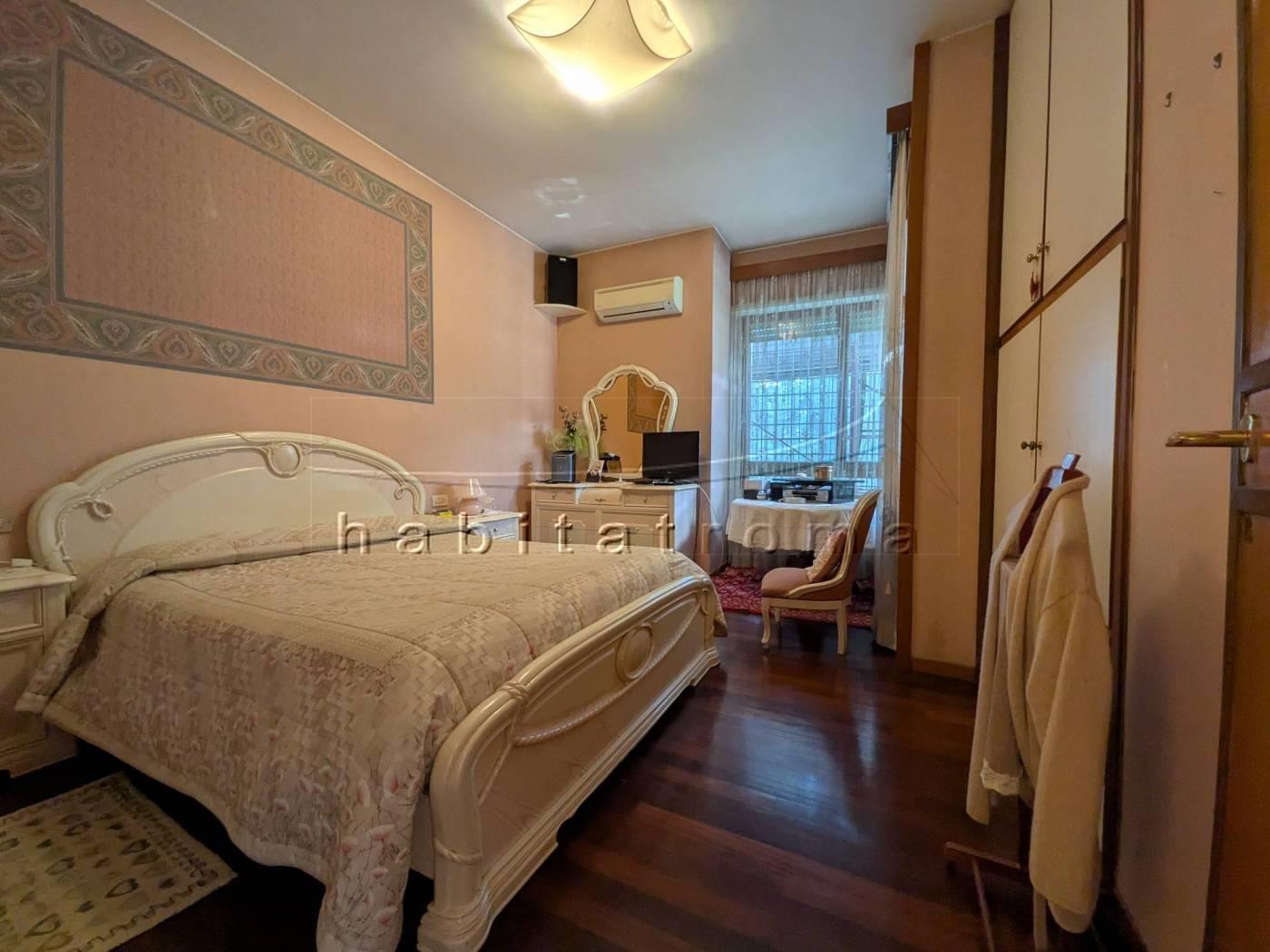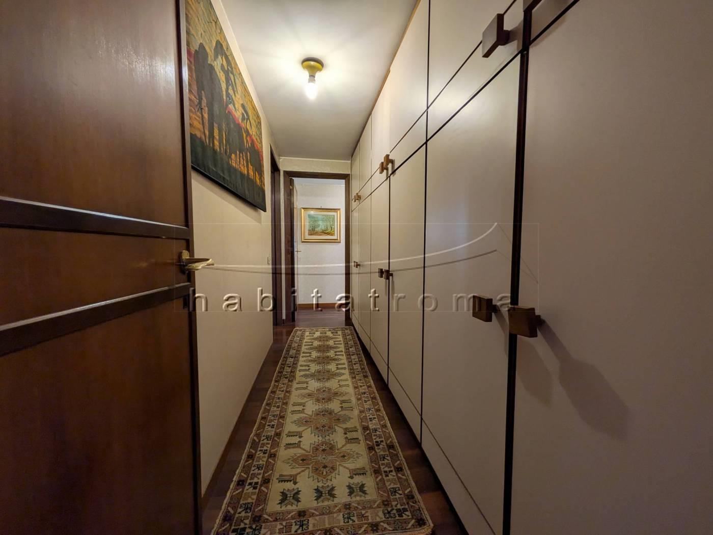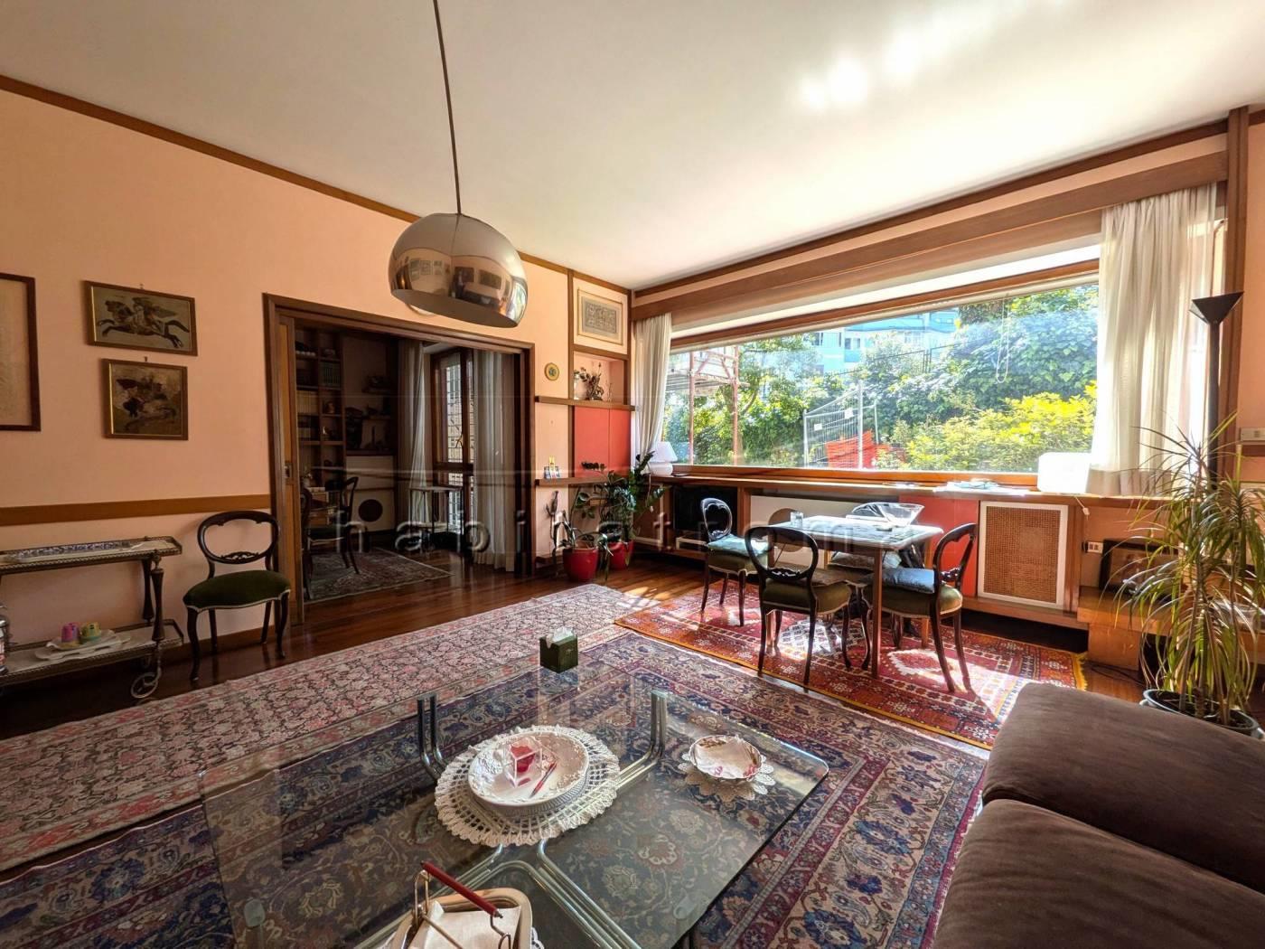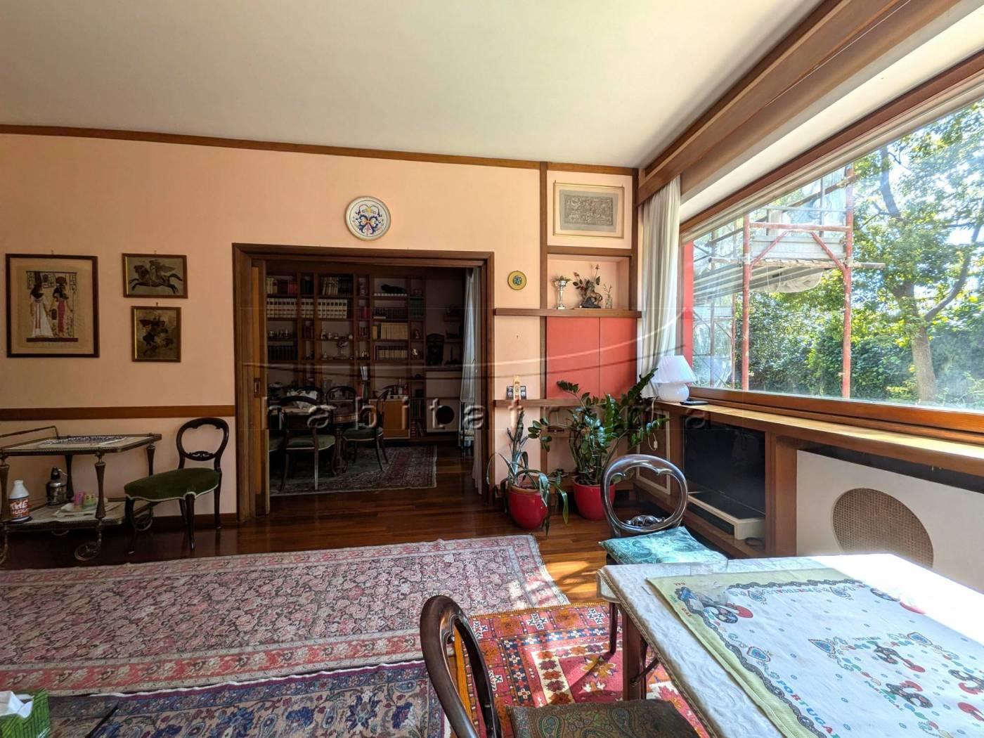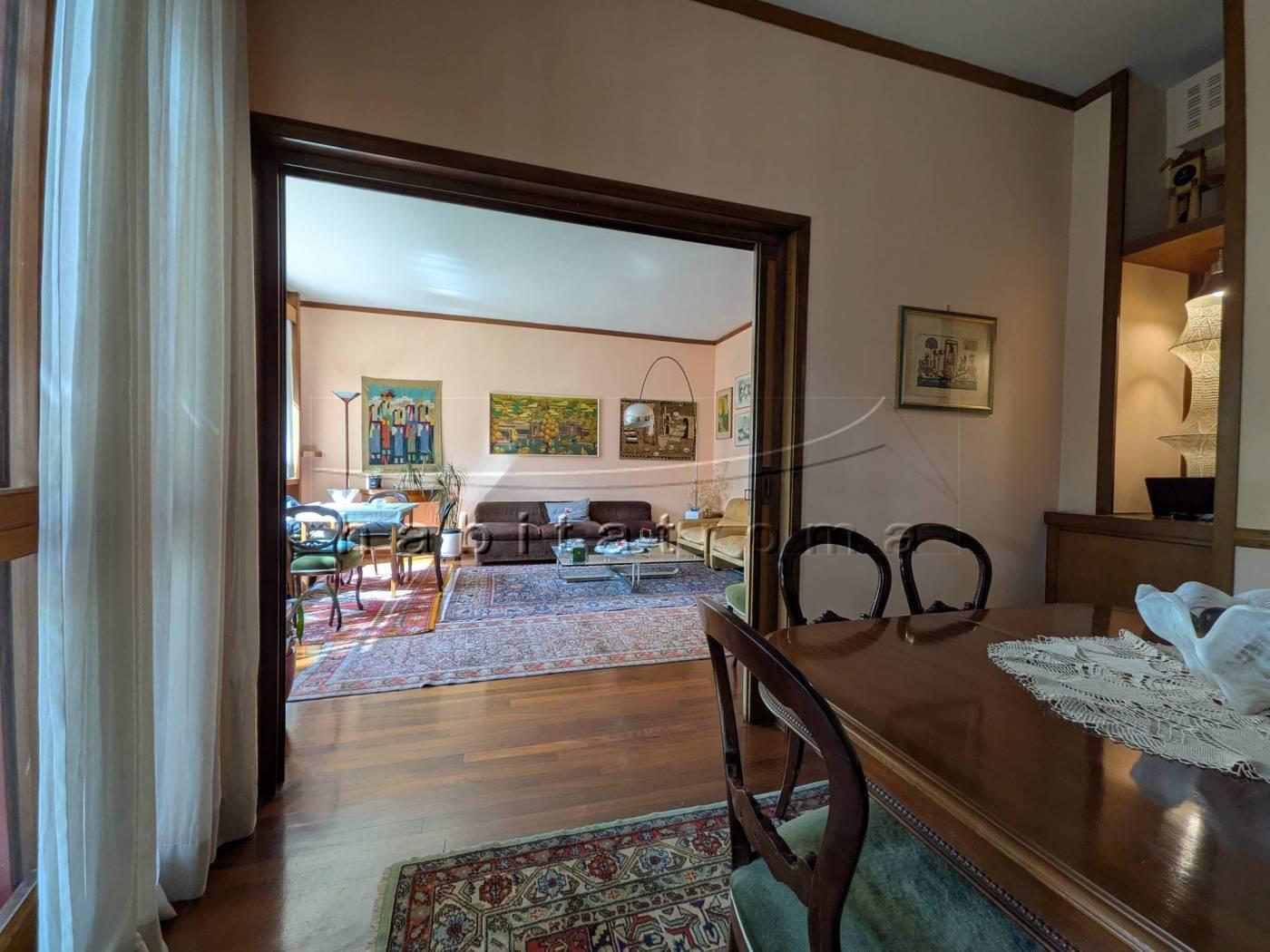 L’appartamento si sviluppa per complessivi 220mq circa, ed affaccia su un guardino privato di circa 550mq, parte a verde e parte terrazzato. La distribuzione originaria dell’immobile è la seguente: ampio ingresso con cabina armadio/guardaroba, salone doppio di rappresentanza con ampie vetrate ed uscite sul giardino, comunicante studio/sala pranzo, corridoio di accesso alla zona notte, tre camere da letto, doppi servizi e disimpegni; la zona servizi è costituita dal secondo ingresso, office/tinello ed adiacente cucina, camera e bagno di servizio.
