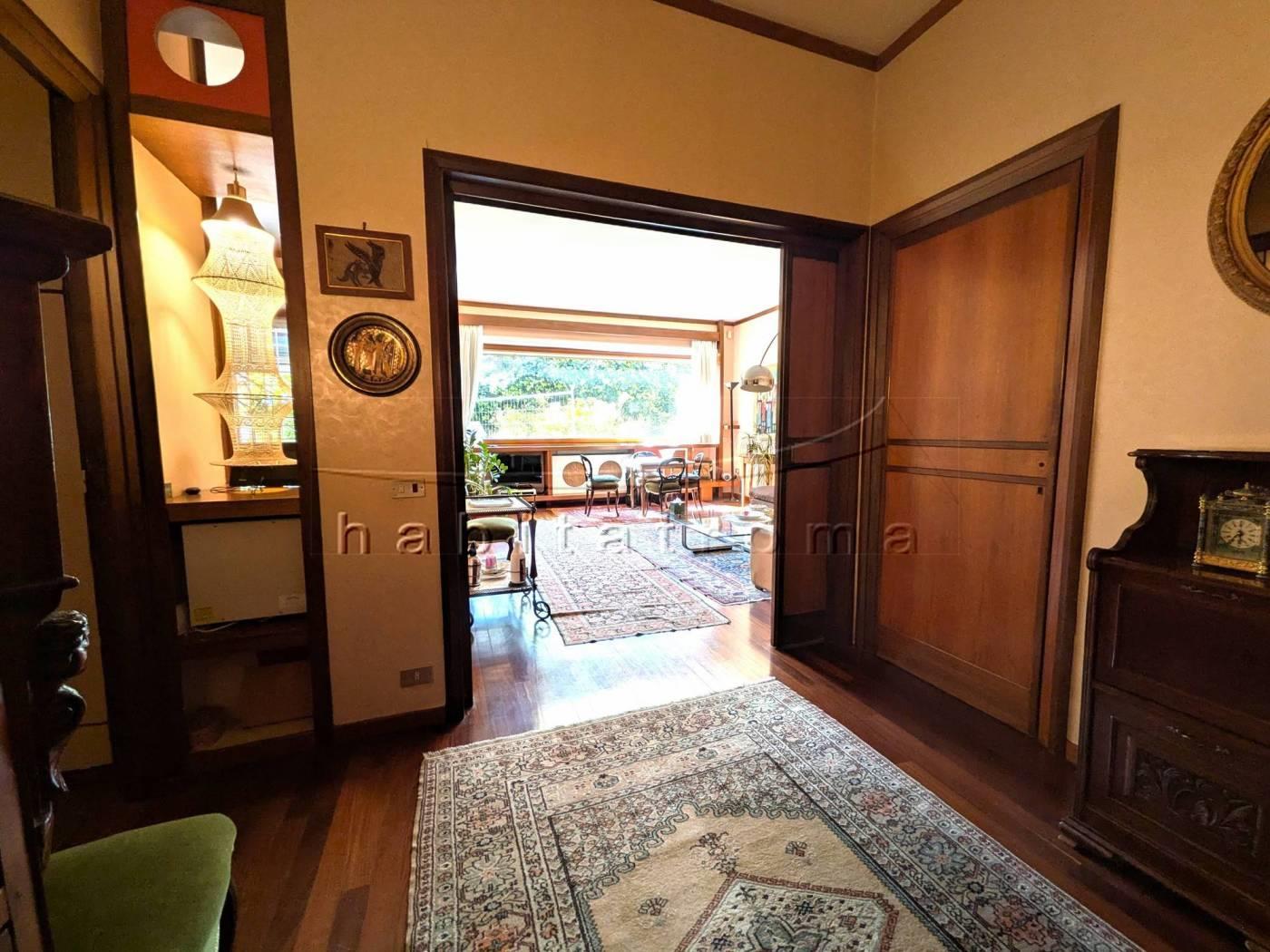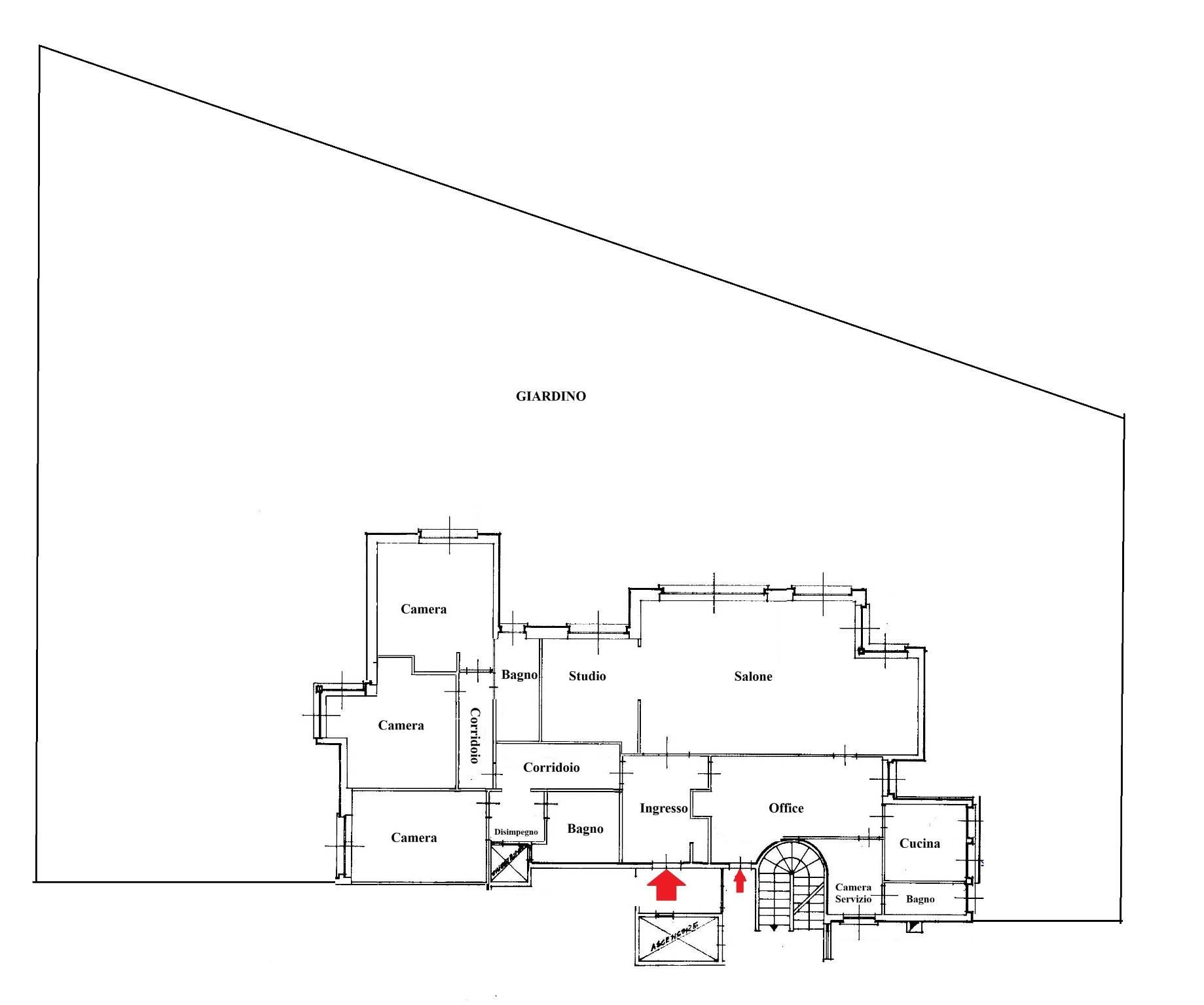 La distribuzione originaria dell’immobile è la seguente: ampio ingresso con cabina armadio/guardaroba, salone doppio di rappresentanza con ampie vetrate ed uscite sul giardino, comunicante studio/sala pranzo, corridoio di accesso alla zona notte, tre camere da letto, doppi servizi e disimpegni; la zona servizi è costituita dal secondo ingresso, office/tinello ed adiacente cucina, camera e bagno di servizio.