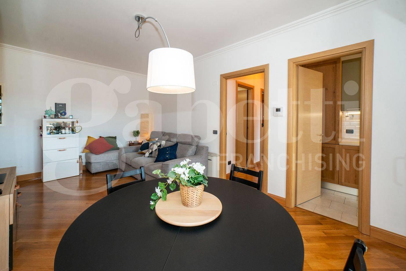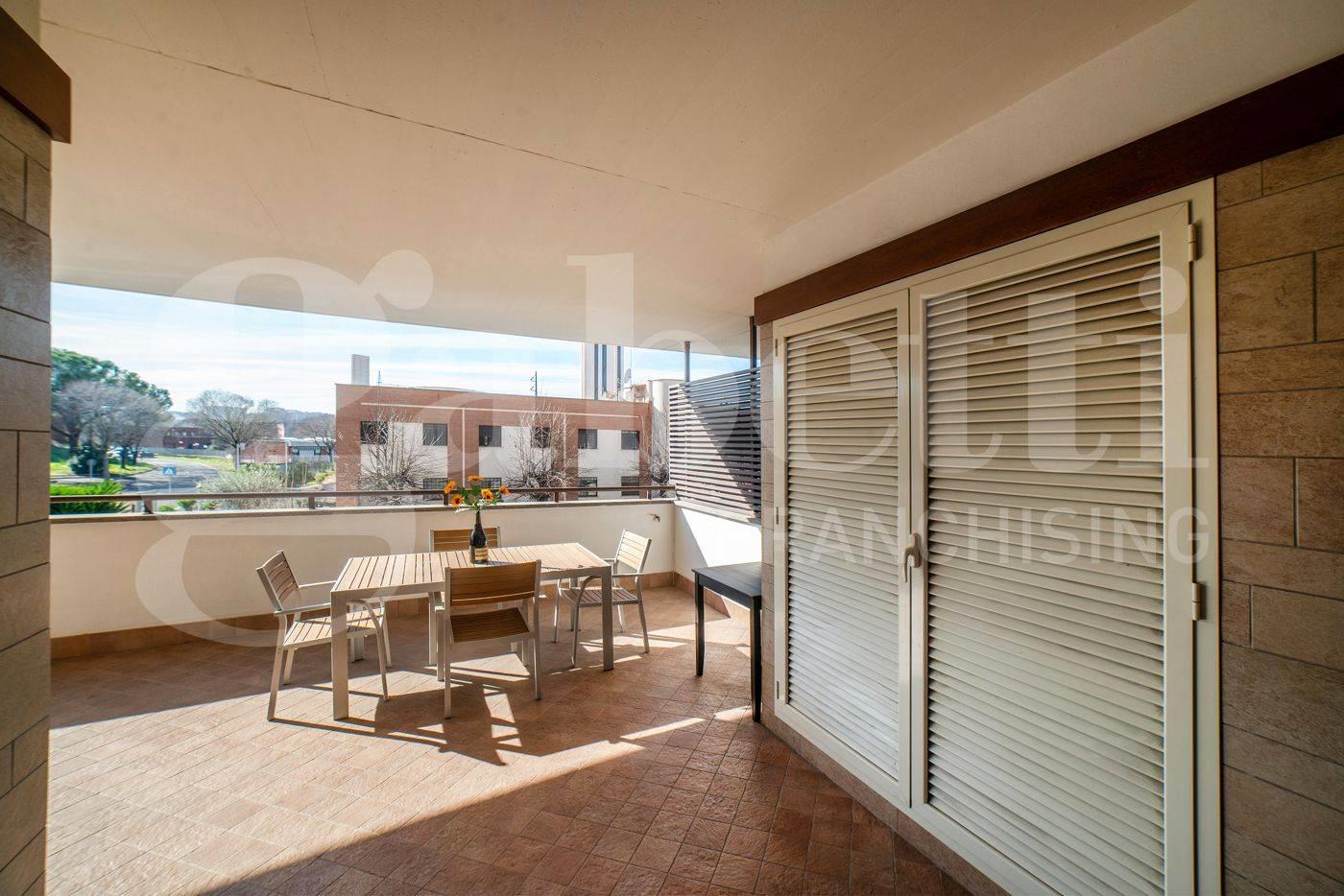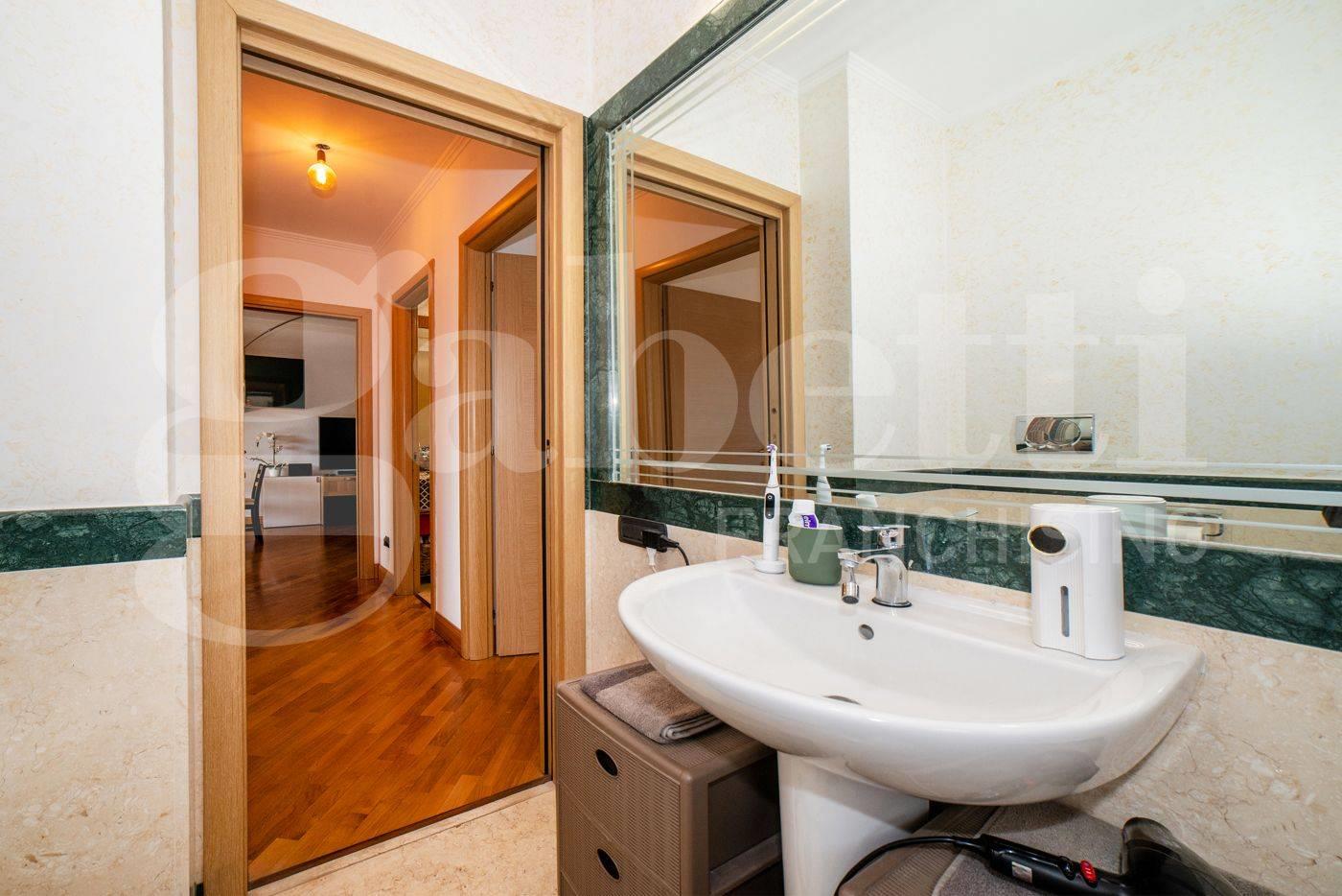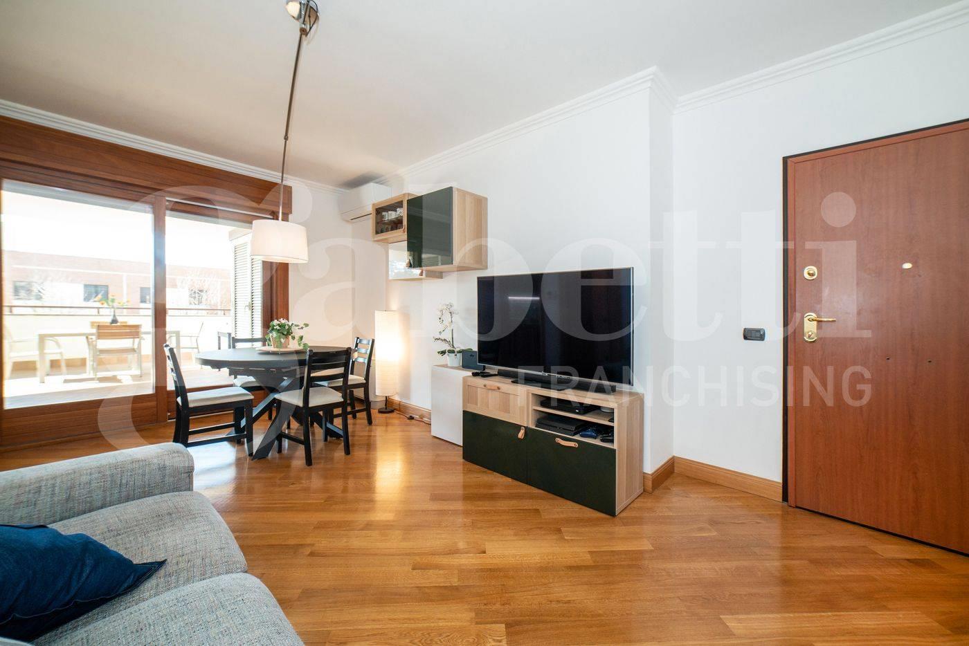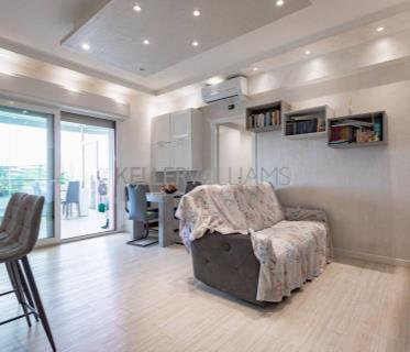 All’interno, ambienti luminosi e finiture di pregio creano un’atmosfera moderna e accogliente. L'immobile si compone di un ampio soggiorno con cucina separata, mentre la zona notte comprende una camera matrimoniale con accesso diretto al terrazzo, una seconda camera ideale come studio o cameretta e due bagni raffinati, uno con vasca idromassaggio e uno con doccia.