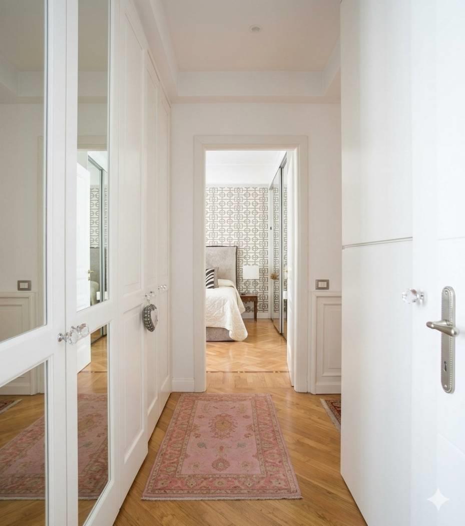 La distribuzione interna è stata studiata con grande cura: la zona giorno è separata dalla zona notte da una scenografica parete con porta a specchi, elemento architettonico che conferisce carattere e raffinatezza agli ambienti.