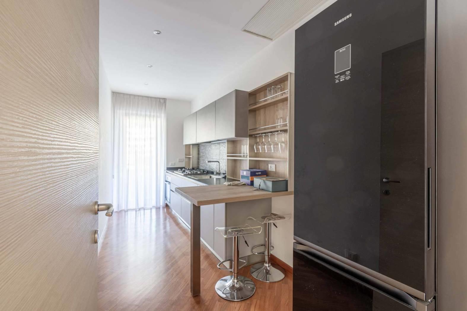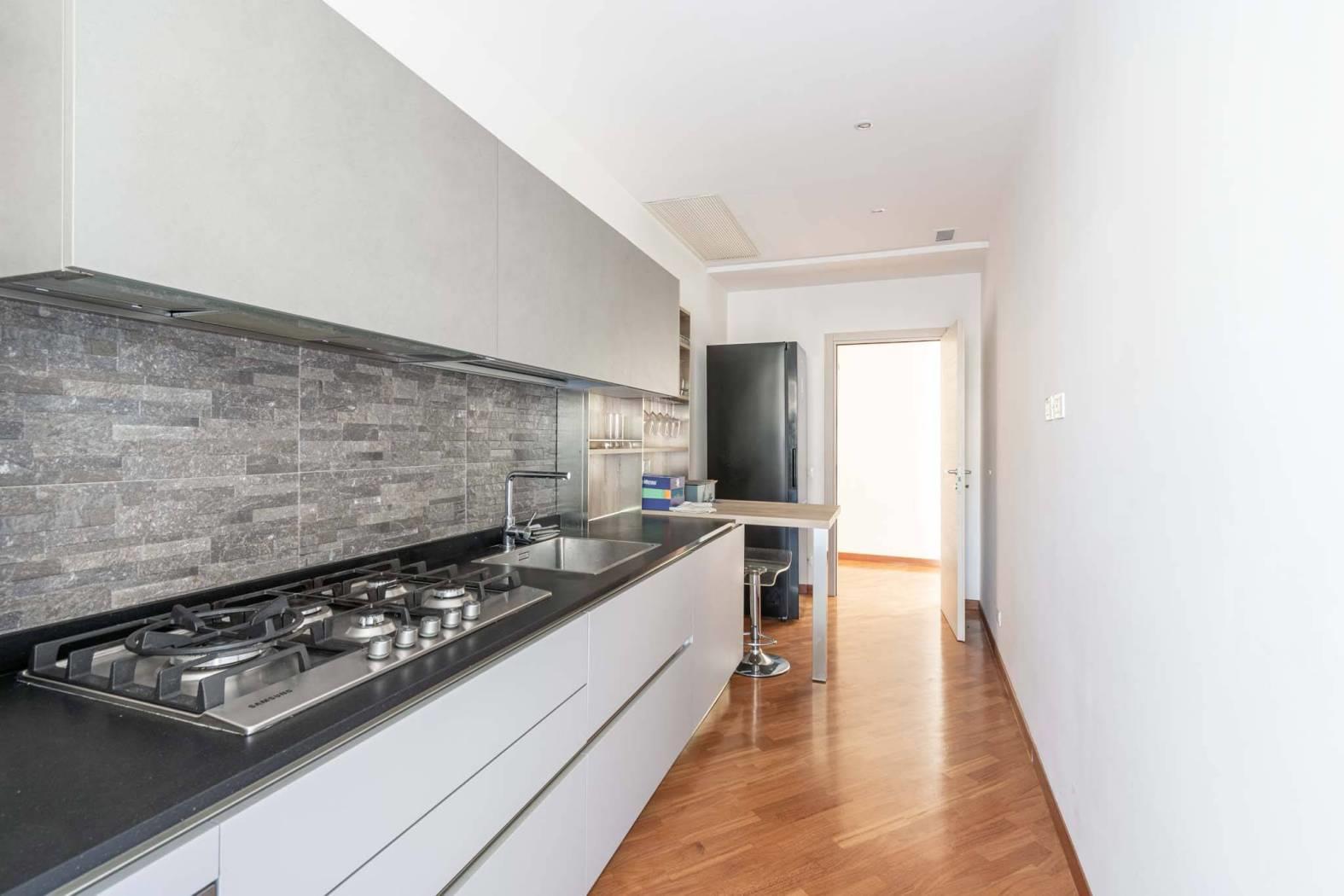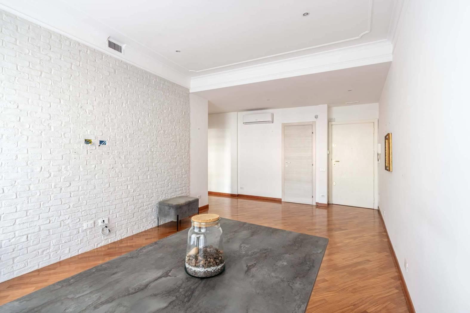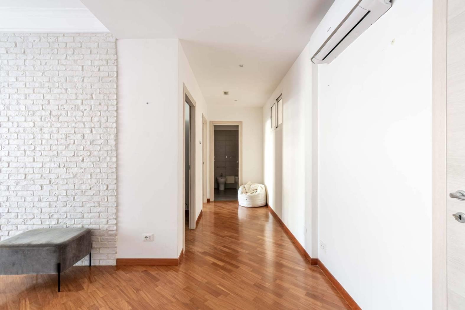Caratteristiche dell’appartamento: ampio salone con accesso diretto al terrazzo vivibile, camera matrimoniale spaziosa e silenziosa, cucina abitabile moderna e funzionale, bagno finestrato con buone finiture, grande disimpegno versatile e facilmente trasformabile in zona studio o contenitiva, terrazzo panoramico sul verde condominiale di circa 25 mq.