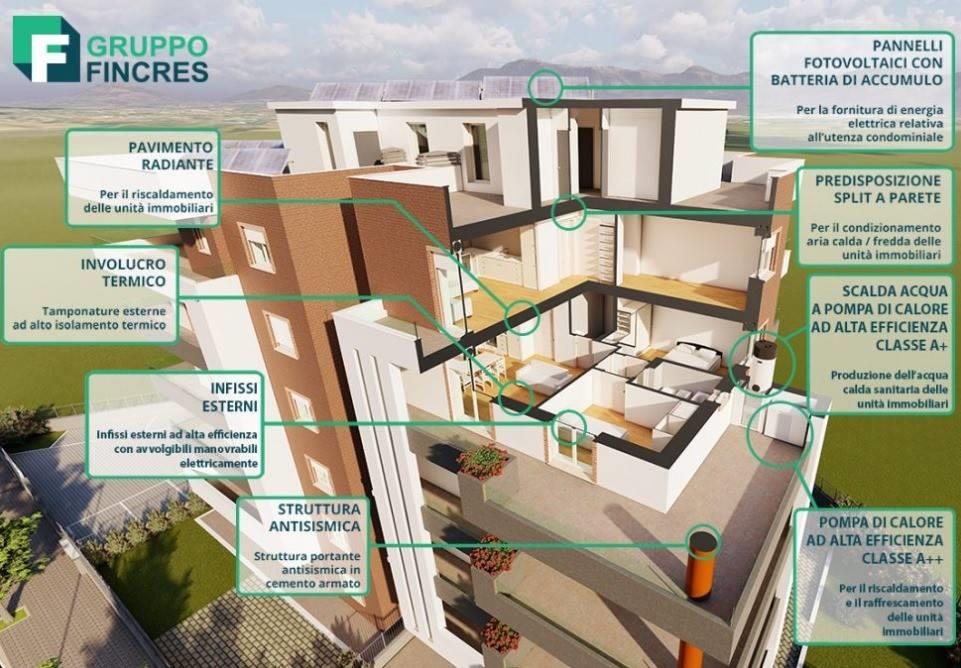 Le residenze sorgono a Guidonia, in una posizione strategica, perfettamente collegata e adiacente alla Via Tiburtina, in un contesto verde e ben servito. Qui, architettura moderna e comfort abitativo si incontrano in un progetto dal forte valore estetico e funzionale, realizzato in classe energetica A e dotato di impianti fotovoltaici condominiali, soluzioni tecniche all’avanguardia e materiali di alta qualità. Ogni edificio è stato progettato con struttura antisismica in calcestruzzo armato, isolamento termico di ultima generazione, riscaldamento a pavimento con pompa di calore e predisposizione per l’impianto di raffrescamento, offrendo così un’abitazione davvero efficiente, sicura e orientata al futuro.