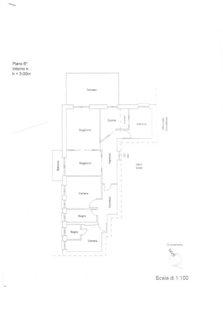 In sintesi, la distribuzione effettiva degli spazi interni si articola in: un soggiorno doppio, una cucina abitabile, tre camere e due bagni, oltre al terrazzo e al balcone.