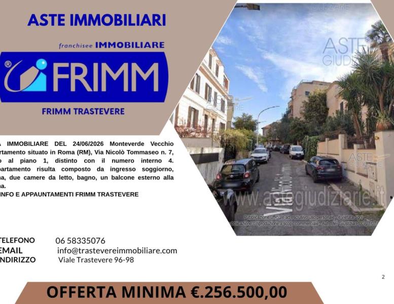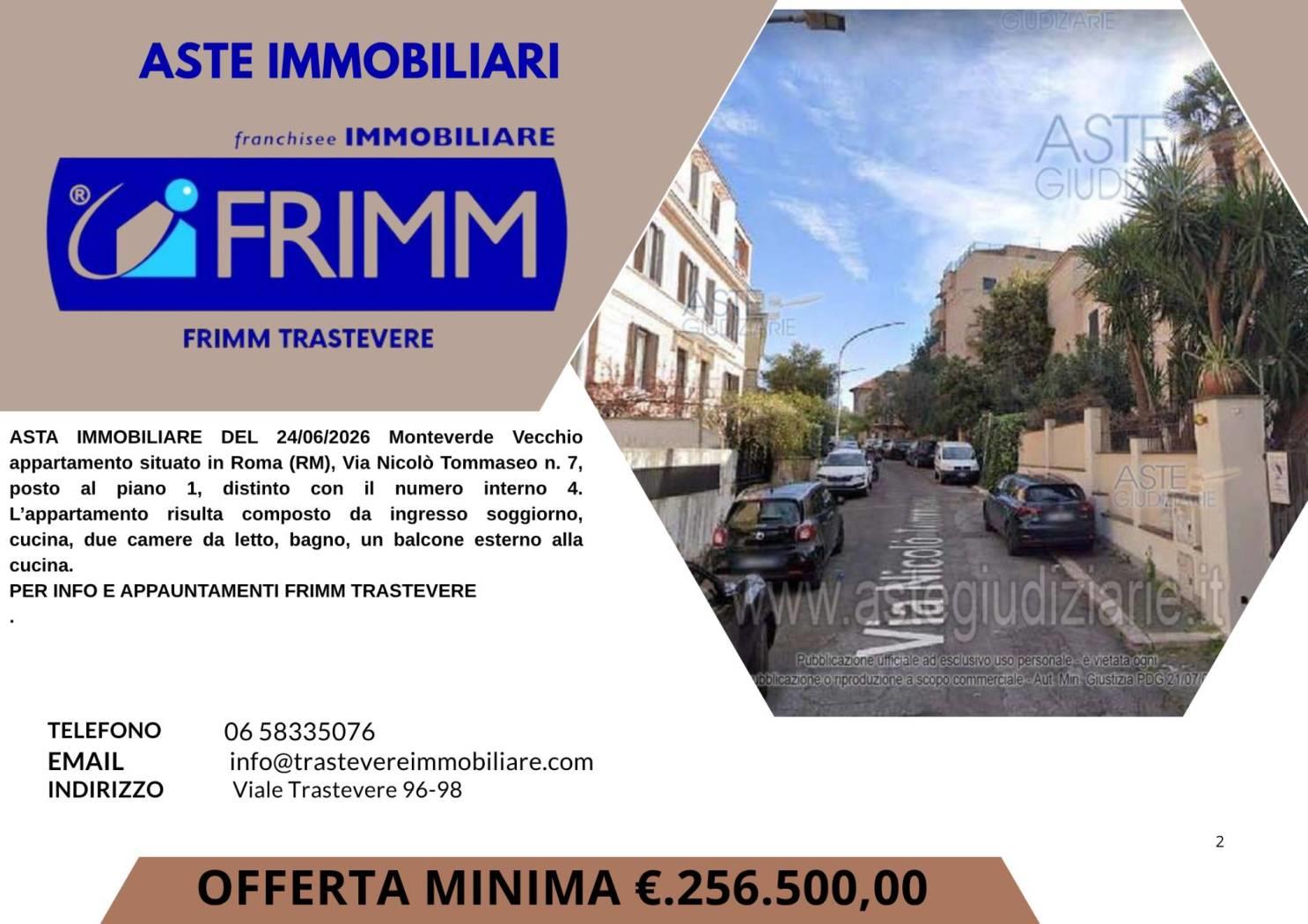 MONTEVERDE VECCHIO ASTA IMMOBILIARE DEL 24/06/2026 Appartamento situato in Roma, Via Nicolò Tommaseo n. 7, all'interno di un edificio residenziale costruito nel 1956. La zona è prettamente residenziale, con edifici di altezza contenuta e giardini condominiali. Via Nicolò Tommaseo è una strada a senso unico, prevalentemente ad uso dei residenti.