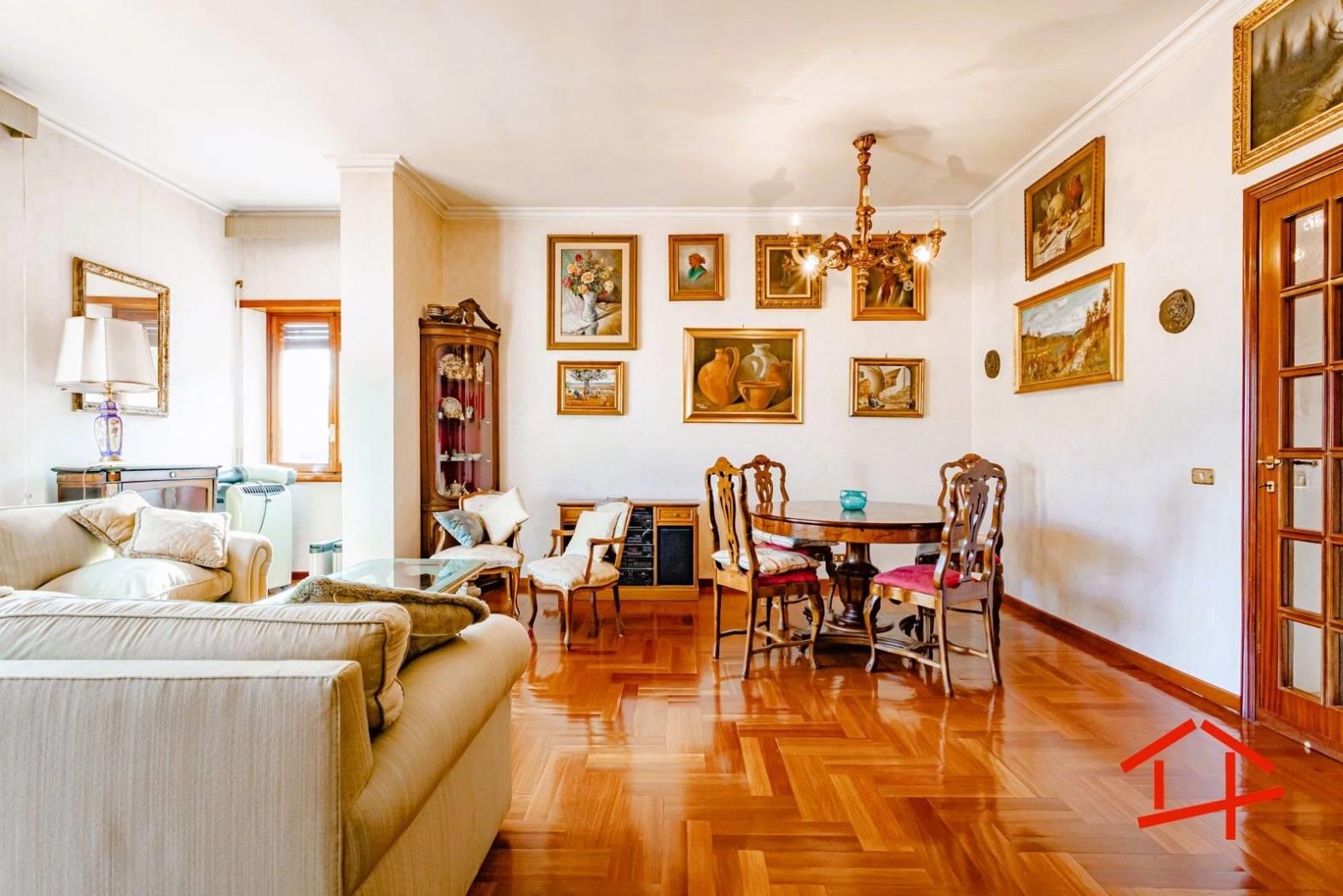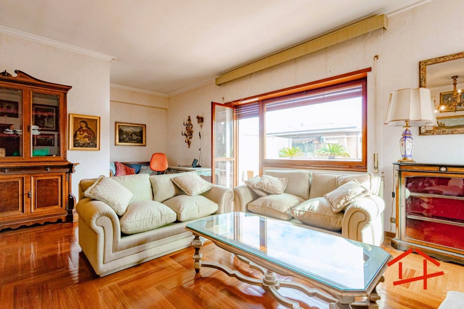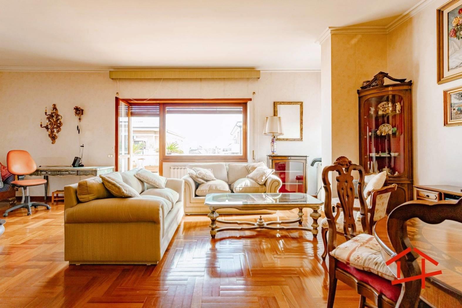 All'interno l'immobile si compone di salone doppio con accesso al terrazzo panoramico, cucina separata, funzionale e ben distribuita, con doppio accesso sia dalla zona living che dal corridoio, quattro camere da letto e doppi servizi finestrati.