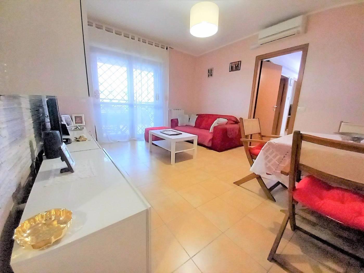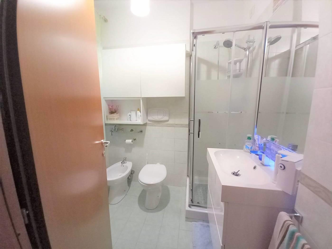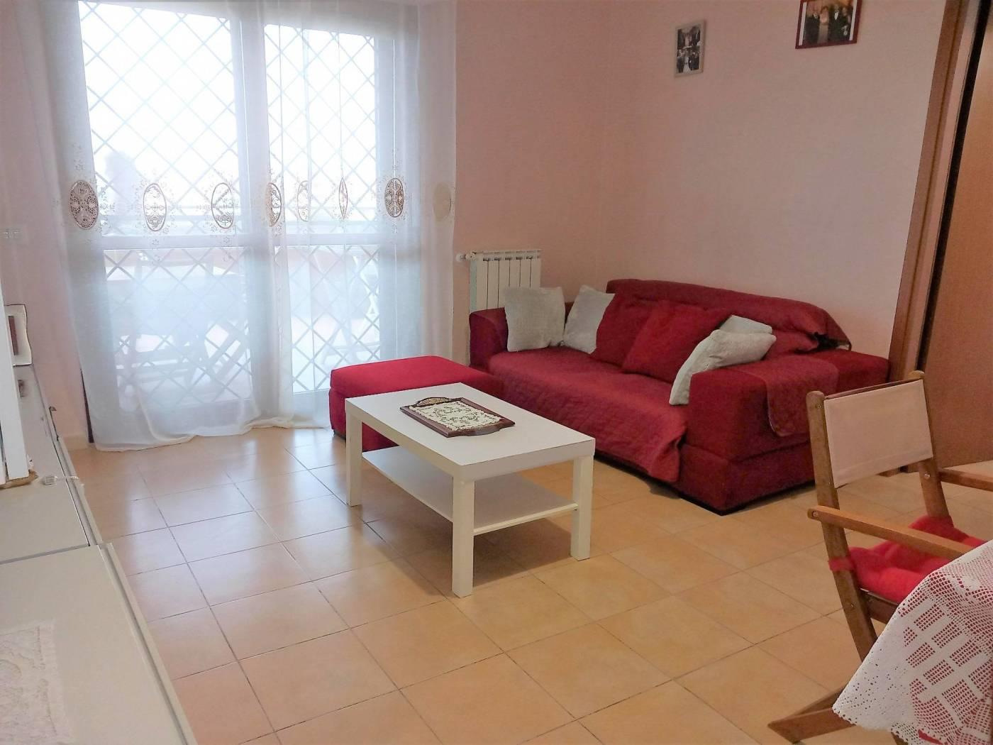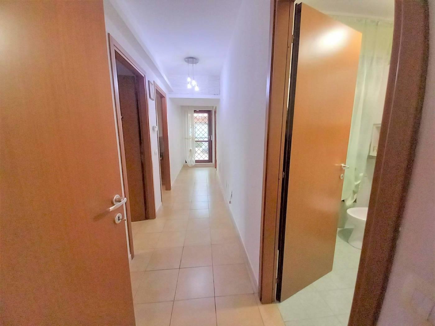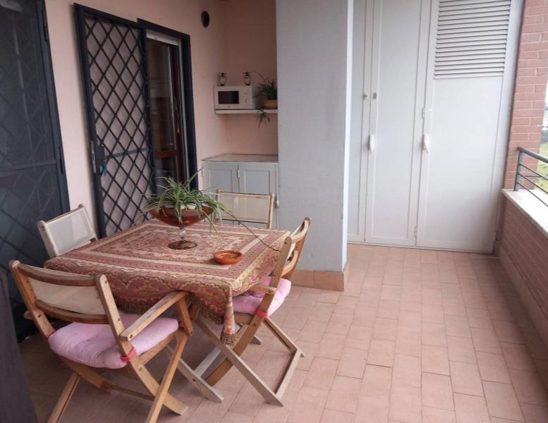 L' appartamento è composto da: ingresso, cucina semi abitabile, soggiorno comodo, corridoio, 2 camere spaziose, doppi servizi entrambi finestrati, uno con box doccia e uno con vasca. Due comodi terrazzi donano luce all'immobile e rendono la permanenza piacevolissima, essendo sfruttabili per buona parte dell'anno: uno è coperto, vi si accede dalla cucina e dal soggiorno, affaccia sulla vallata retrostante la palazzina e permette di assistere ad incantevoli tramonti, è inoltre dotato di armadiatura in alluminio da esterno che ospita la lavatrice e l'asciugatrice; l'altro terrazzo ha accesso dalla fine del corridoio, è semicoperto e molto soleggiato, solitamente funge da solarium e può ospitare una piscina per bambini.