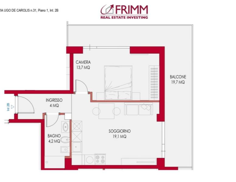 L’appartamento, di circa 49 mq commerciali, si trova al primo piano di una palazzina signorile con ascensore e servizio di portineria attivo tutto il giorno.