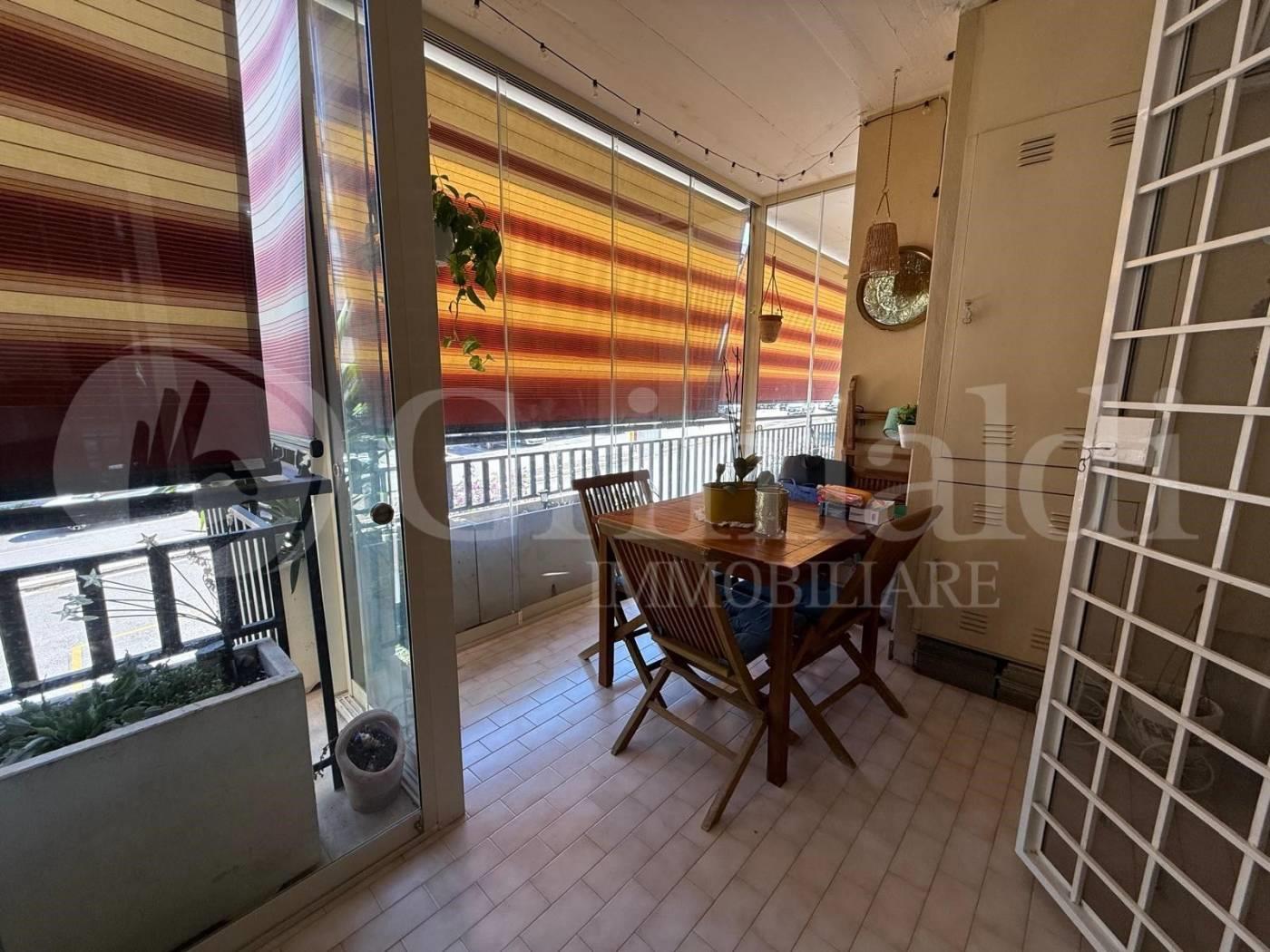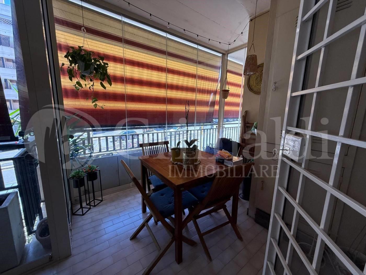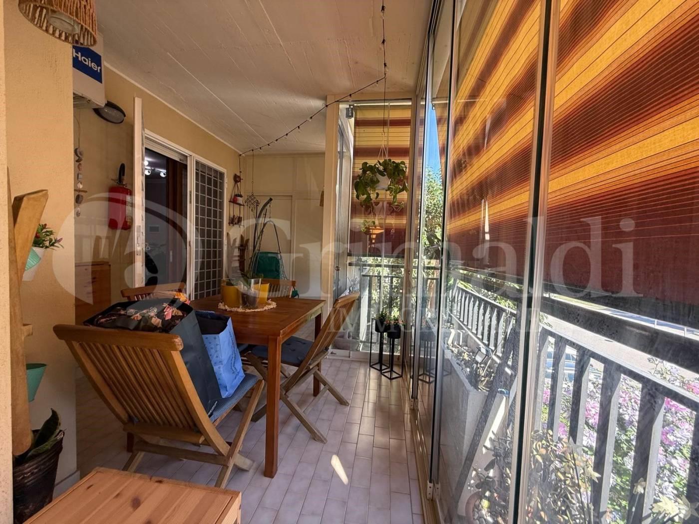 L'ampia balconata ad "L" abbraccia l'intero appartamento, creando un ambiente luminoso e arioso.