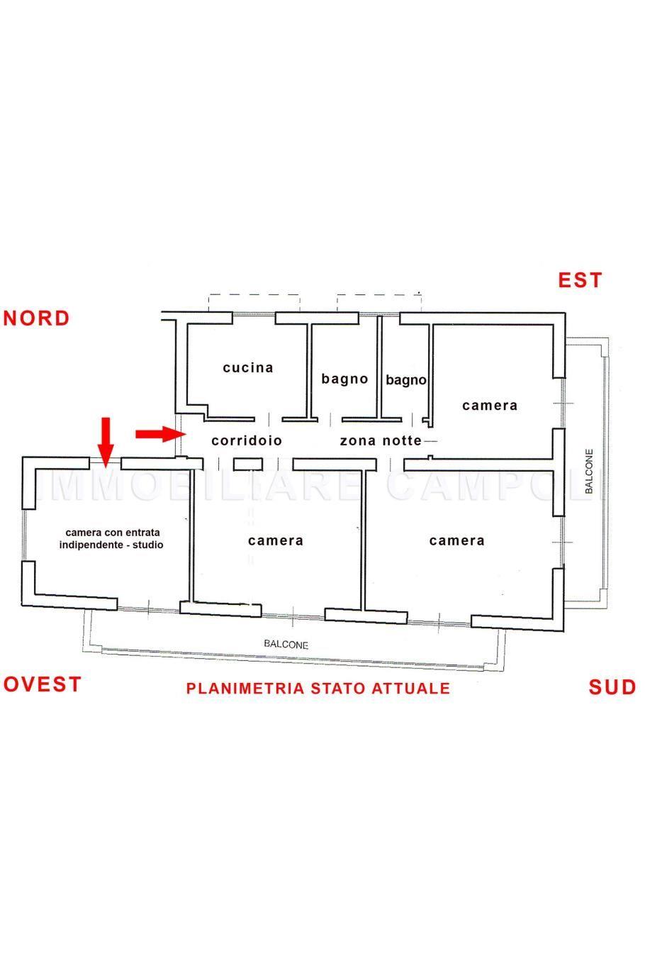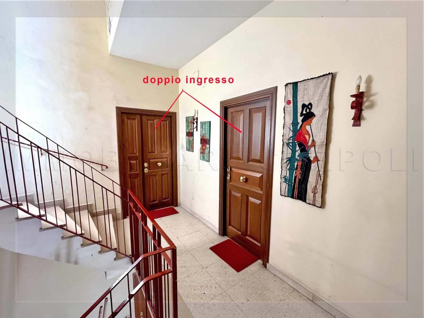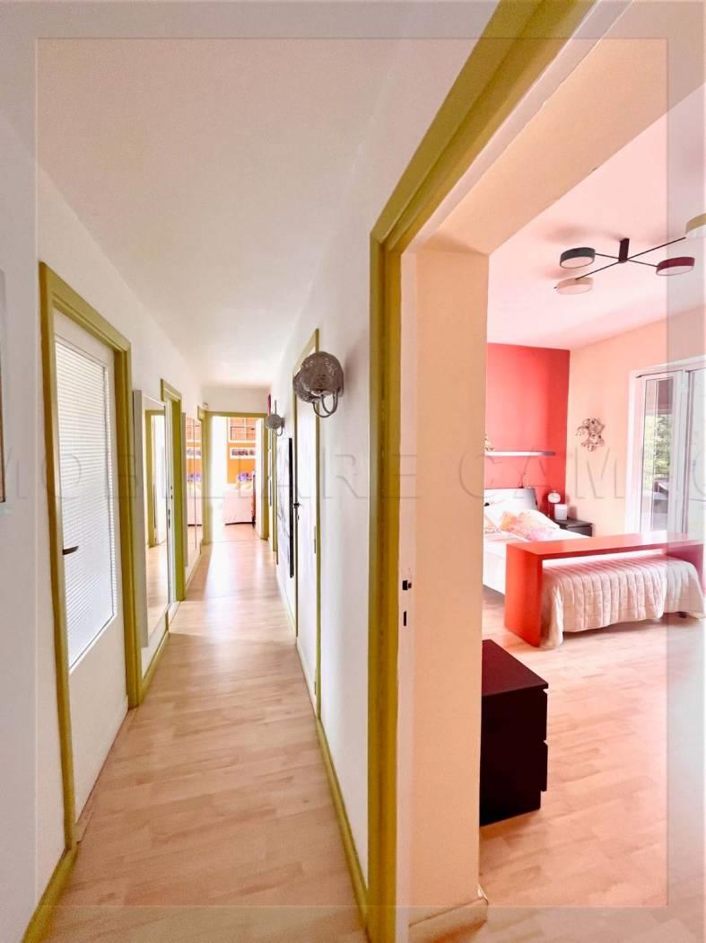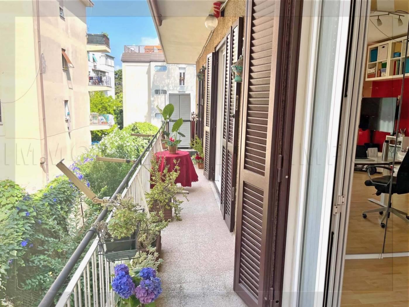 Ha una superficie di 120 mq commerciali come da scheda catastale, circa 100 mq calpestabili interni misurati. La sua composizione attuale è: Lungo corridoio centrale, ampio soggiorno, 2 camere, cucina abitabile di 9 mq, 2 bagni entrambi con finestra (uno con doccia ed uno con vasca). Altra camera di 16 mq con entrata indipendente. La casa è abbracciata su due lati da 2 balconi accessibili da tutte le stanze presenti nell’immobile. Metratura, doppi ingressi e pianta rettangolare con affacci su 4 lati, permettono a questo immobile di poter essere trasformato per molteplici soluzioni (2 appartamenti, appartamento + ufficio/studio ecc).