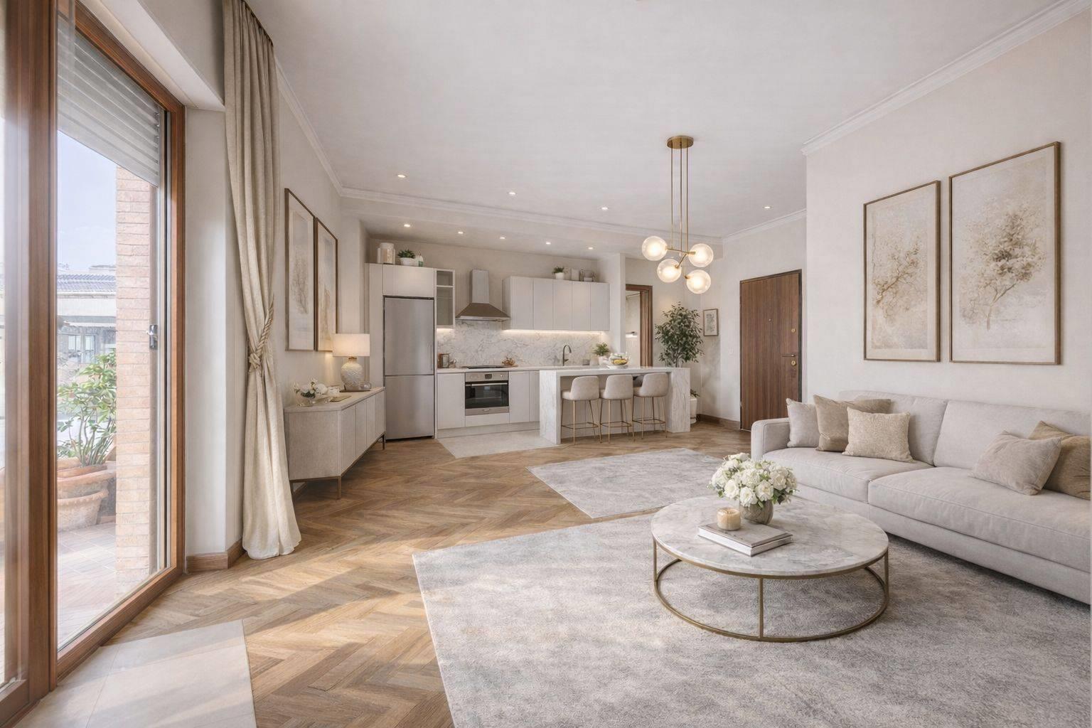 L’appartamento si presenta allo stato originale, fatta eccezione per gli impianti idrico ed elettrico ristrutturati nel 2013, ed è accessoriato di porta blindata, pavimentazione in parquet a spina di pesce, faretti a LED ed infissi in vetro e legno.