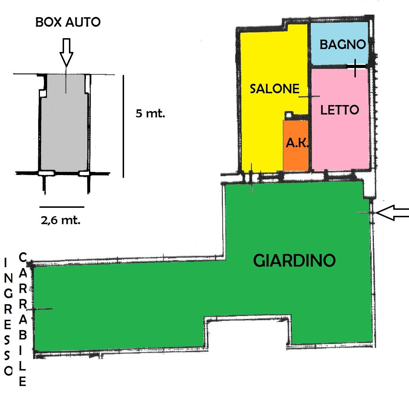 Completa la proprietà un comodo box auto di 13 mq (nella planimetria presente nell'annuncio sono raffigurate le dimensioni reali).