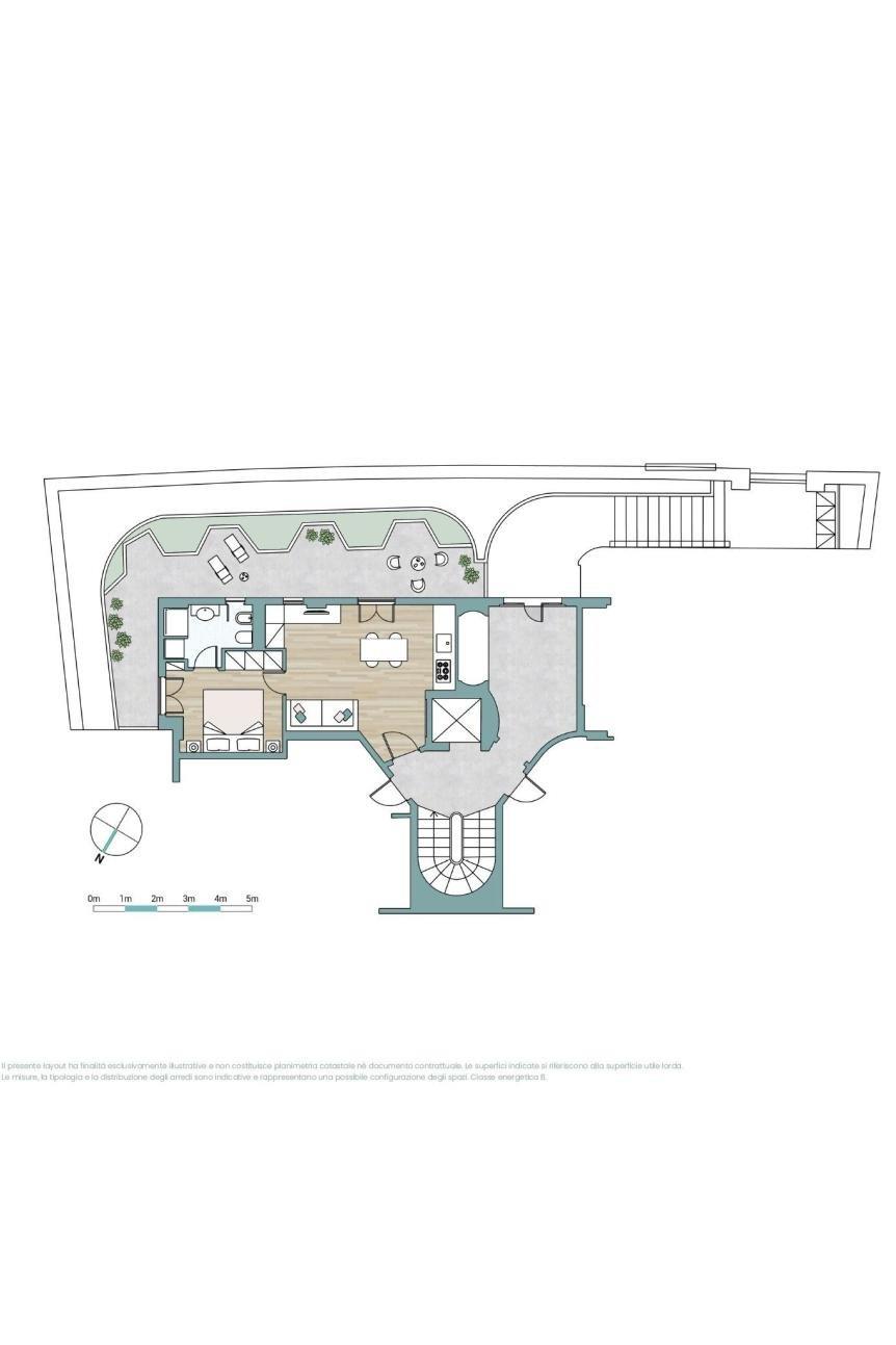 Questa unità compatta e funzionale, è composta da un salone ben organizzato, una camera da letto riservata e tranquilla, un bagno dal layout contemporaneo. La proprietà viene completata da un grandissimo giardino privato, che diventa una vera estensione degli interni e rappresenta il fulcro dell'appartamento.