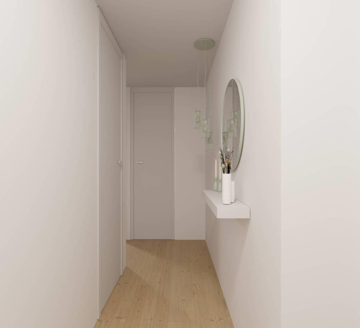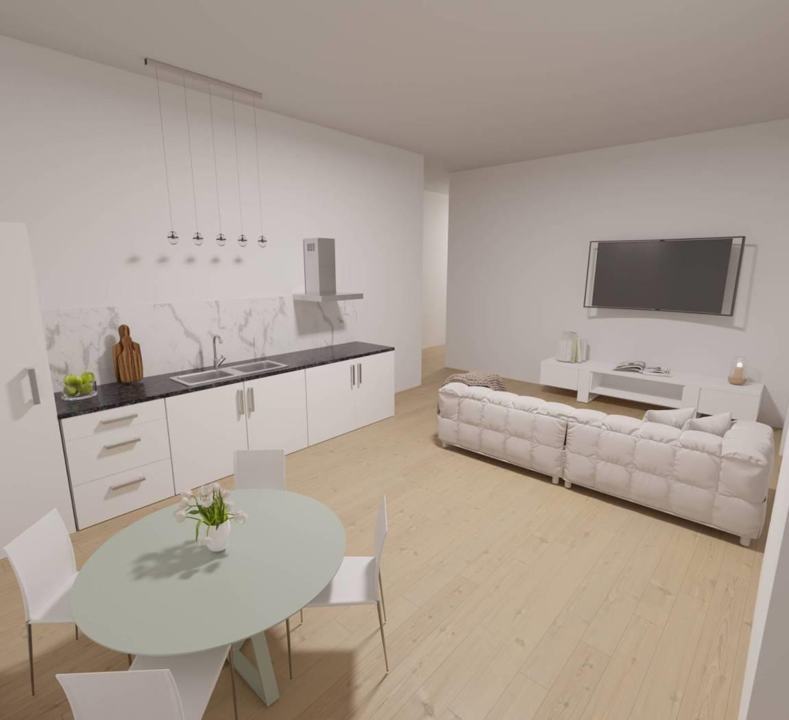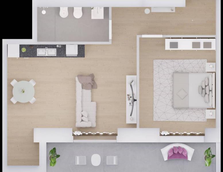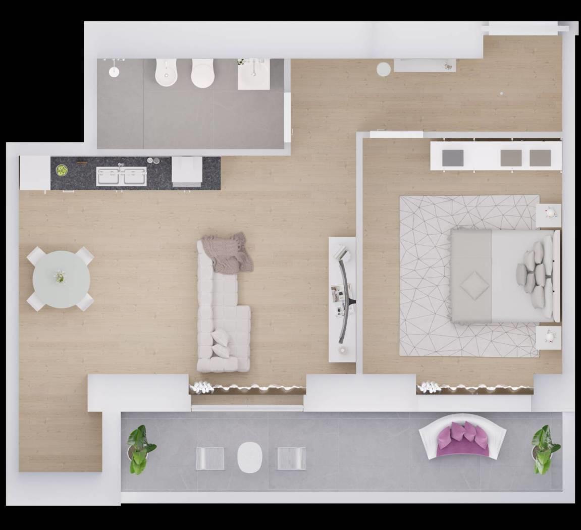 L’appartamento, di 45 mq con un balcone vivibile di 8,2 mq, si compone di un ingresso che porta a un bagno, una luminosa camera matrimoniale e una zona giorno con cucina a vista progettata per ottimizzare al massimo gli spazi.