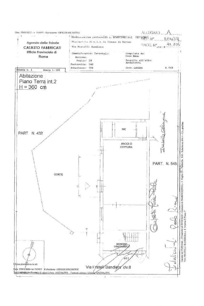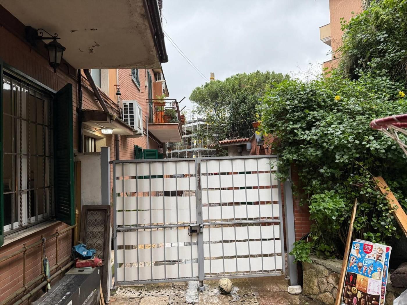 L'accesso all'appartamento avviene da cancello carrabile fronte strada adiacente il plesso scolastico Spigarelli, una volta entrati nella corte di proprietà esclusiva si trova un portico in legno a protezione della porta blindata di accesso e della finestra della cucina, sotto il portico è posizionato anche lo scaldabagno elettrico per la produzione di acqua calda sanitaria.