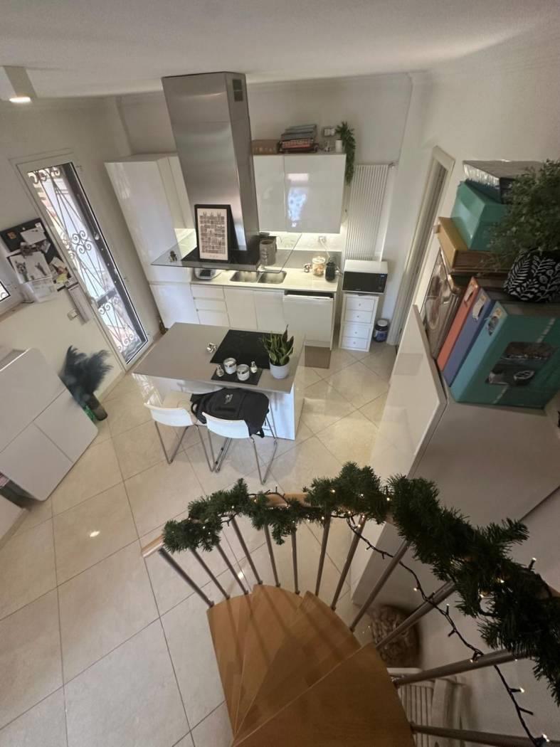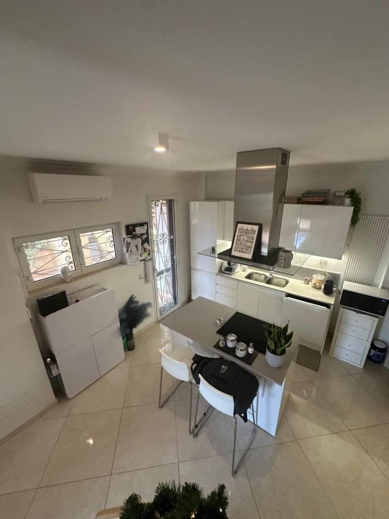 Internamente l’appartamento si apre su un soggiorno luminoso con cucina a vista moderna, ben organizzata e rifinita con gusto contemporaneo. Al piano è presente un bagno, comodo per la zona giorno.