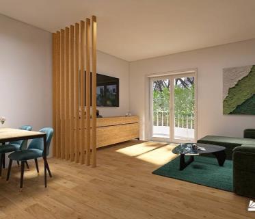 L’abitazione è posta al terzo piano, senza ascensore, internamente composta da un ingresso, un soggiorno, una cucina a vista con antistante un balcone, una camera da letto matrimoniale con cabina armadio ed antistante un altro balcone, un bagno finestrato con doccia ed un ripostiglio.