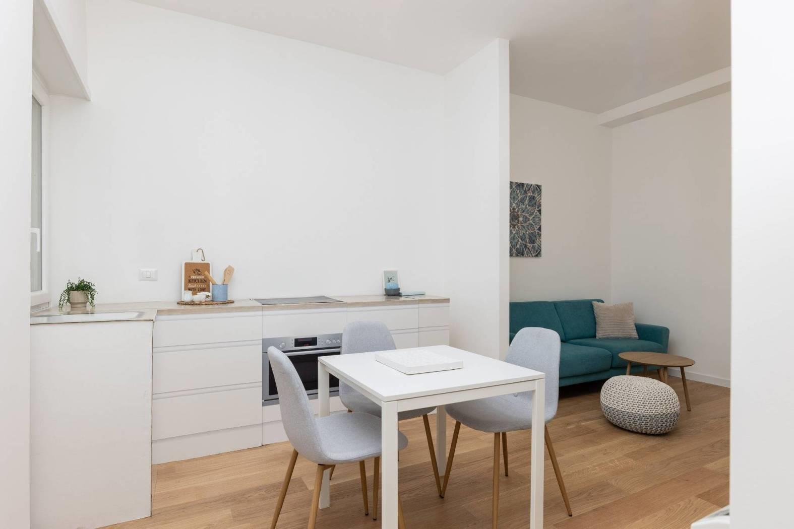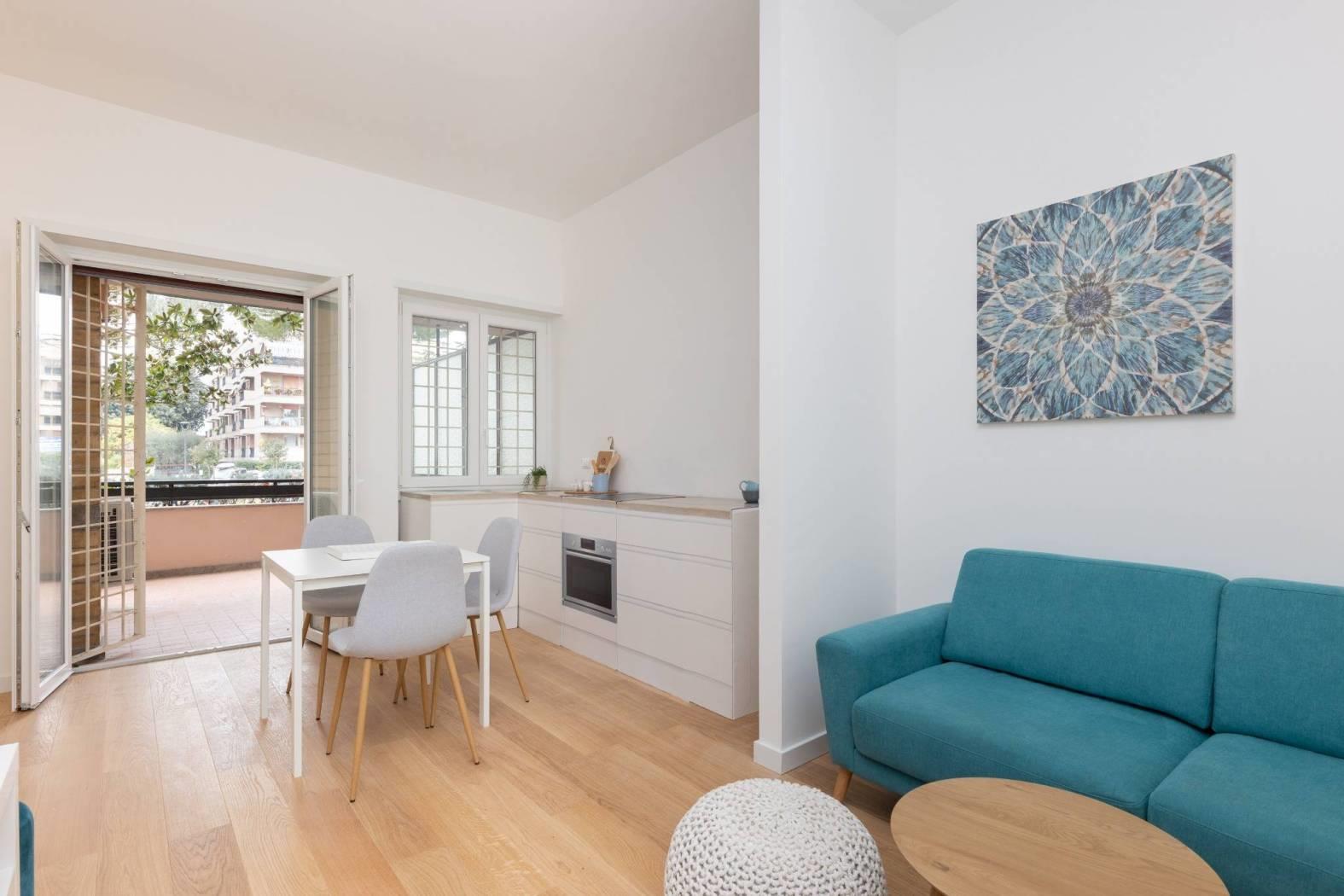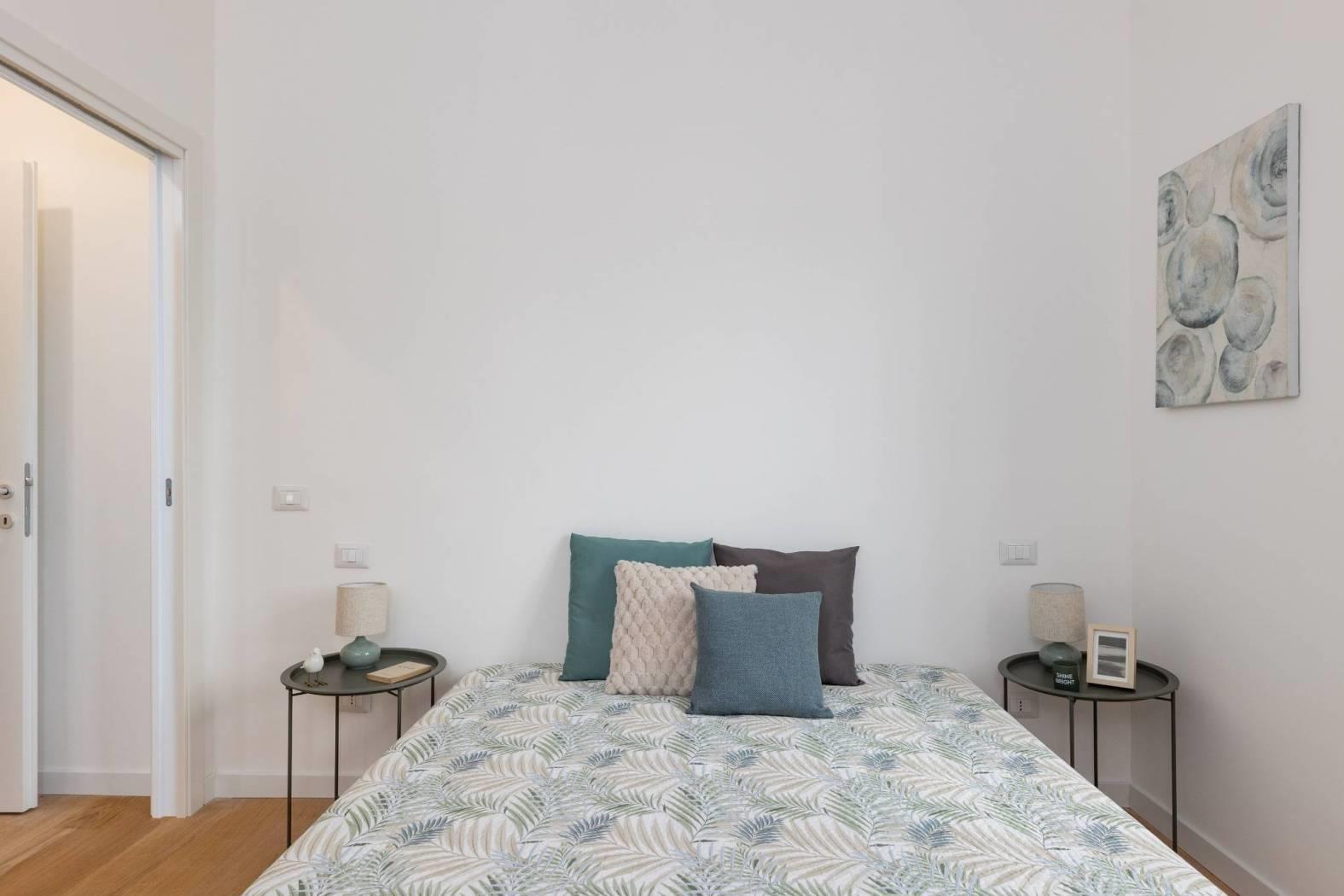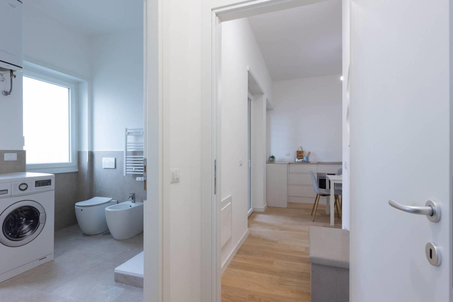In comprensorio immerso nel verde con servizio di portineria, proponiamo la vendita di un appartamento posto al 1° piano completamente ristrutturato e mai abitato. Questo bilocale si estende su una superficie di 52 mq commerciali con esposizione a Ovest ed è così composto: ingresso, soggiorno con angolo cottura (predisposizione per piano cottura ad induzione), camera matrimoniale, bagno arredato con finestra (con finiture di qualità) e terrazzo di 11 mq.