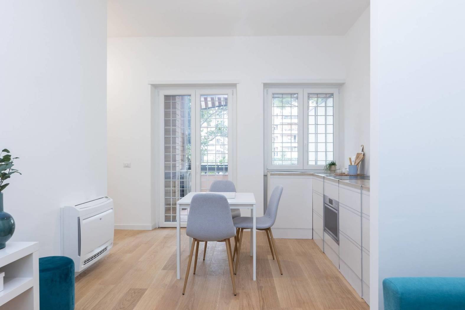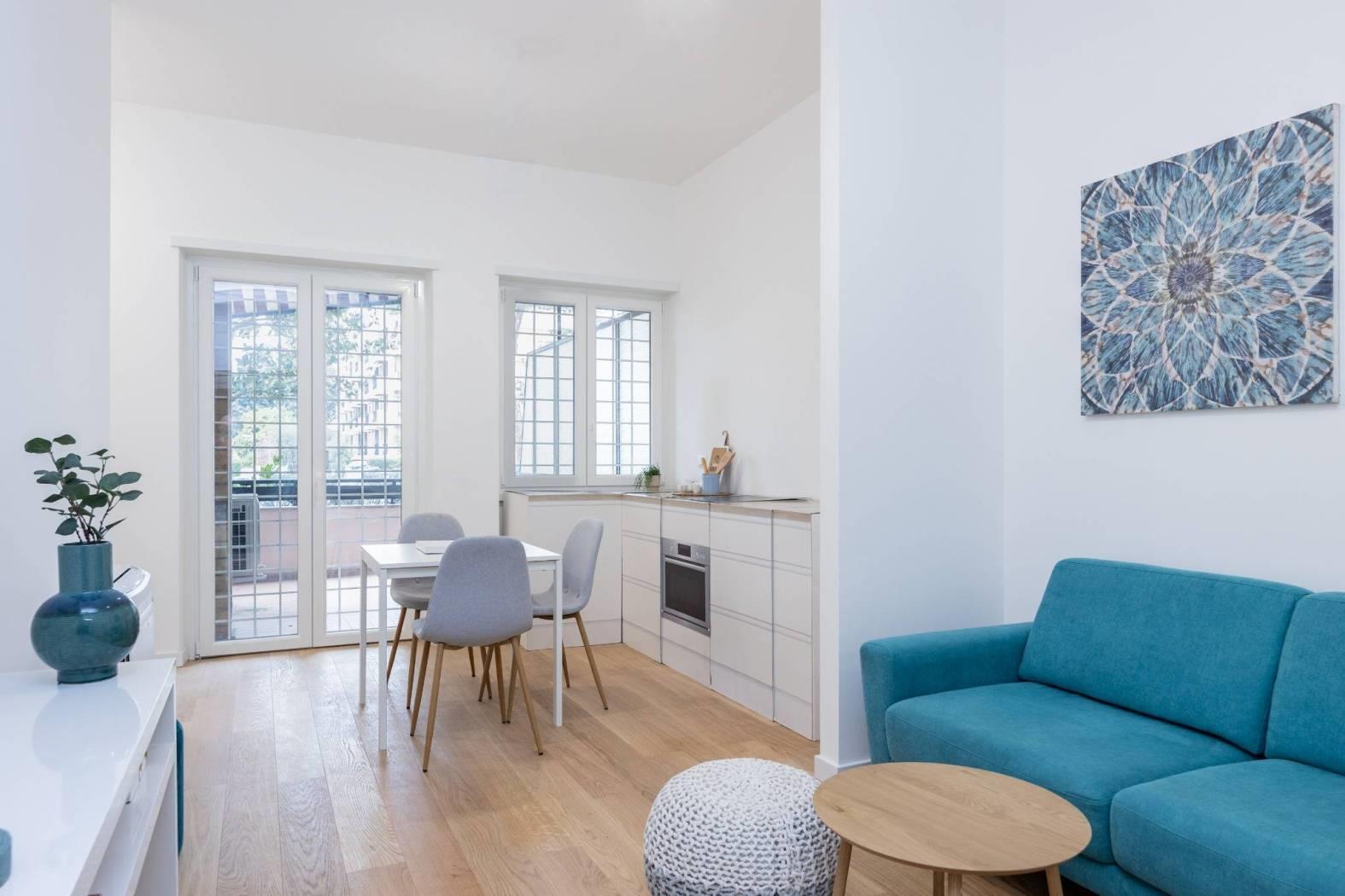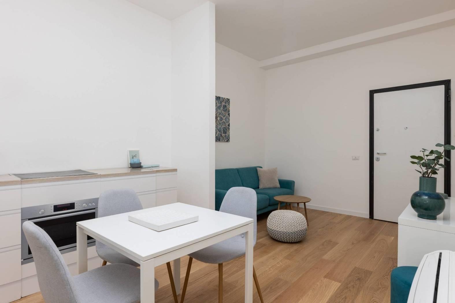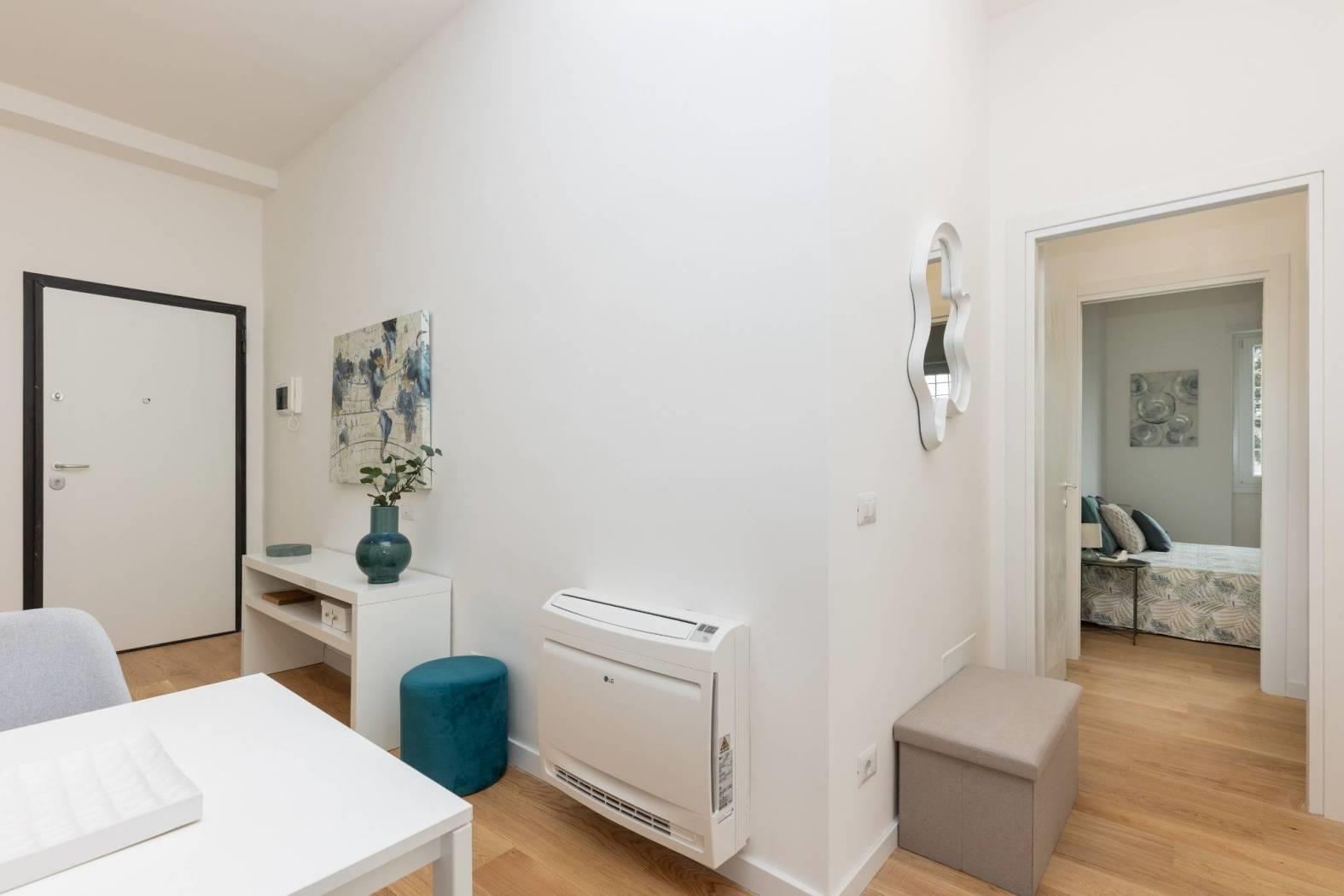 In comprensorio immerso nel verde con servizio di portineria, proponiamo la vendita di un appartamento posto al 1° piano completamente ristrutturato e mai abitato. Questo bilocale si estende su una superficie di 52 mq commerciali con esposizione a Ovest ed è così composto: ingresso, soggiorno con angolo cottura (predisposizione per piano cottura ad induzione), camera matrimoniale, bagno arredato con finestra (con finiture di qualità) e terrazzo di 11 mq.