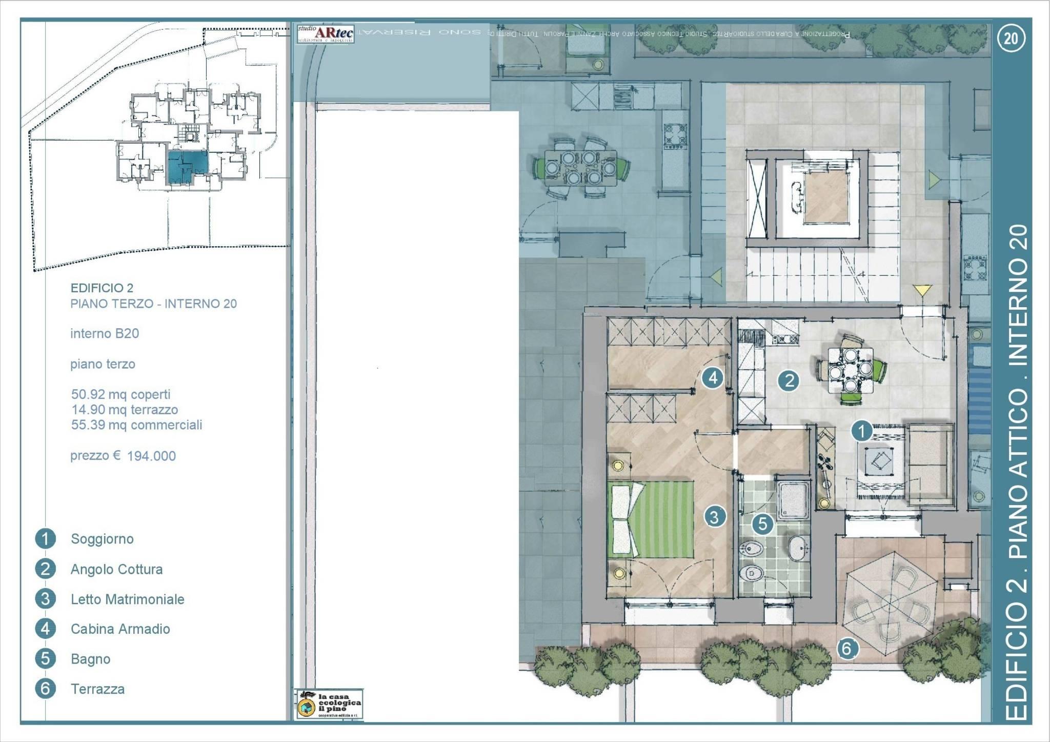 Due edifici da 21 appartamenti ciascuno da 50 a 80 mq, con soggiorno e 1 o 2 camere e 1 o 2 bagni, con ampi terrazzi e box.