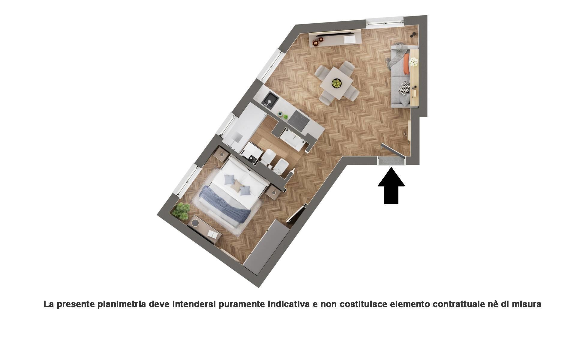 L’immobile è composto da ingresso soggiorno con cucina a vista disimpegno camera matrimoniale servizio finestrato.