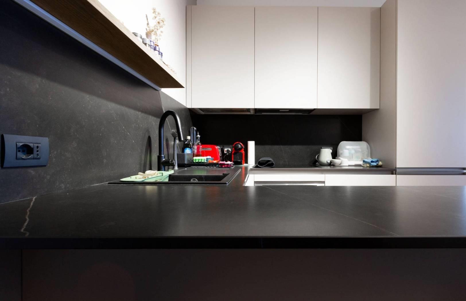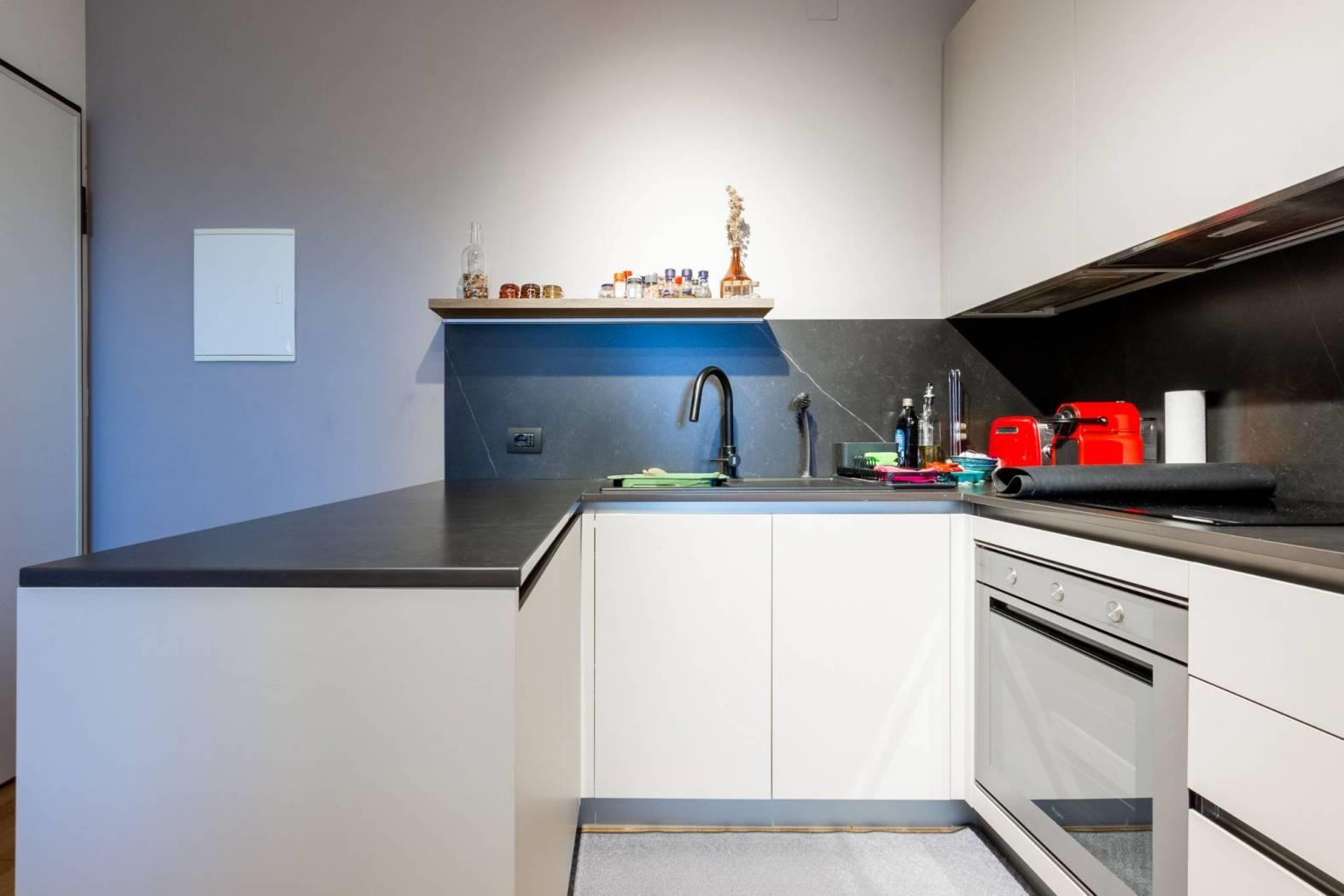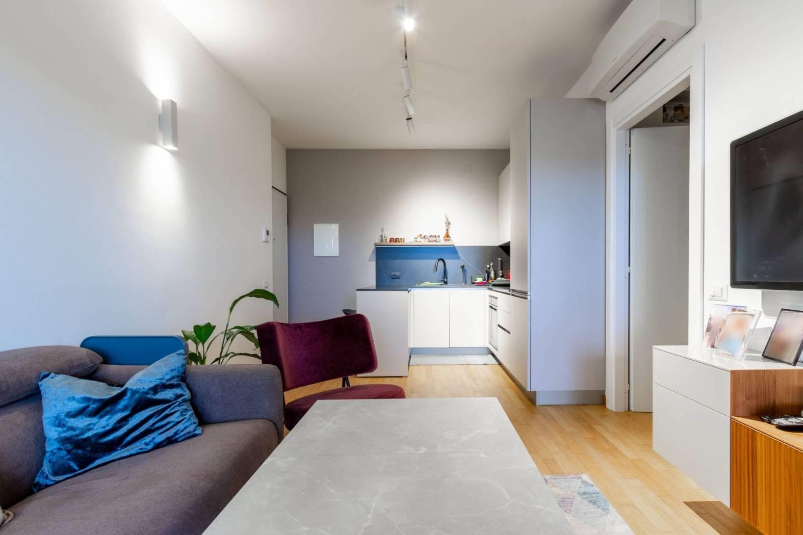 Varcando la soglia, si viene accolti da un soggiorno a vista con angolo cottura, uno spazio armonioso e ben organizzato dove ogni elemento è stato studiato con attenzione.