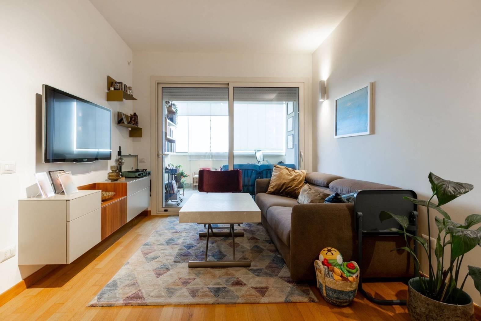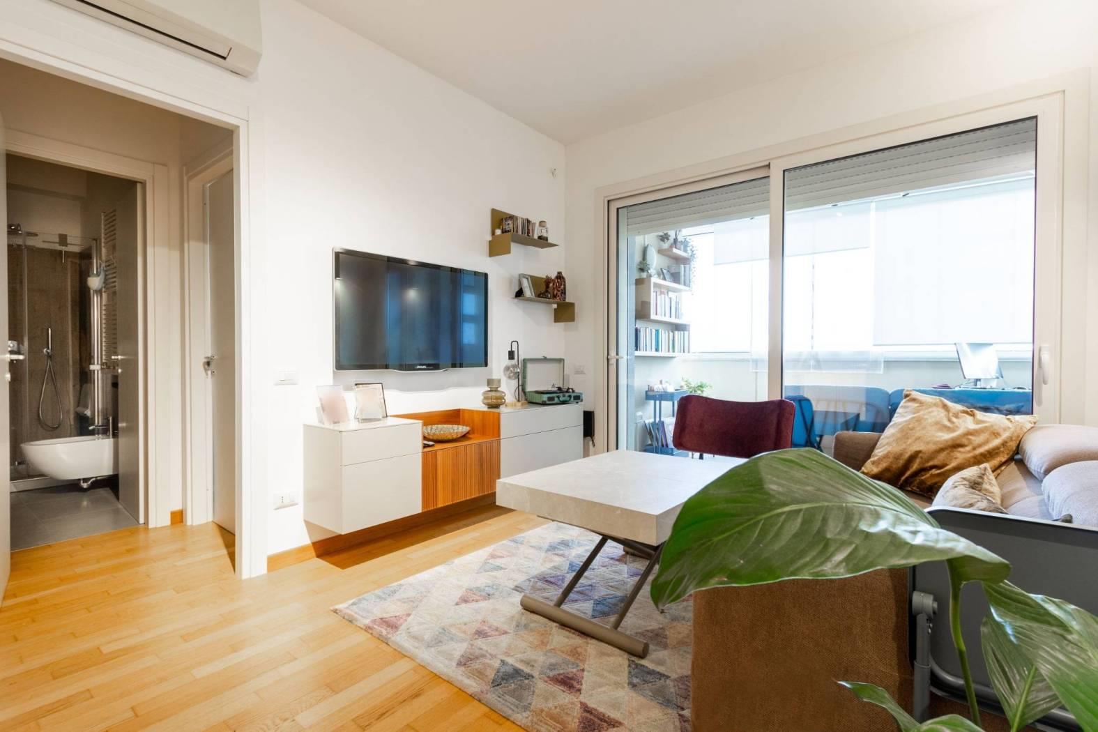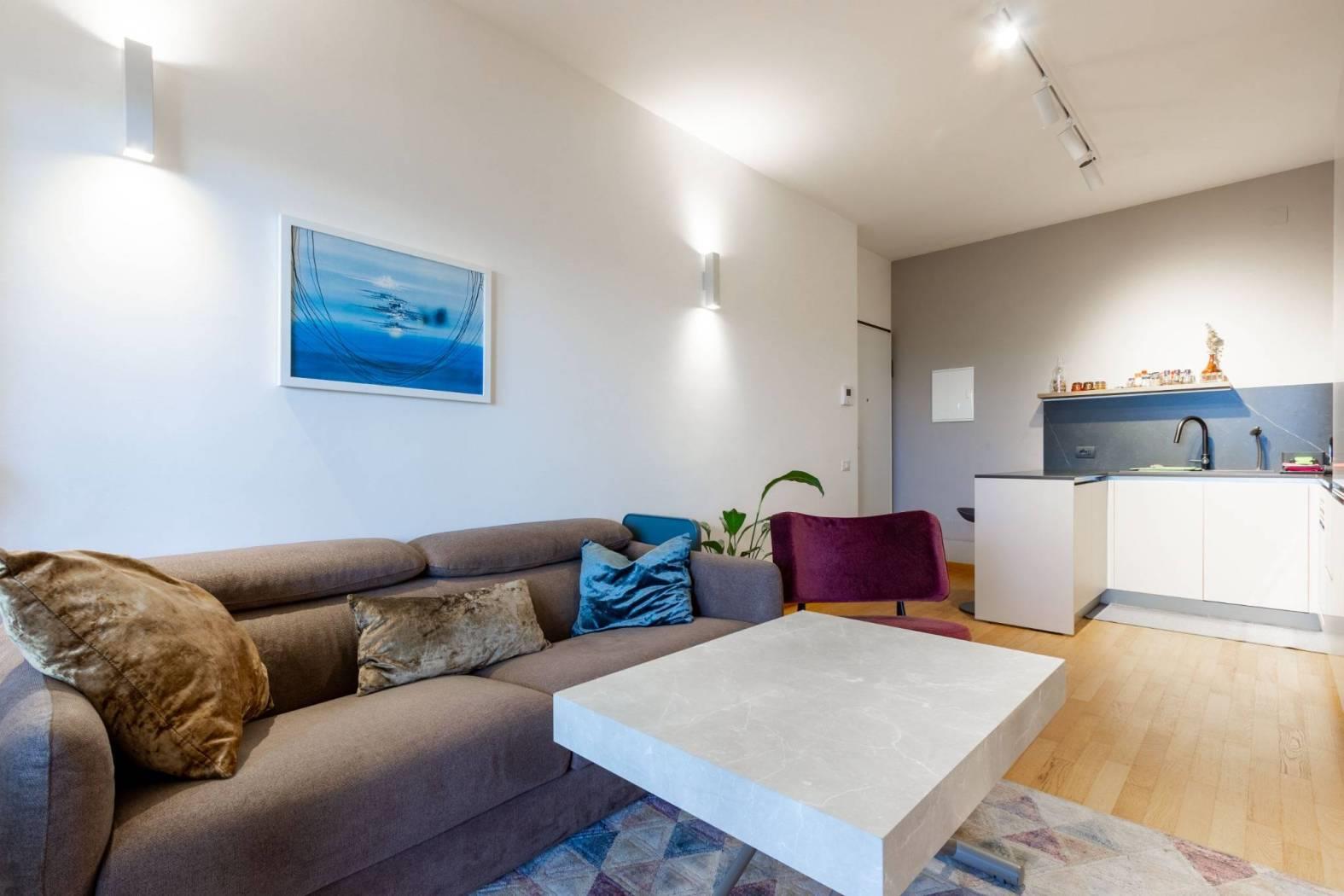Varcando la soglia, si viene accolti da un soggiorno a vista con angolo cottura, uno spazio armonioso e ben organizzato dove ogni elemento è stato studiato con attenzione.