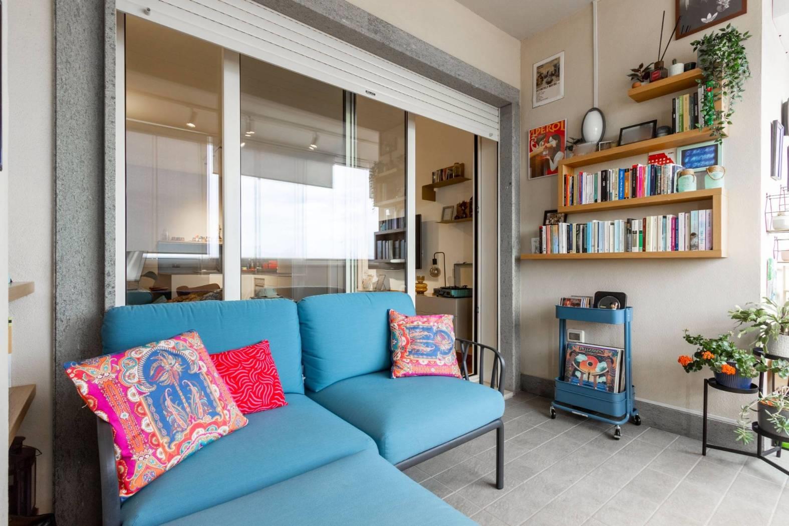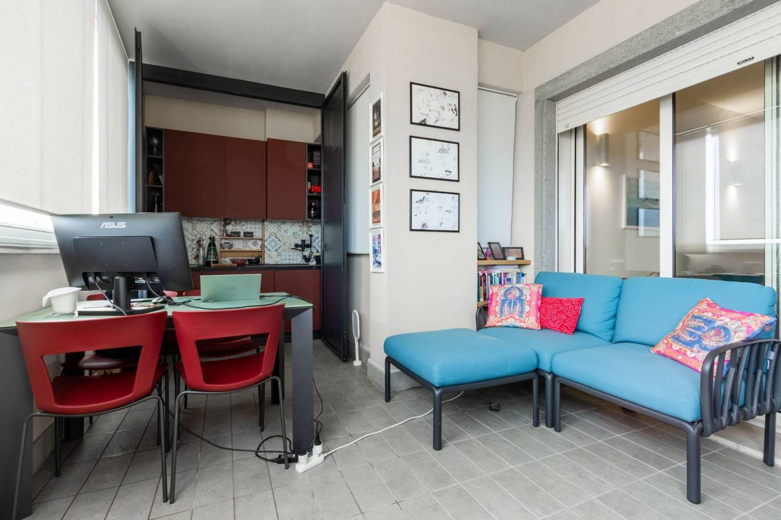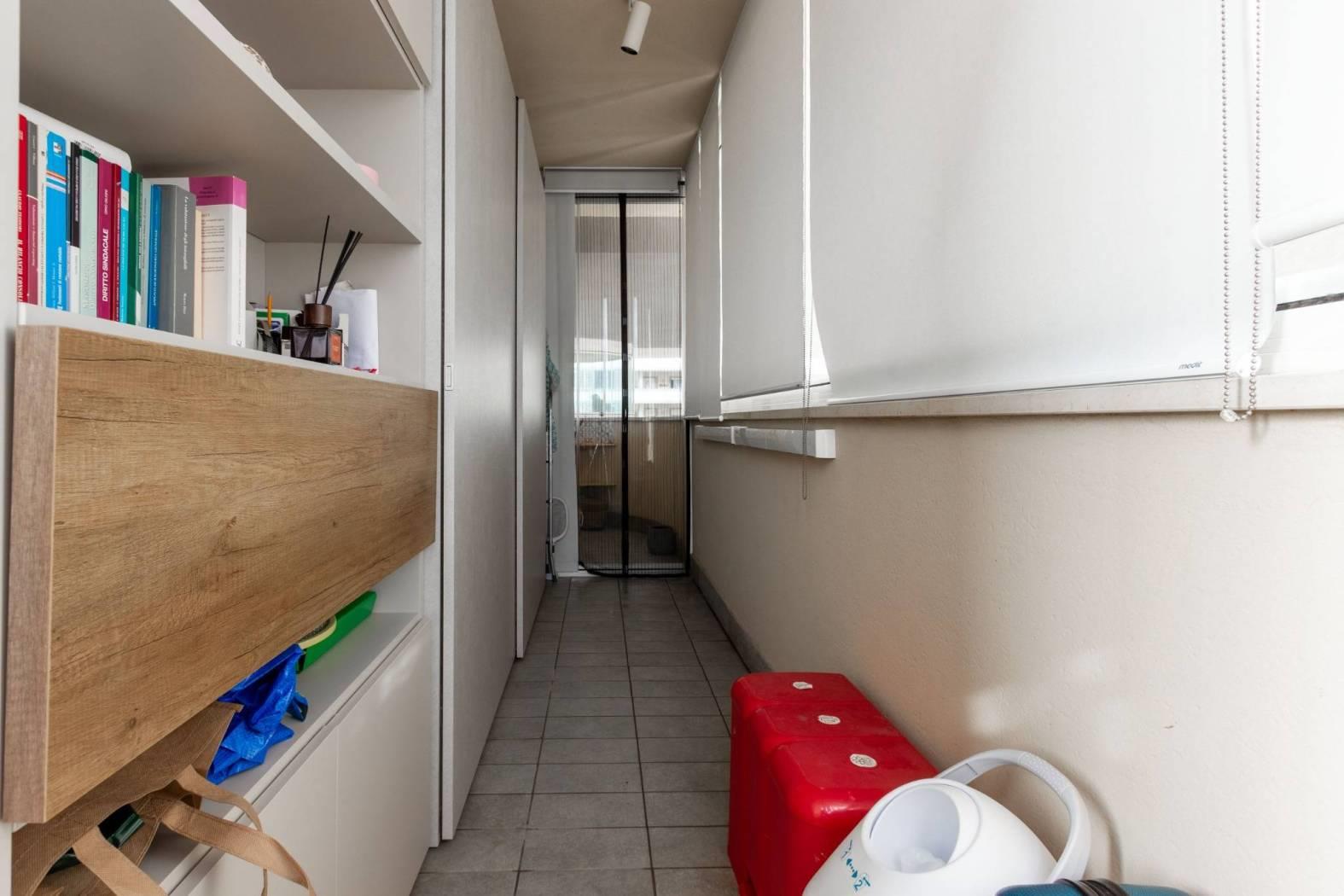 La zona giorno si apre su un terrazzo dotato di vetrate Total View, che regalano una continuità visiva verso l’esterno e amplificano la percezione dello spazio e della luce. A protezione delle vetrate sono presenti tende a rullo esterne, ideali per schermare dal sole e garantire comfort e privacy, rendendo il terrazzo uno spazio vivibile in ogni stagione.