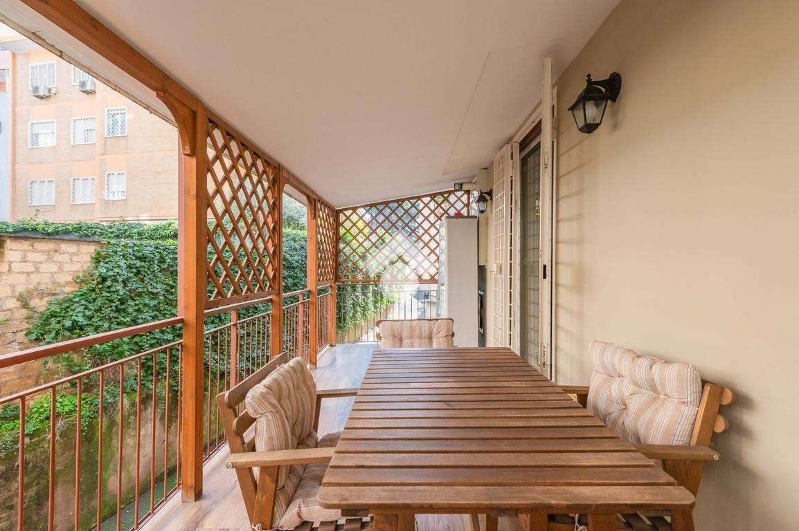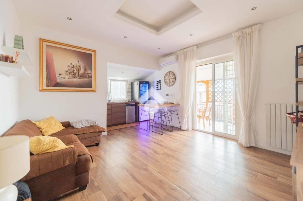 L’immobile è composto da un ampio e luminoso soggiorno con angolo cottura a vista, ambiente moderno e funzionale, con accesso diretto al terrazzo abitabile, ideale per pranzi e cene all’aperto: lo spazio consente comodamente un tavolo per 6 persone.