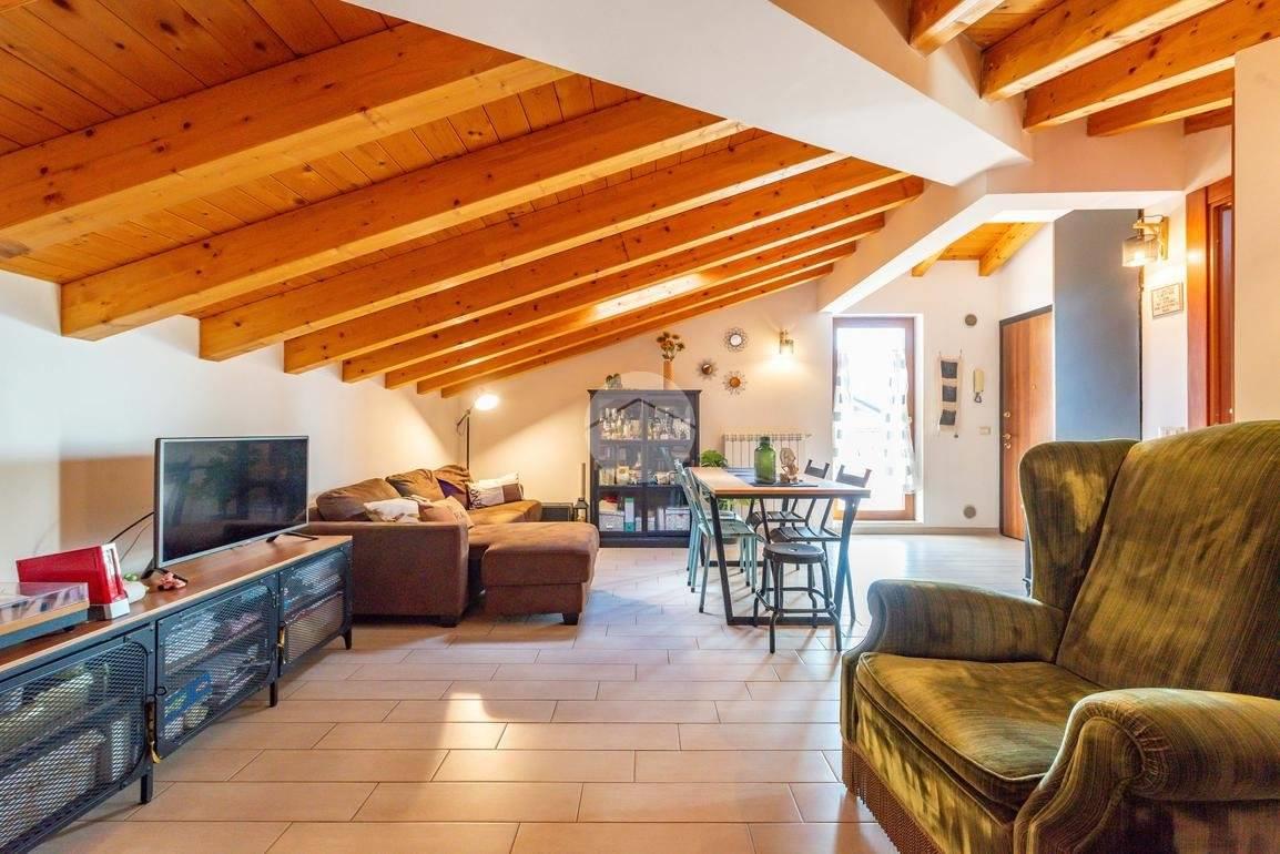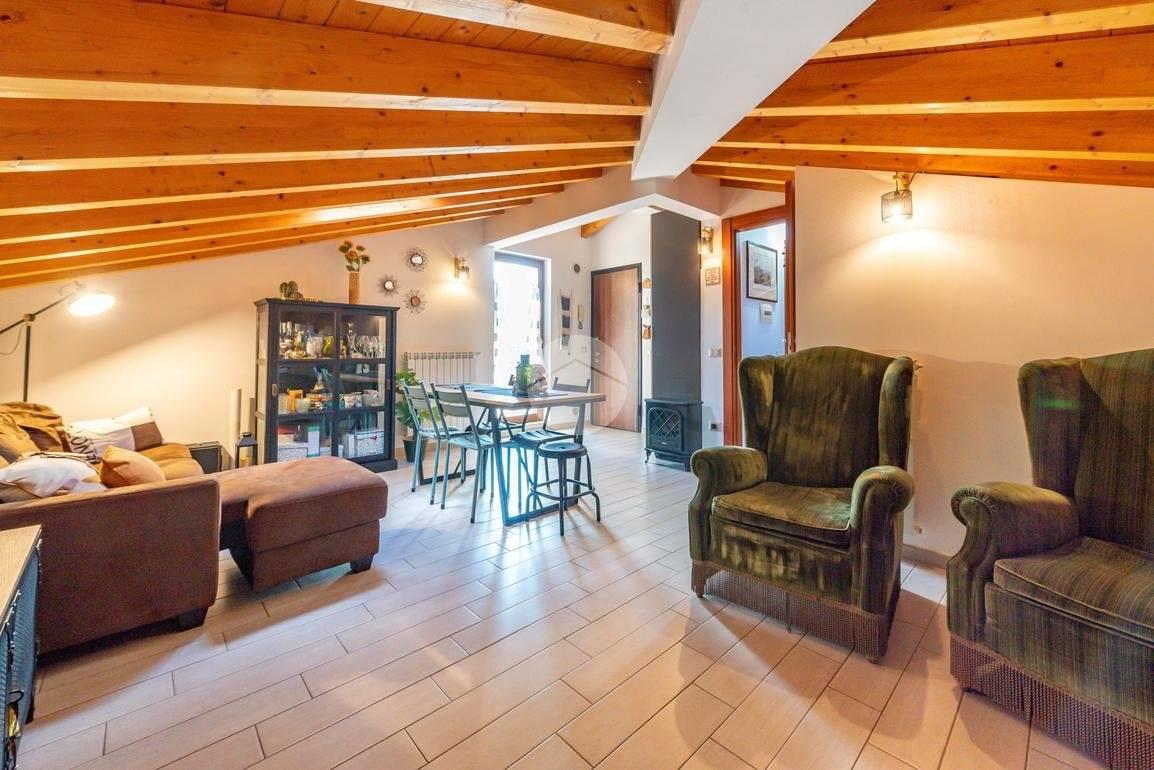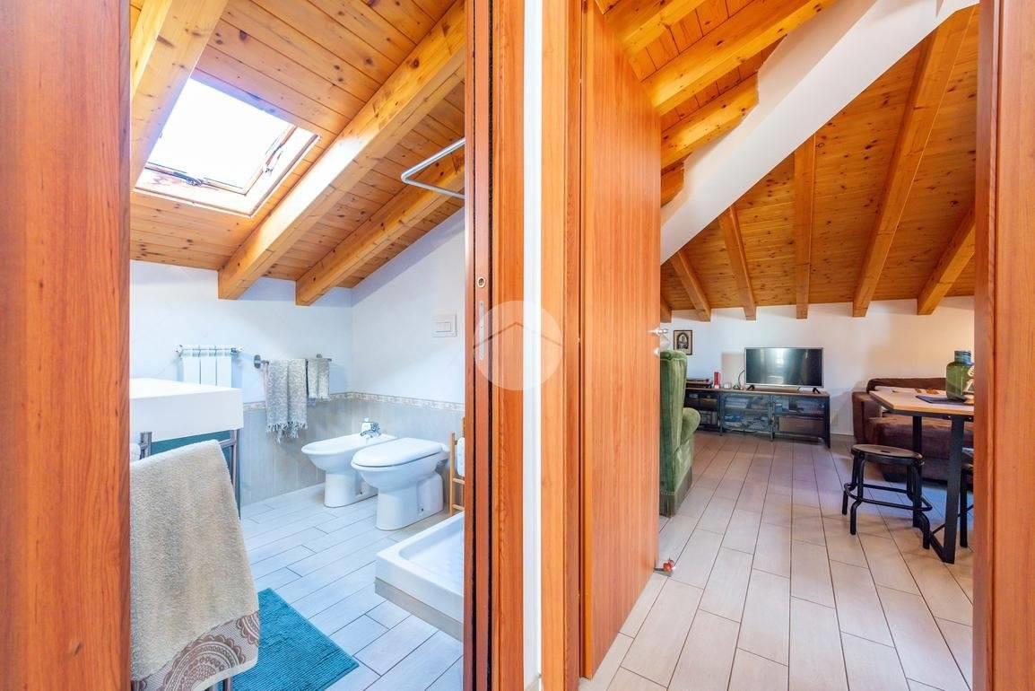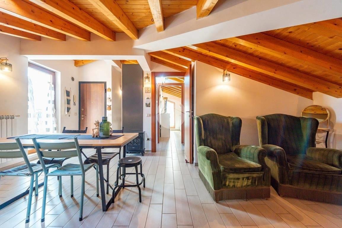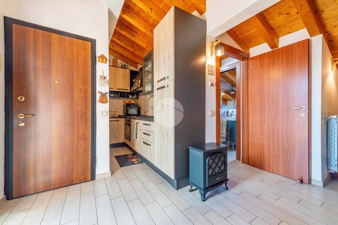 L’ingresso si apre su un soggiorno accogliente con cucinotto a vista, una soluzione pratica e moderna che valorizza gli spazi.