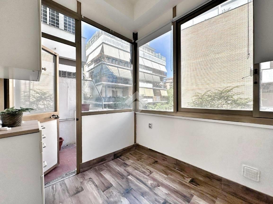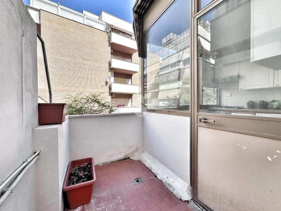 L’ingresso si apre su un soggiorno con cucinotto a vista, ricavato in una veranda condonata, da cui si accede a un balconcino esterno.