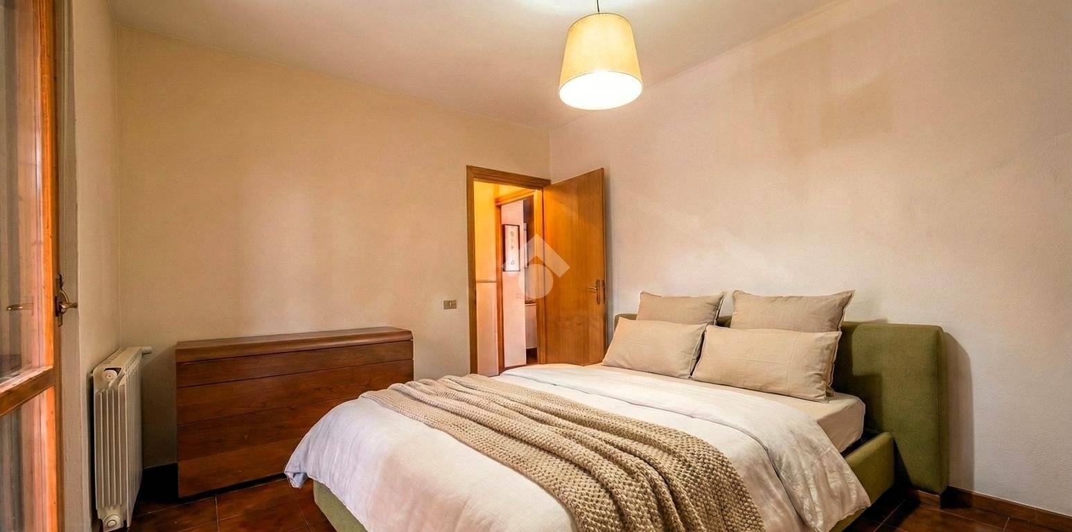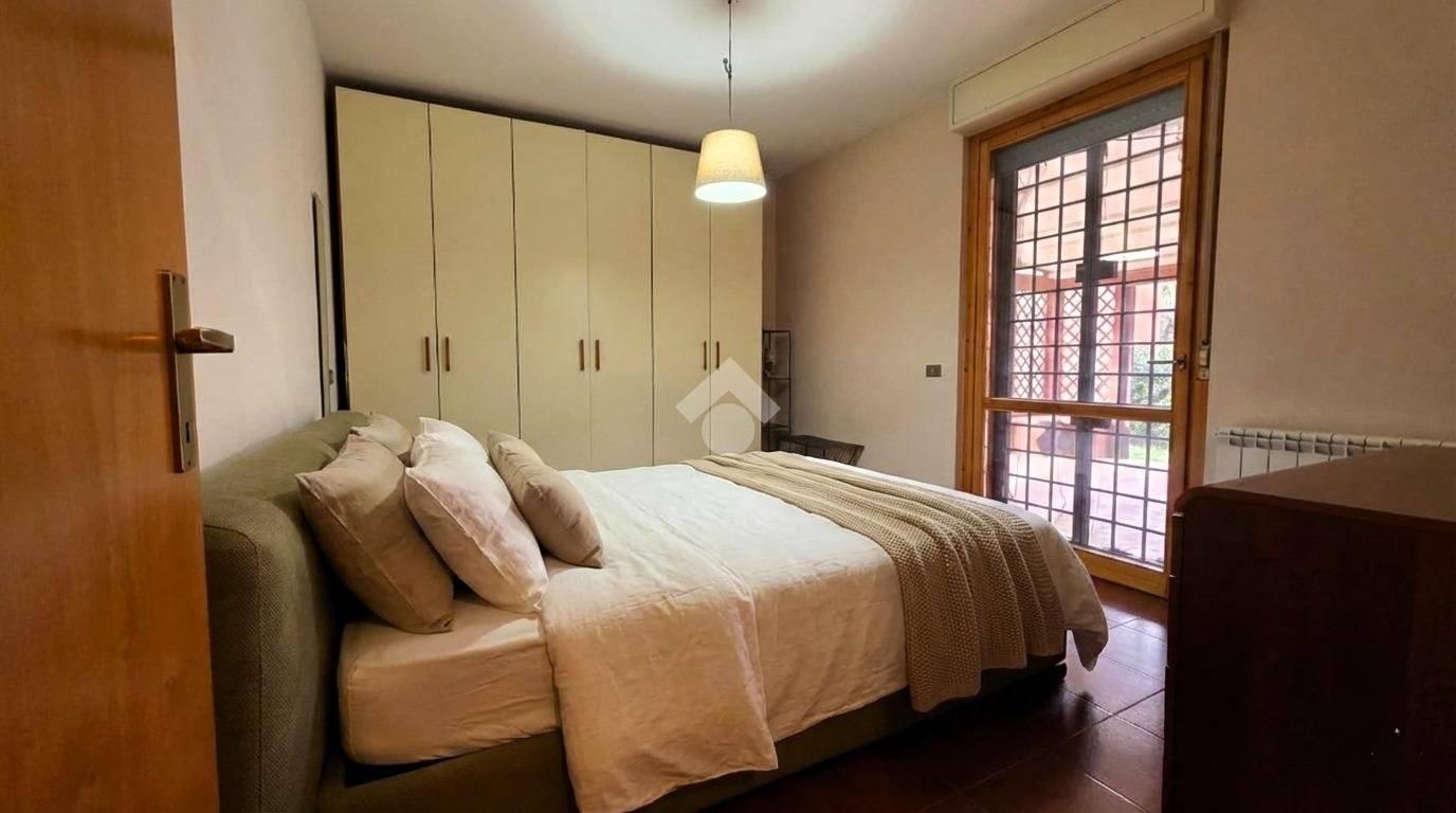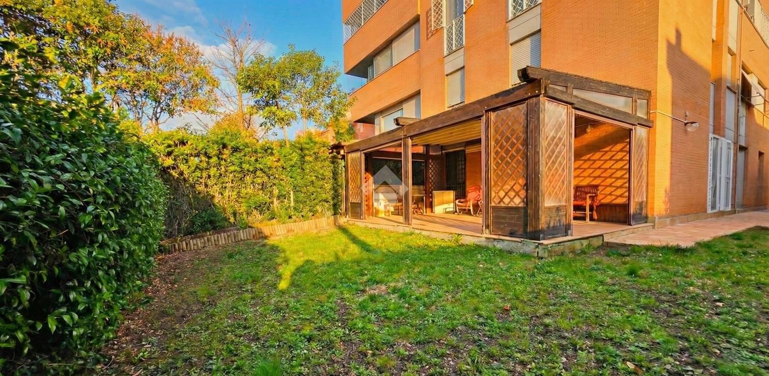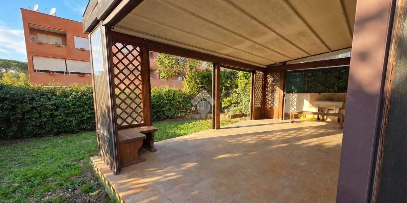 Tramite il soggiorno e la camera da letto è possibile accedere al giardino angolare di proprietà, caratterizzato da una parte pavimentata con casetta in legno per gli attrezzi e pergotenda, ideale per ospitare momenti conviviali e rilassanti.