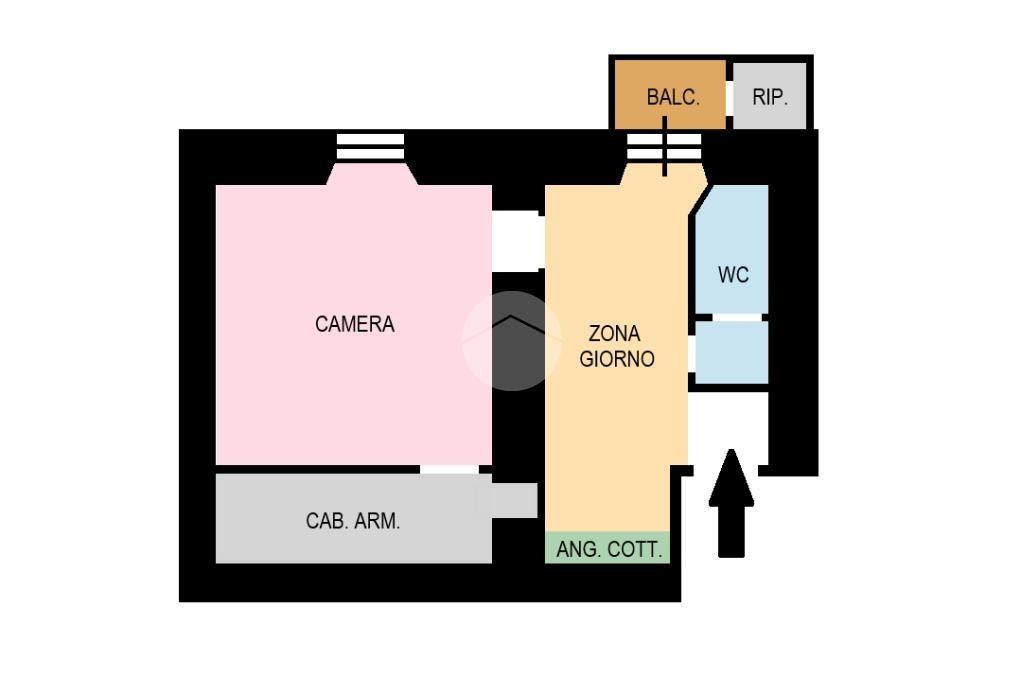 L'immobile, sito all'interno di uno stabile con possibilità di uso dell'ascensore, è così composto: ingresso, soggiorno con funzionale angolo cottura, camera da letto matrimoniale dotata di esclusiva cabina armadio e servizio; completa la proprietà un balcone con affaccio silenzioso