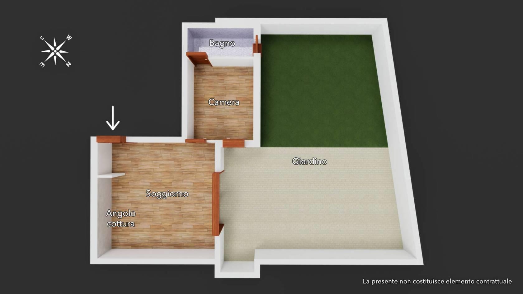 Soggiorno con angolo cottura, camera matrimoniale, bagno e giardino di 75 mq in parte pavimentato.
