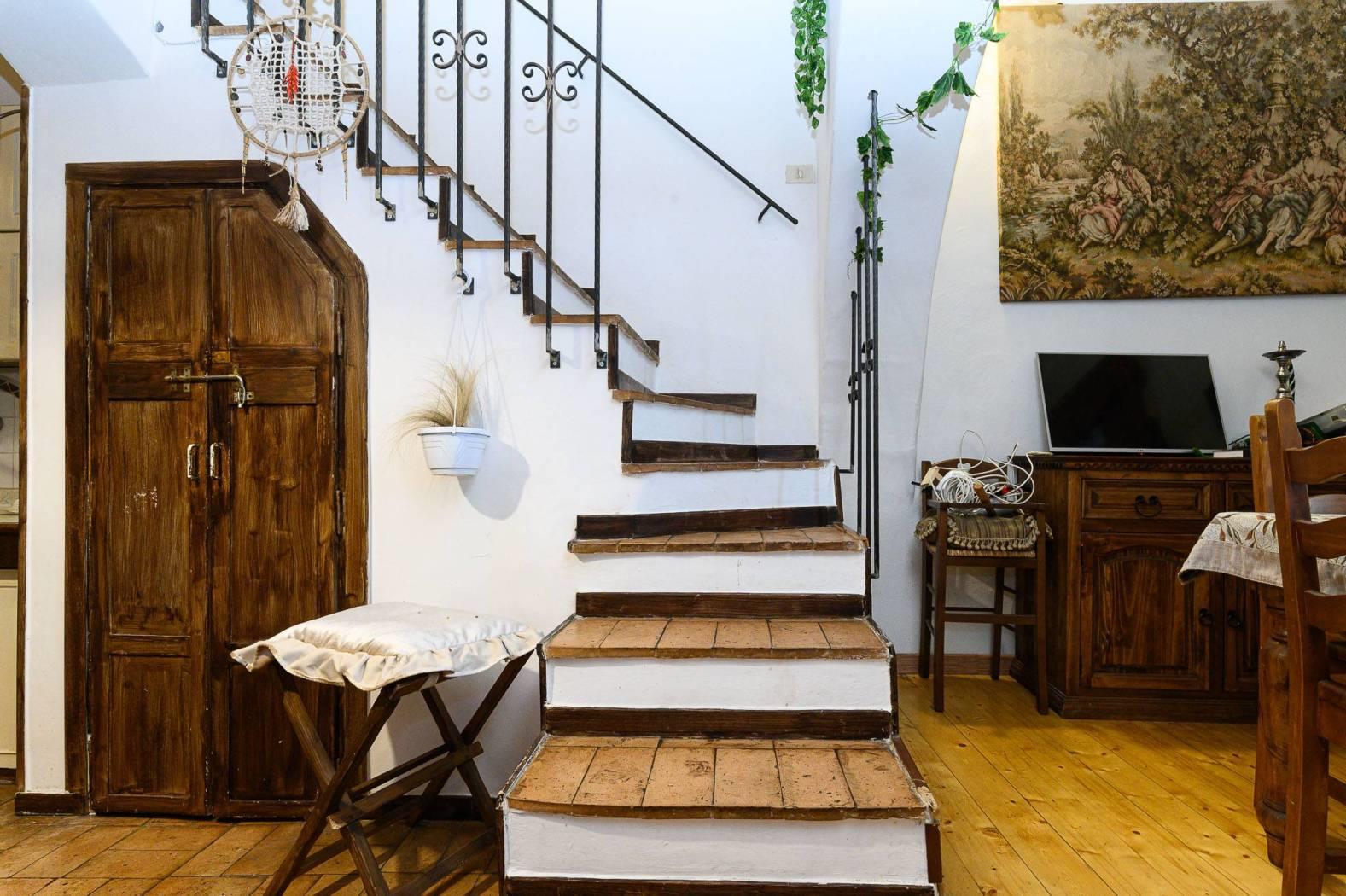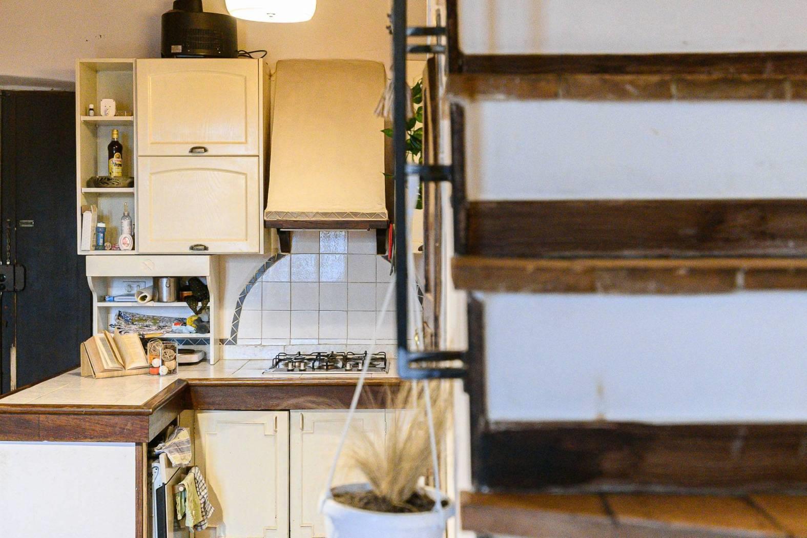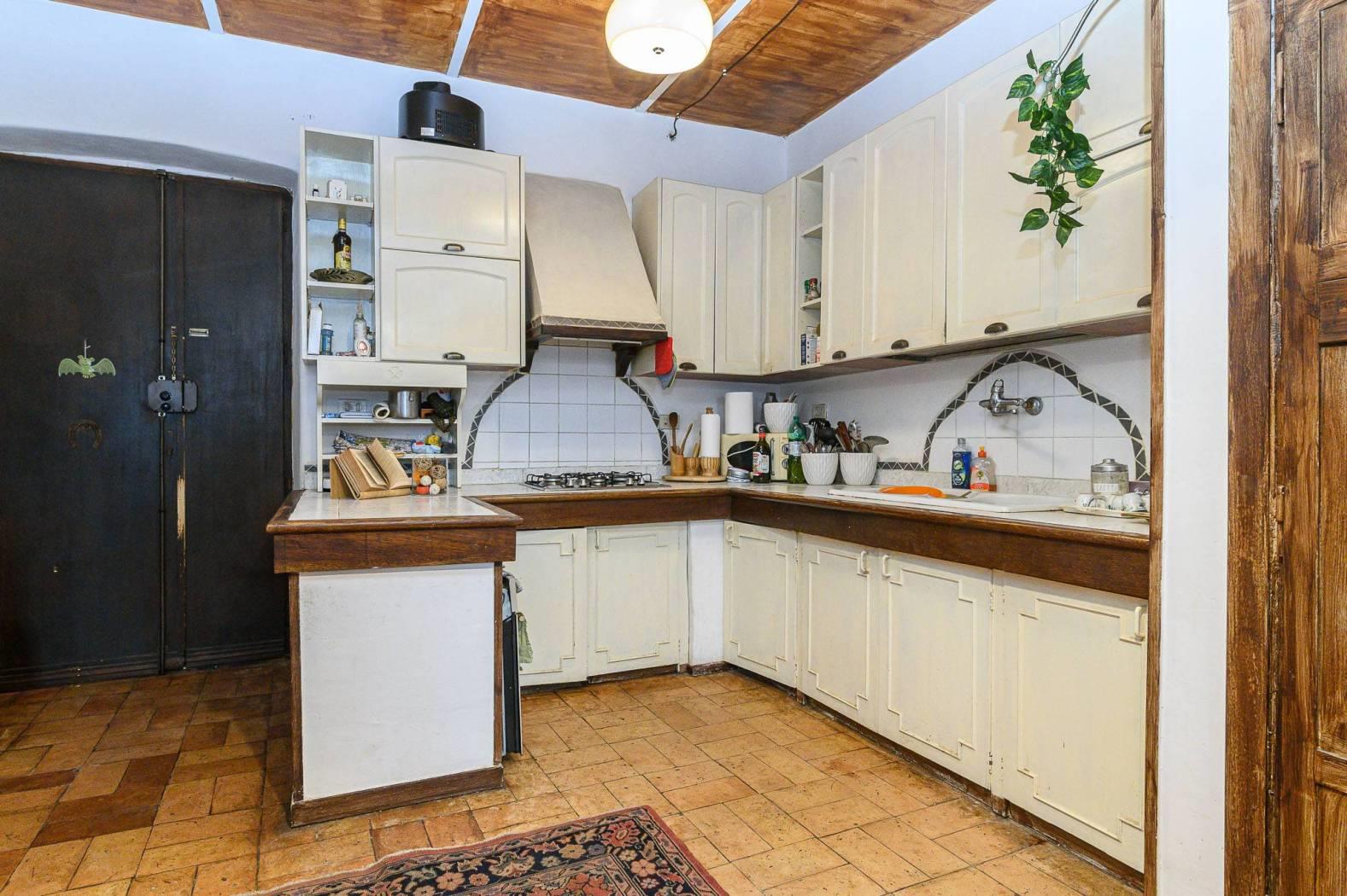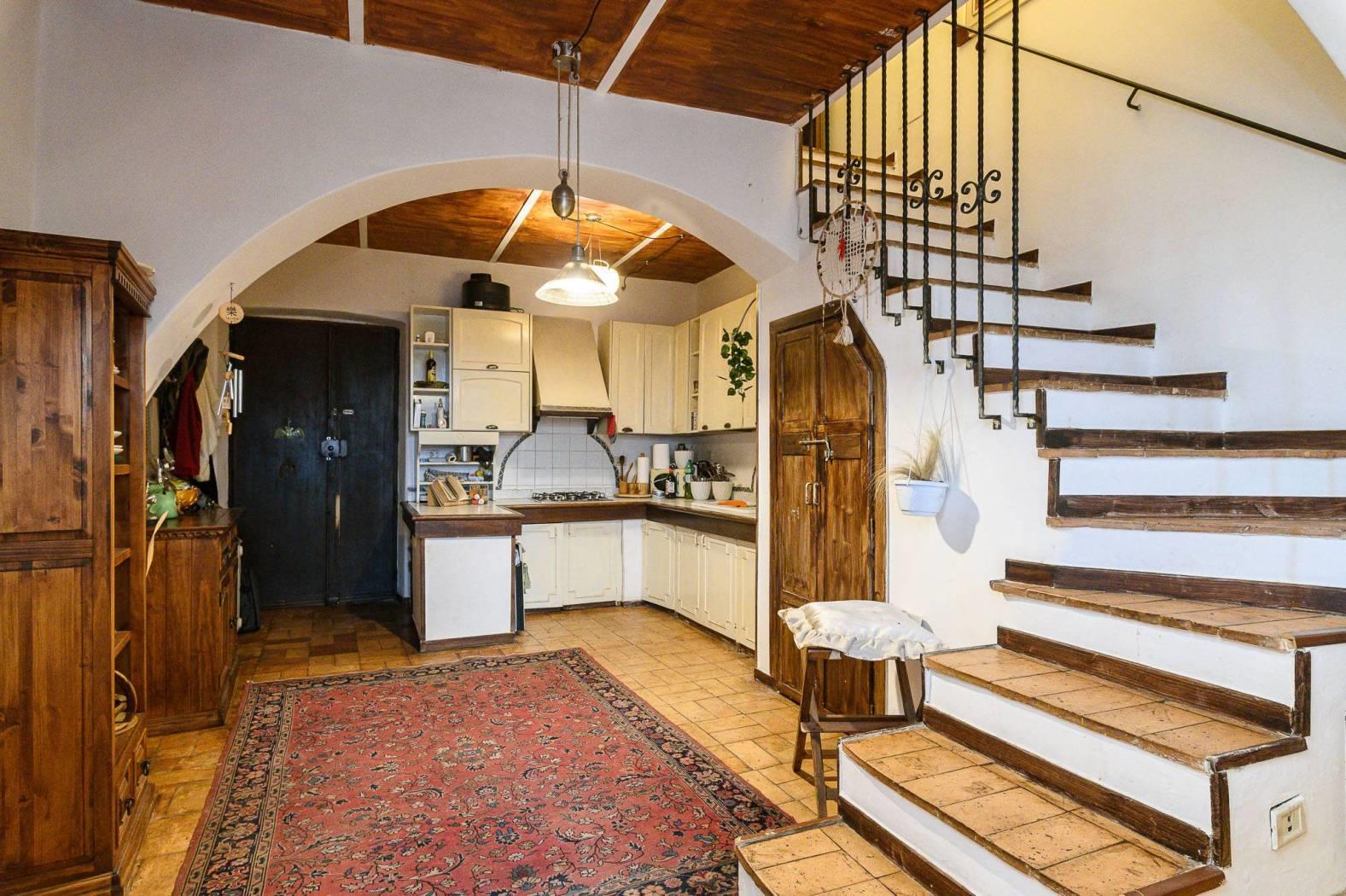 Dal punto di vista delle finiture, la cucina presenta pavimentazione in cotto, mentre il resto dell’abitazione è rifinito in parquet con listoni in legno a taglio irregolare, in armonia con l’atmosfera storica dell’edificio e con le travi a vista.