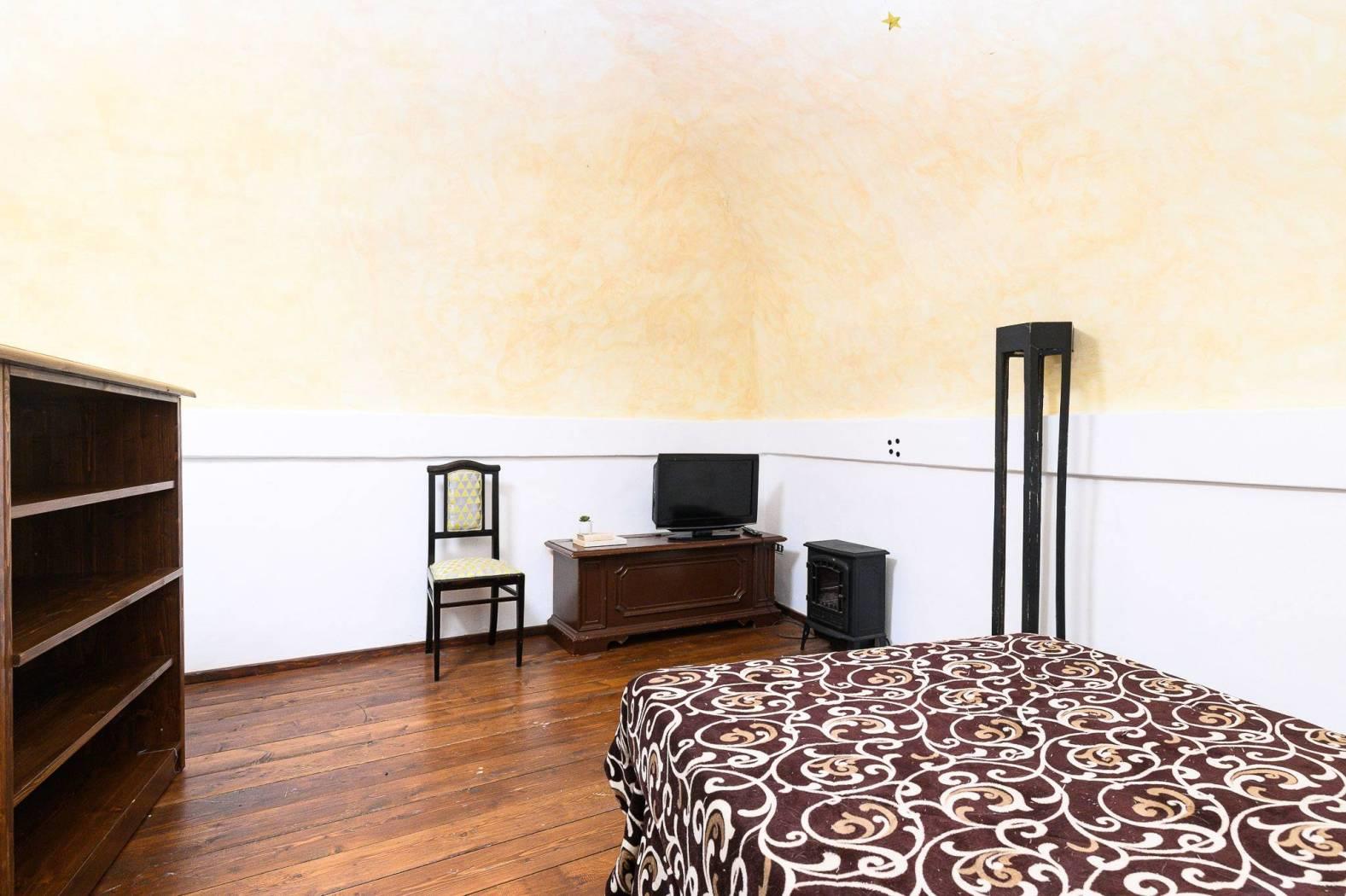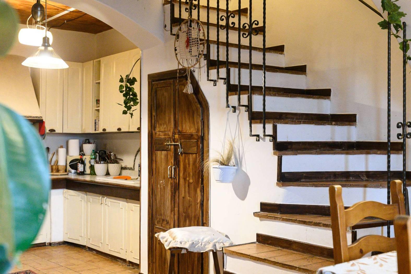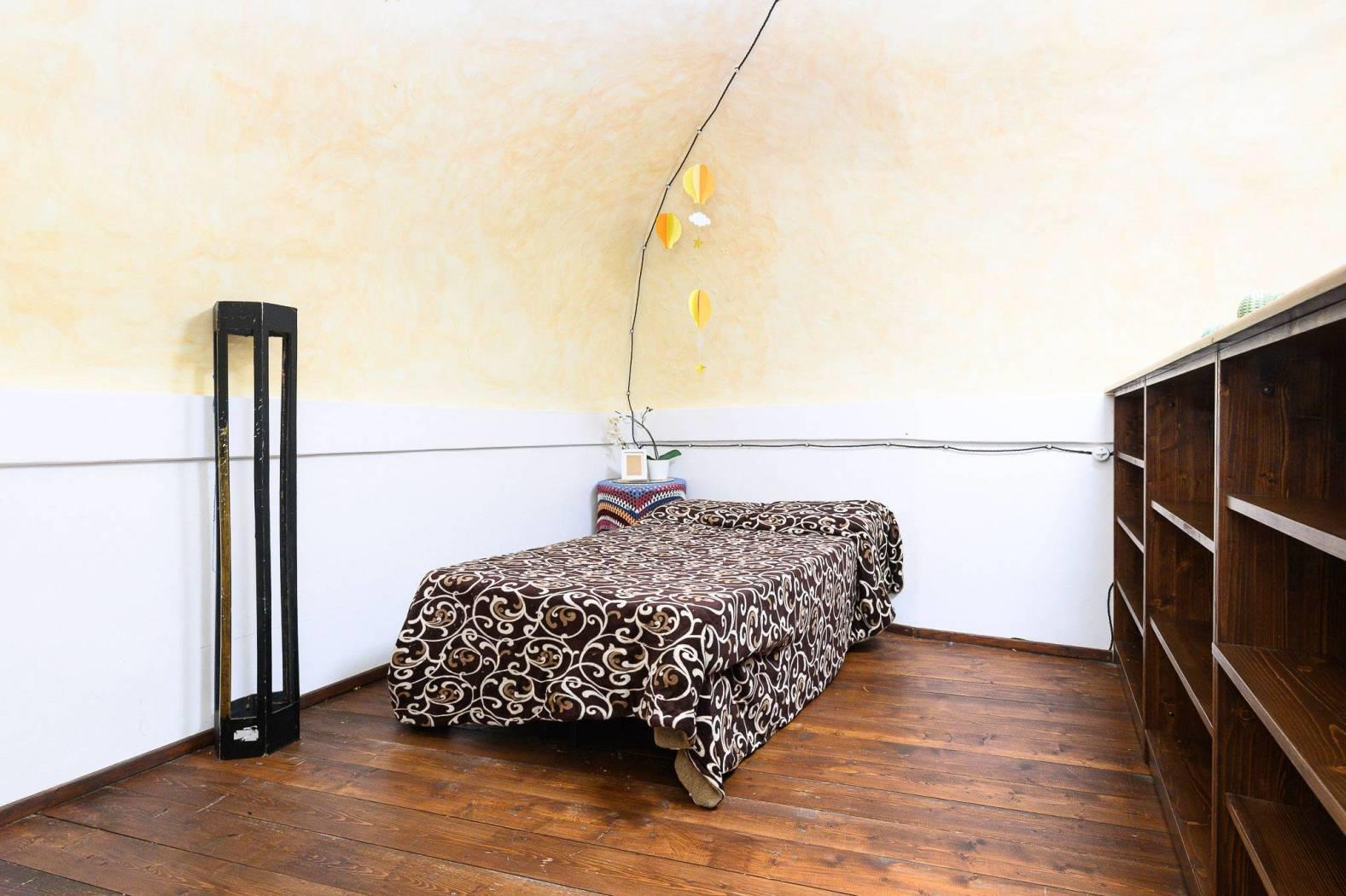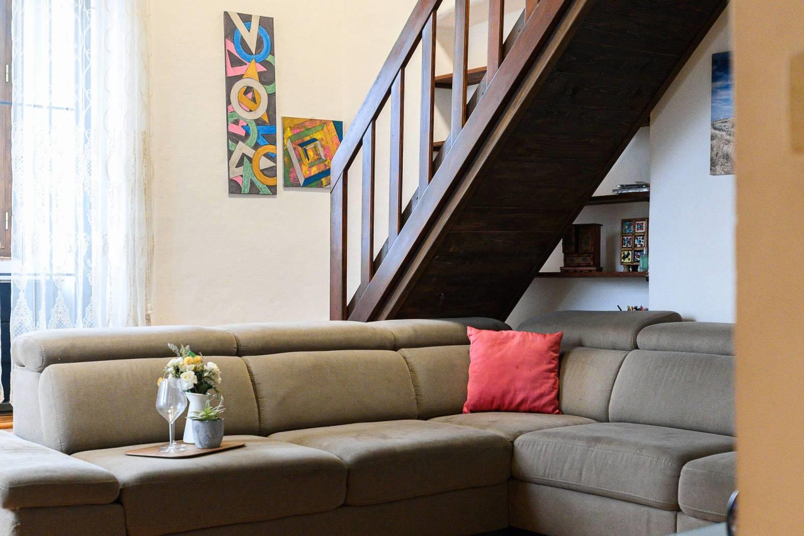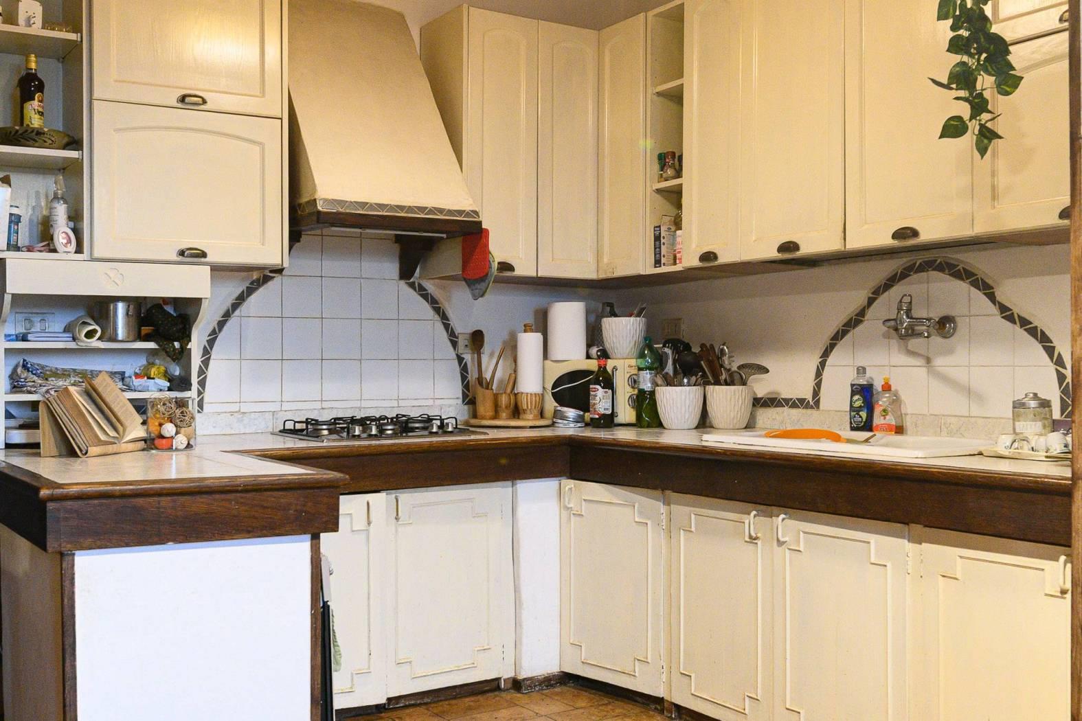 Dal punto di vista delle finiture, la cucina presenta pavimentazione in cotto, mentre il resto dell’abitazione è rifinito in parquet con listoni in legno a taglio irregolare, in armonia con l’atmosfera storica dell’edificio e con le travi a vista.