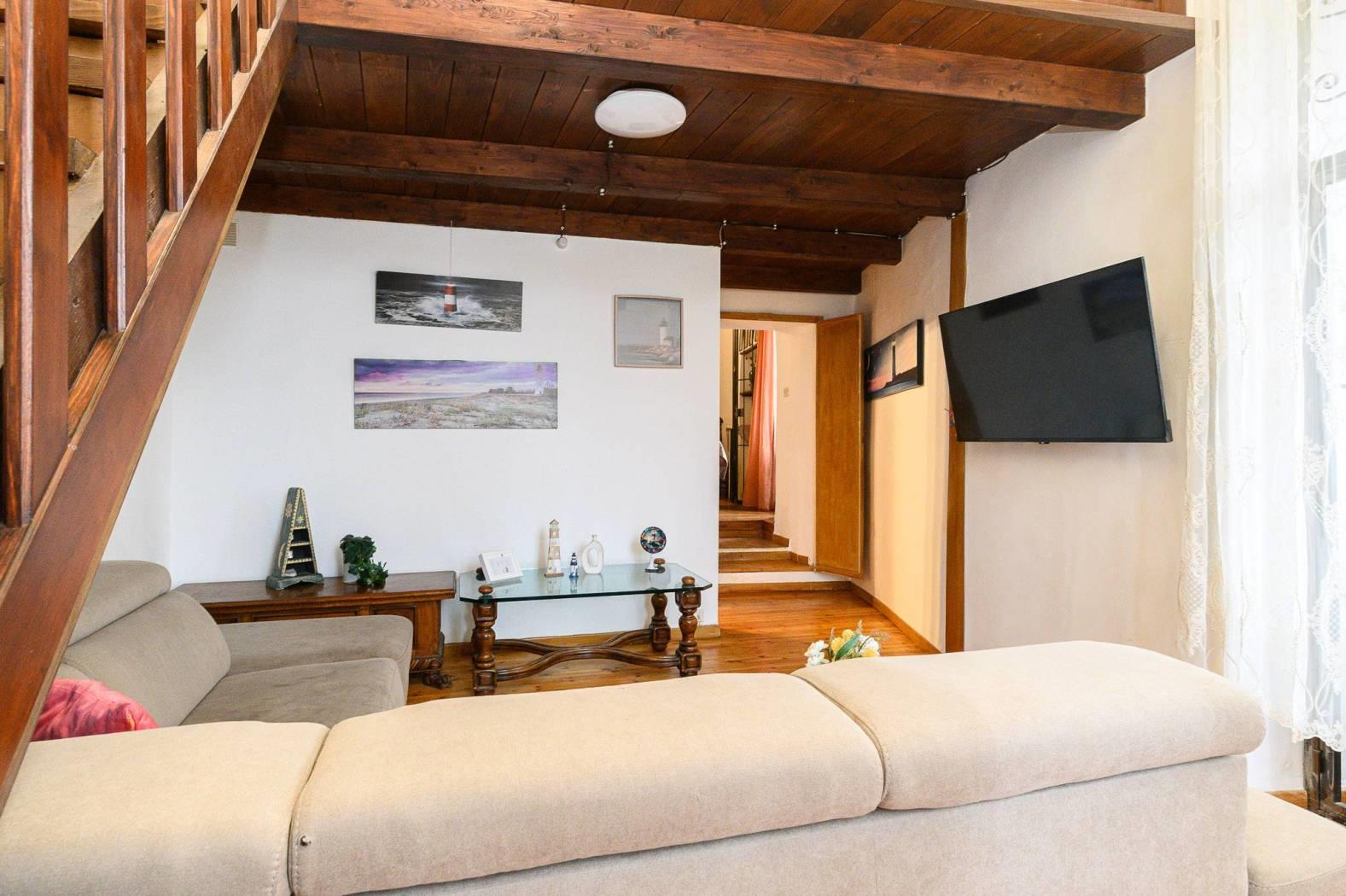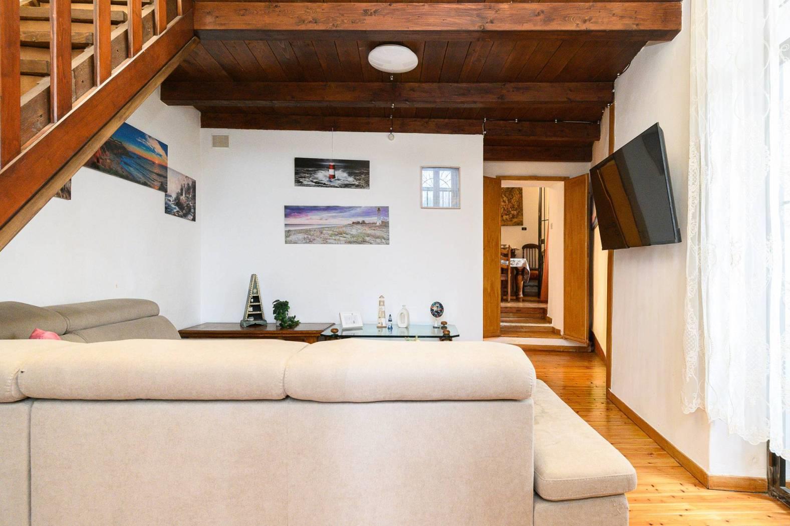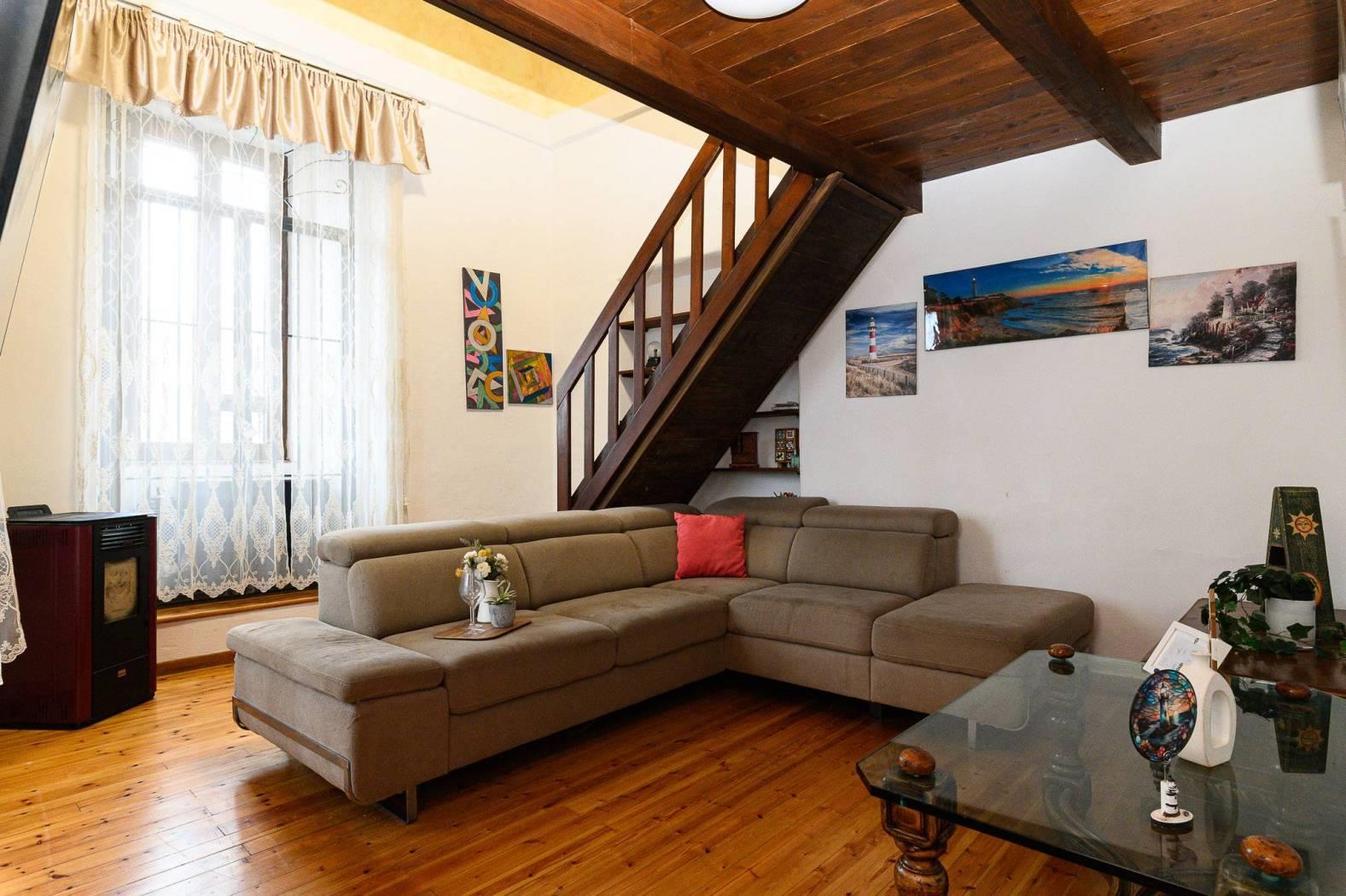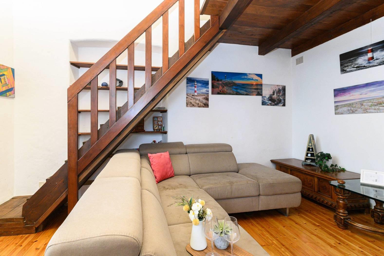 Dal punto di vista delle finiture, la cucina presenta pavimentazione in cotto, mentre il resto dell’abitazione è rifinito in parquet con listoni in legno a taglio irregolare, in armonia con l’atmosfera storica dell’edificio e con le travi a vista.