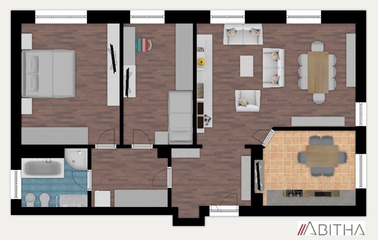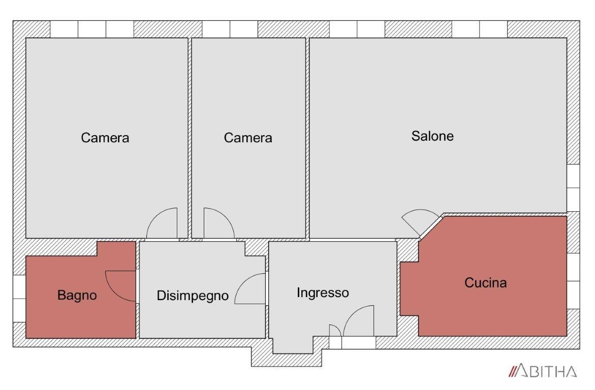 Pur essendo un piano rialzato risulta molto luminoso. Necessita di lavori di ristrutturazione; allo stato attuale i pavimenti sono in parquet nella zona giorno e nella camera singola, in cucina sono in cotto, nella camera matrimoniale e nel bagno in monocottura/ceramica; la porta è blindata e gli infissi sono in legno.