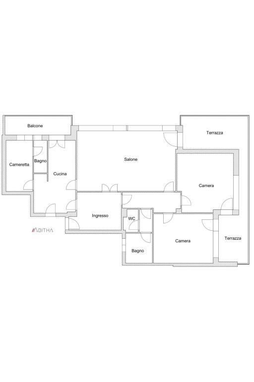 L'appartamento è composto da ampio ingresso, salone doppio con grandi finestre che conferiscono una spiccata luminosità, zona notte composta da due camere matrimoniali, un bagno con vasca ed un piccolo bagno con doccia; è possibile modificarli creando un bagno padronale en-suite ed un secondo bagno con ingresso dal corridoio. Sia dal salone che dalle camere si accede ad un ampia balconata abitabile con affaccio molto aperto ed assolato. La zona di servizio è dotata di un secondo ingresso indipendente, una cucina abitabile con balconcino, cameretta e bagno di servizio.