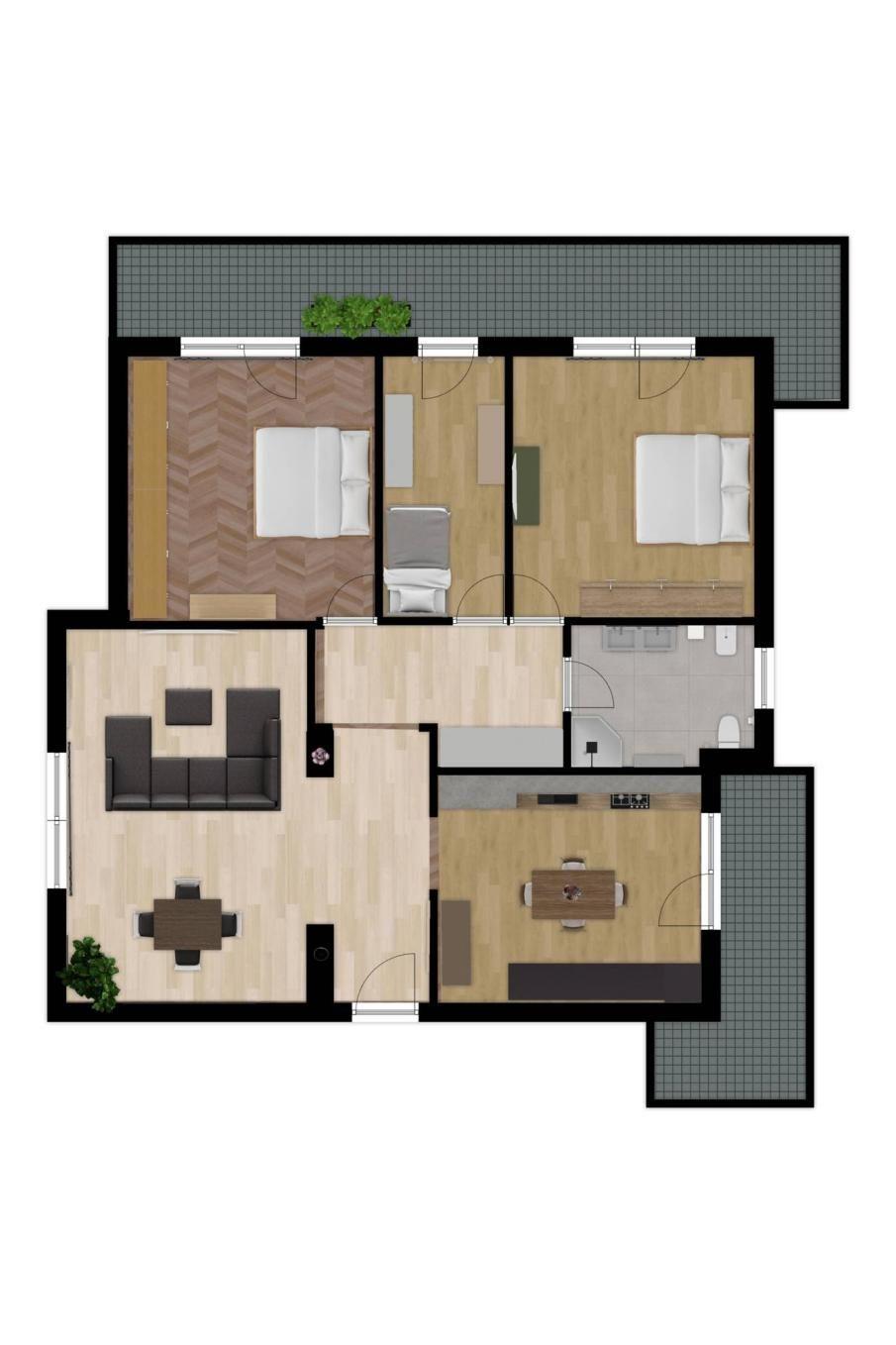 L’appartamento sviluppa una superficie di circa 130 mq ed è composto da: ampio ingresso che si apre sul salone doppio, cucina abitabile con camino con accesso frontale rispetto al soggiorno, distribuzione ideale per mantenere ben separata la zona giorno dalla zona notte. Da un comodo disimpegno (con grande armadio a muro) si accede alla zona notte composta da tre camere, di cui due matrimoniali molto ampie e una cameretta di circa 10 mq, oltre a bagno recentemente ristrutturato con sanitari sospesi.
