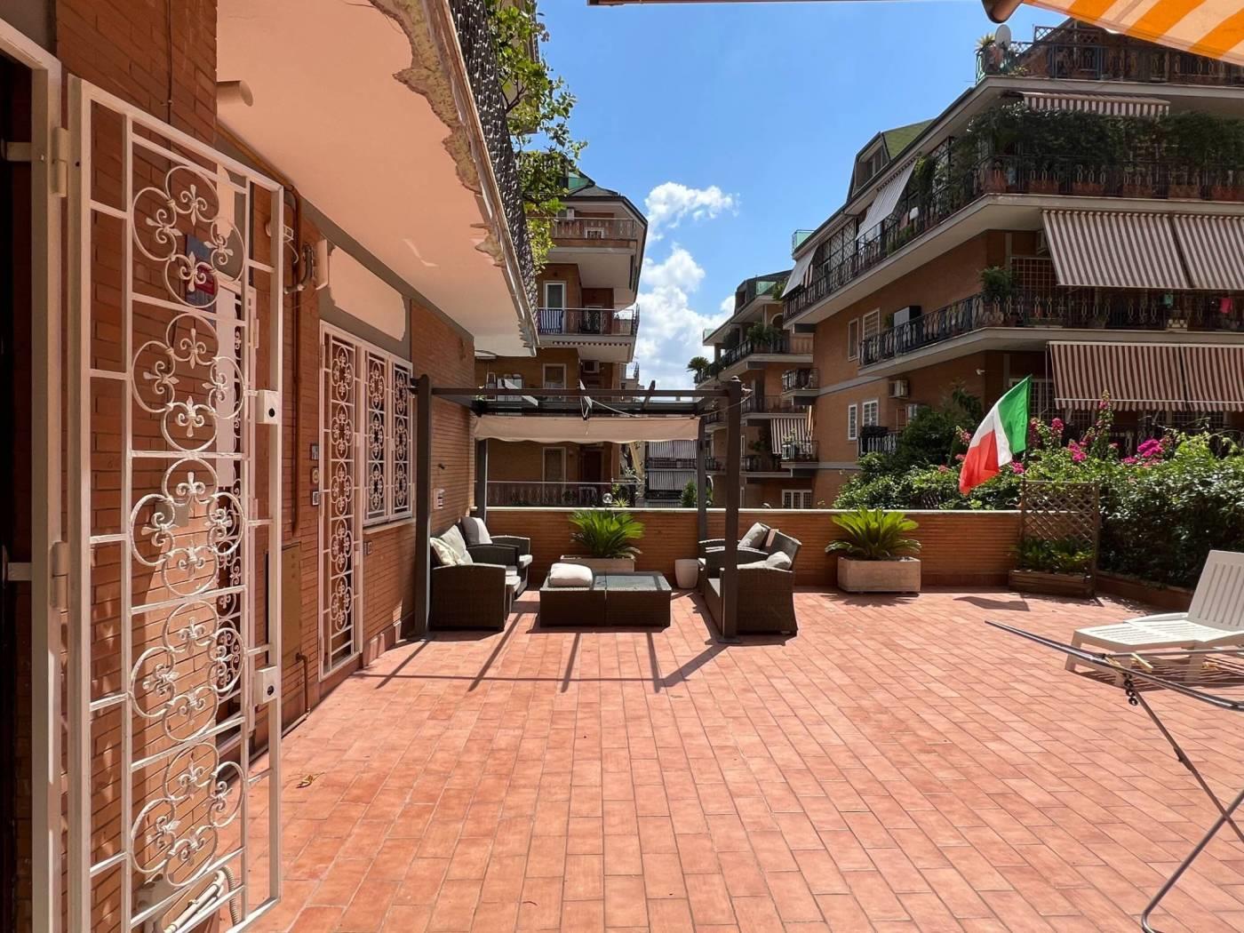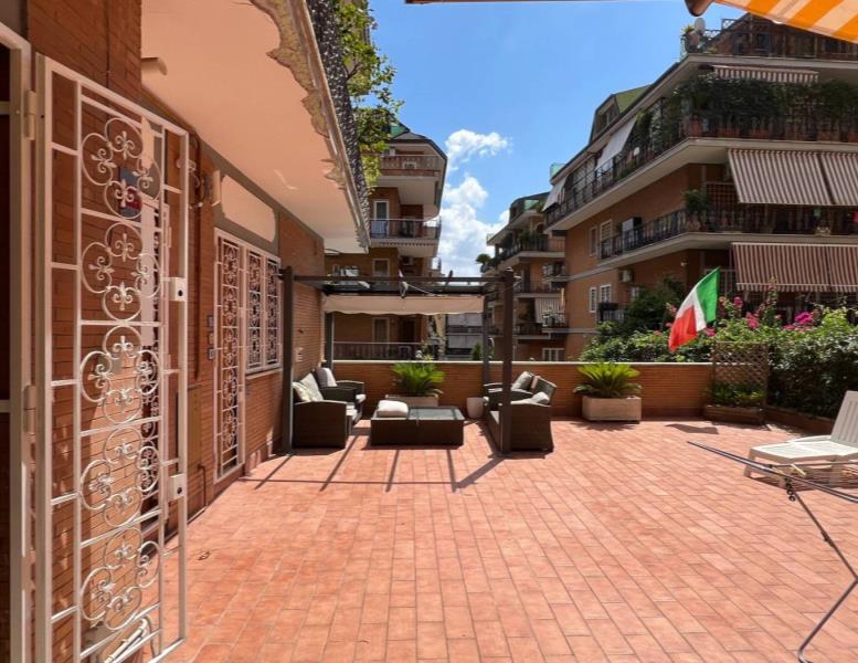 Ma è uscendo all’esterno che si svela la magia: un terrazzo di dimensioni straordinarie, attrezzato con divani e pergolato, un vero salotto open-air dove leggere, ricevere amici o semplicemente lasciarsi abbracciare dal sole. Un privilegio raro, soprattutto considerando che ogni ambiente della casa ha accesso diretto a questo spazio unico.