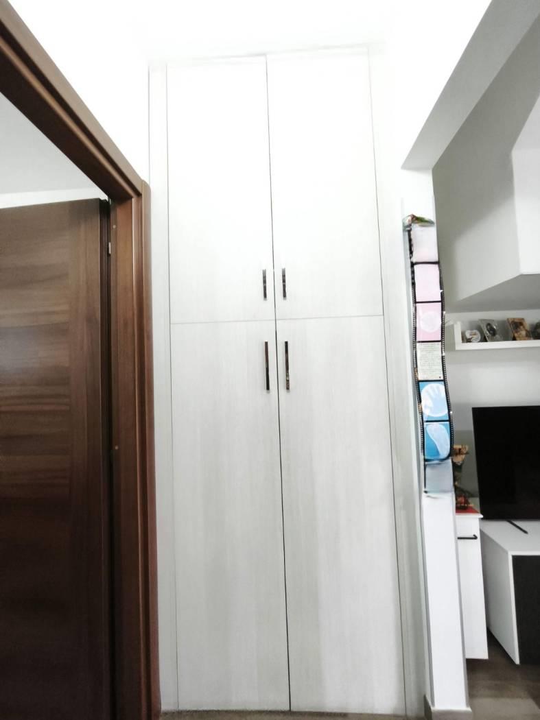 Accogliente soggiorno con angolo cottura, cucina arredata su misura, pratico disimpegno con ampia armadiatura, camera da letto, bagno finestrato e balcone ideale per i momenti di relax.