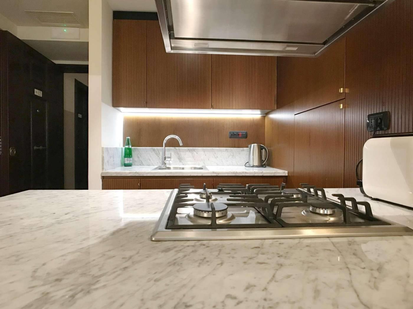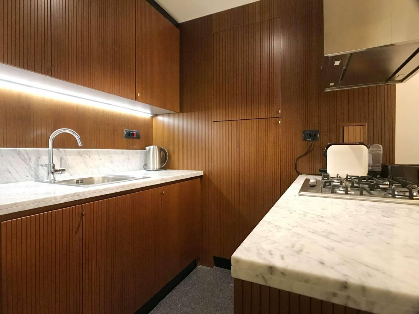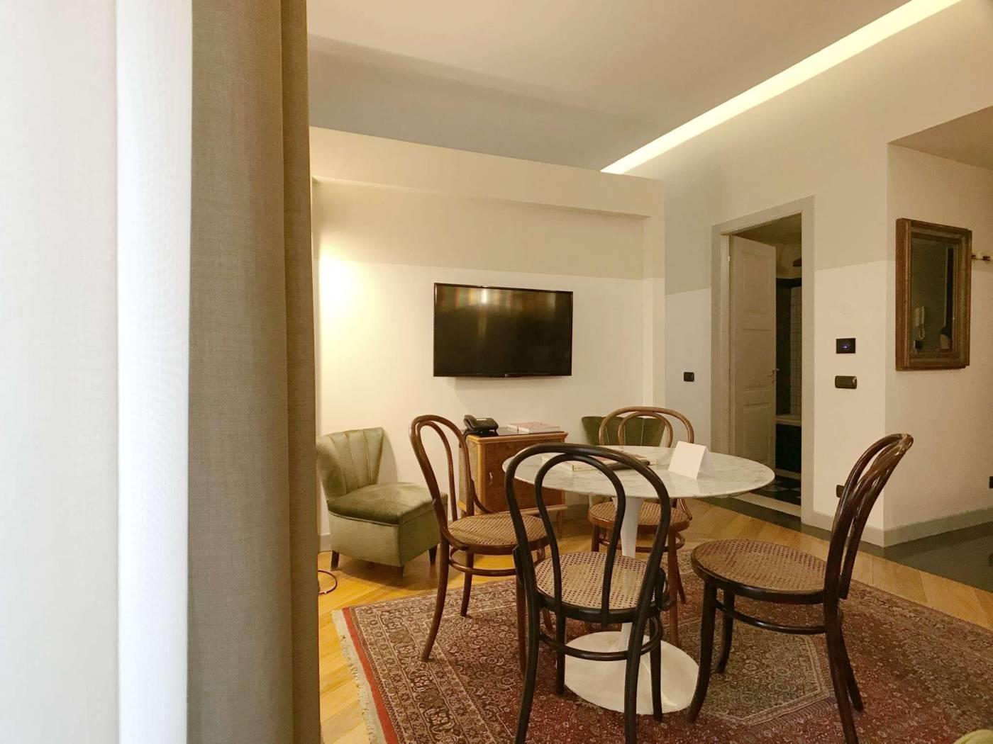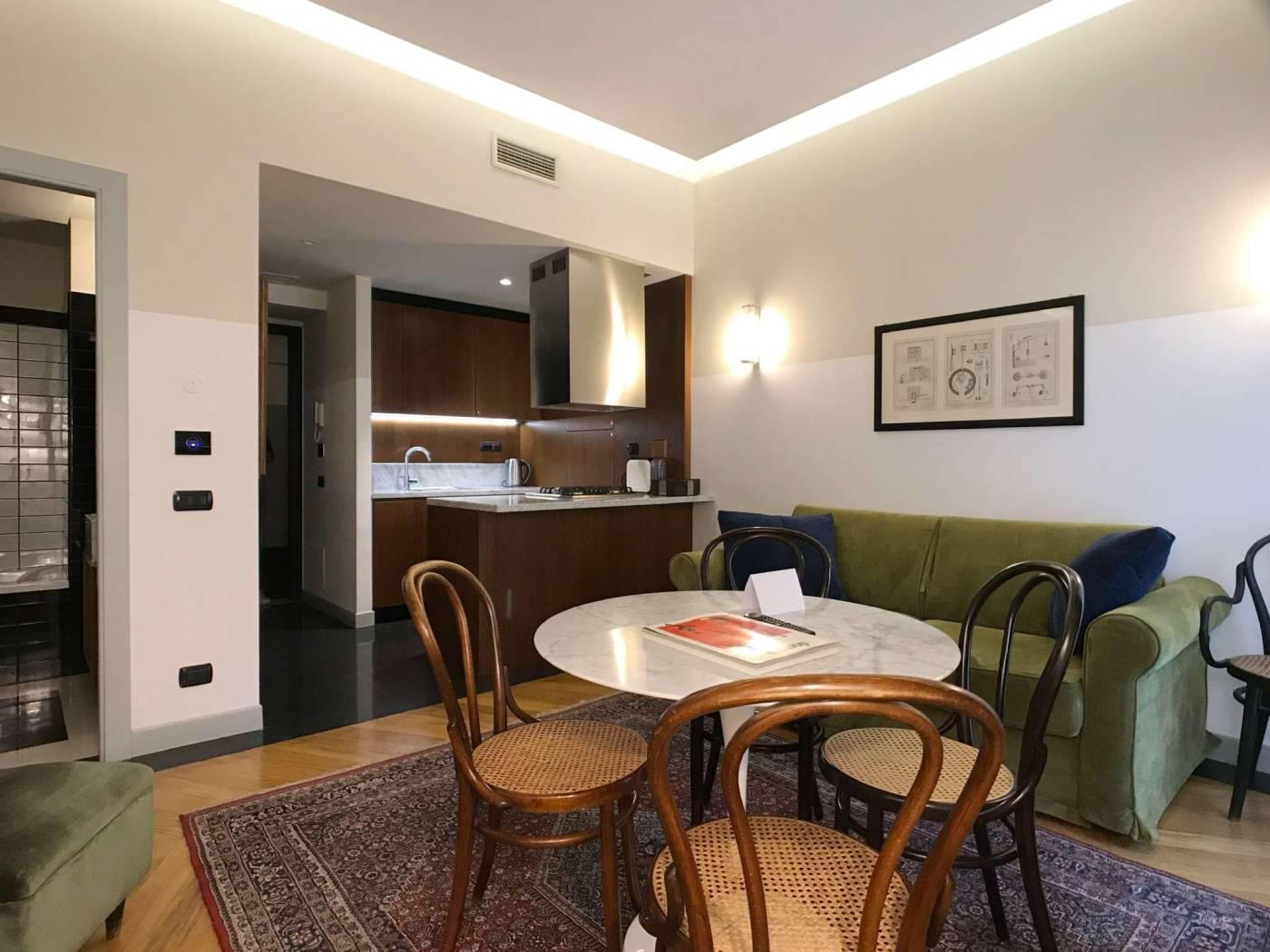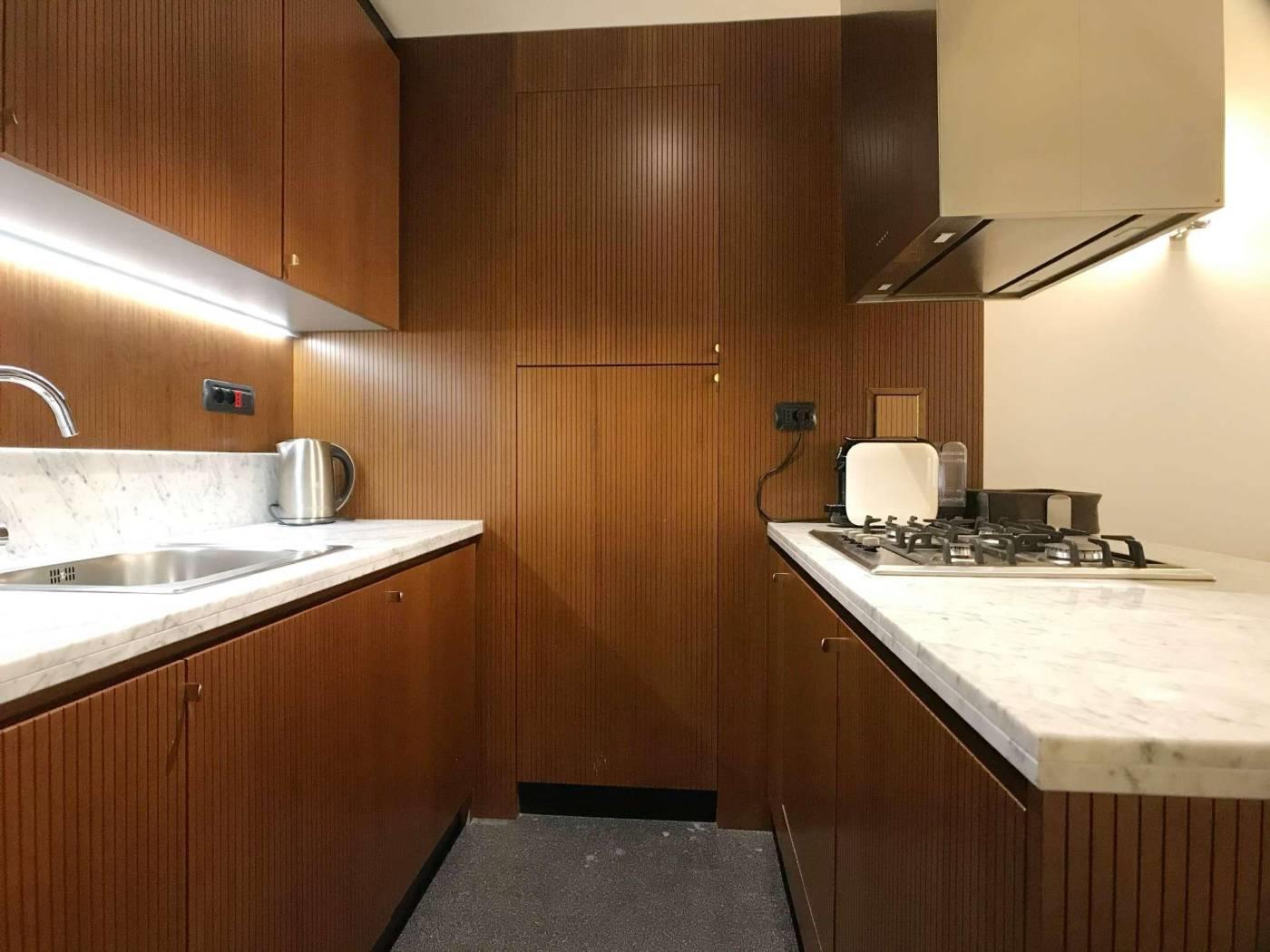 Gli appartamenti sono, dotati di porta blindata, con smart card per l’accesso e nuovi infissi antirumore e a taglio termico. I pavimenti sono in marmette bicolore o parquet. I tappeti sono antichi; gli specchi, i tavolini, i comodini e le tolette sono art deco. Le cucine sono nuove appositamente disegnate, con piani in marmo e ante in legno, completamente attrezzate.