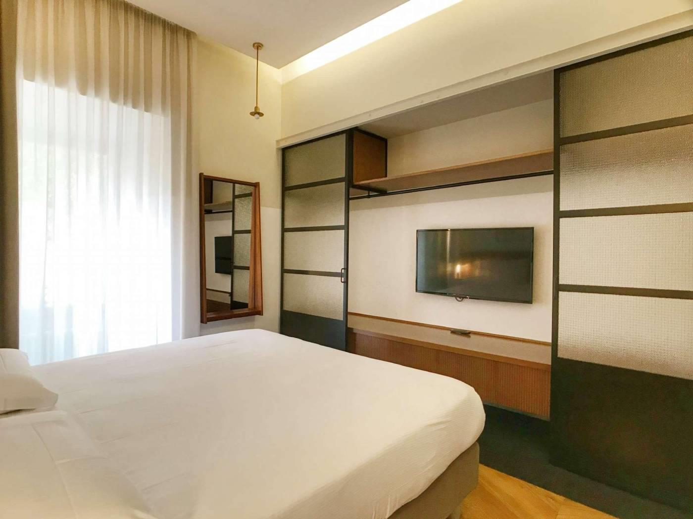 La zona letto è separata e dotata di letto matrimoniale king-size e tv.