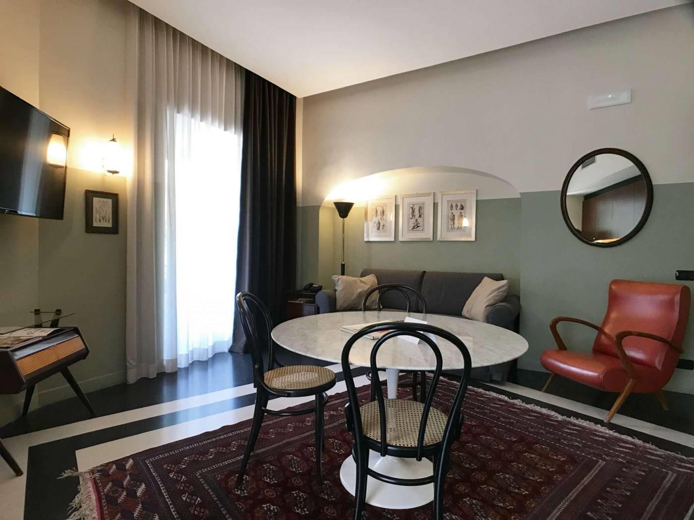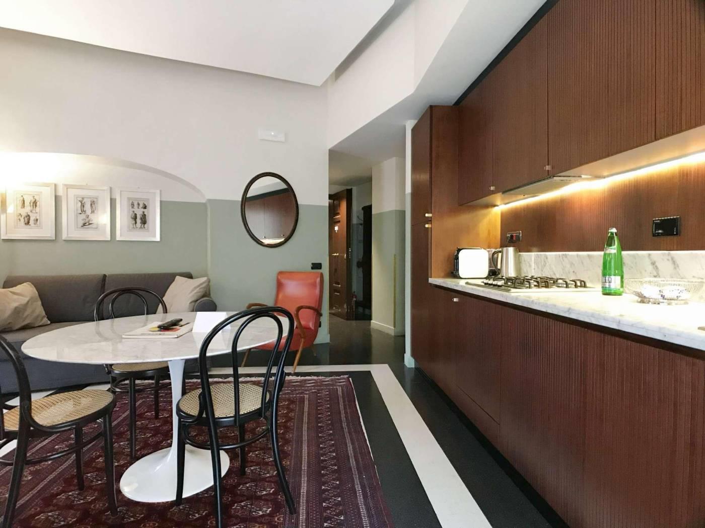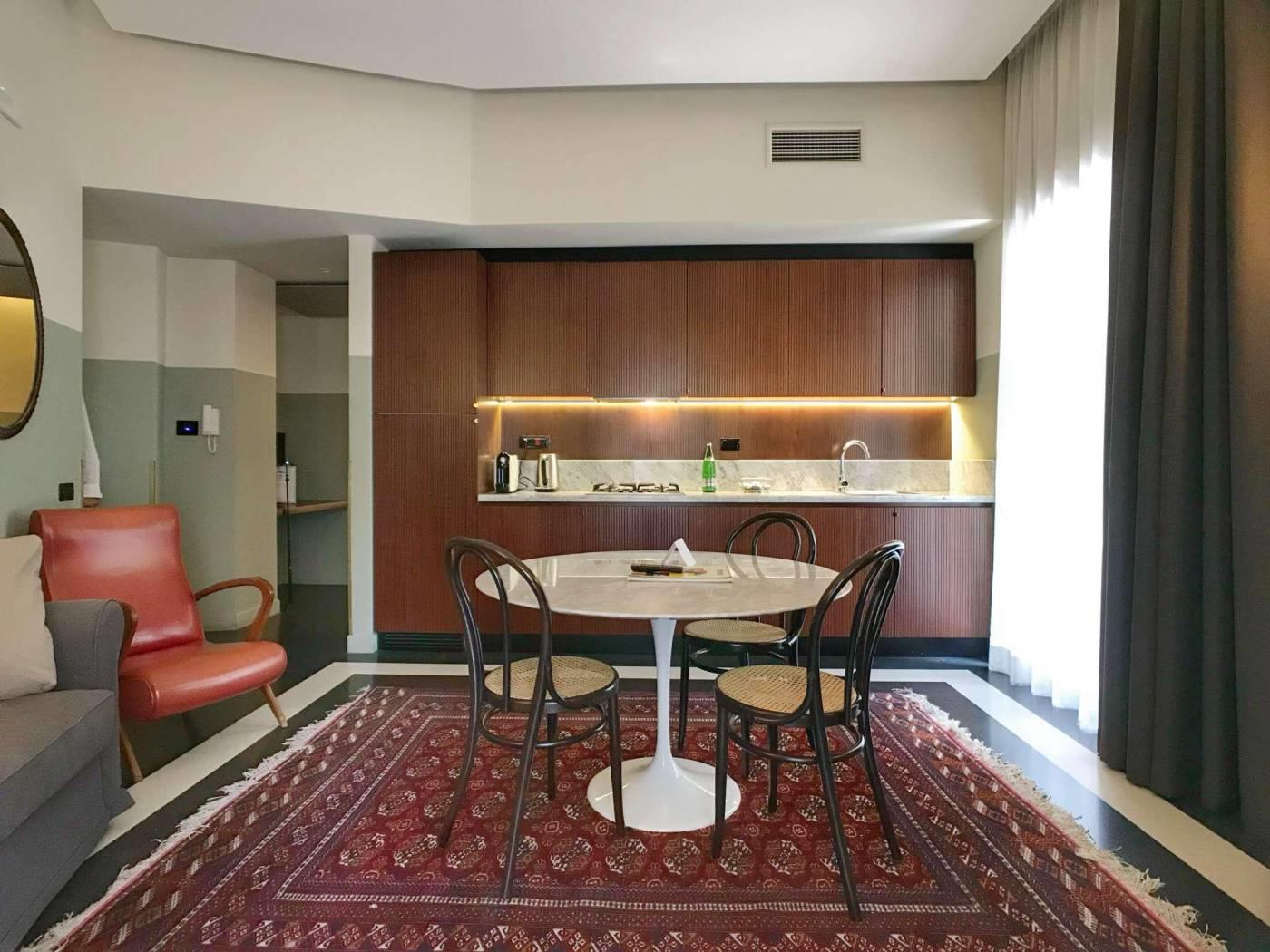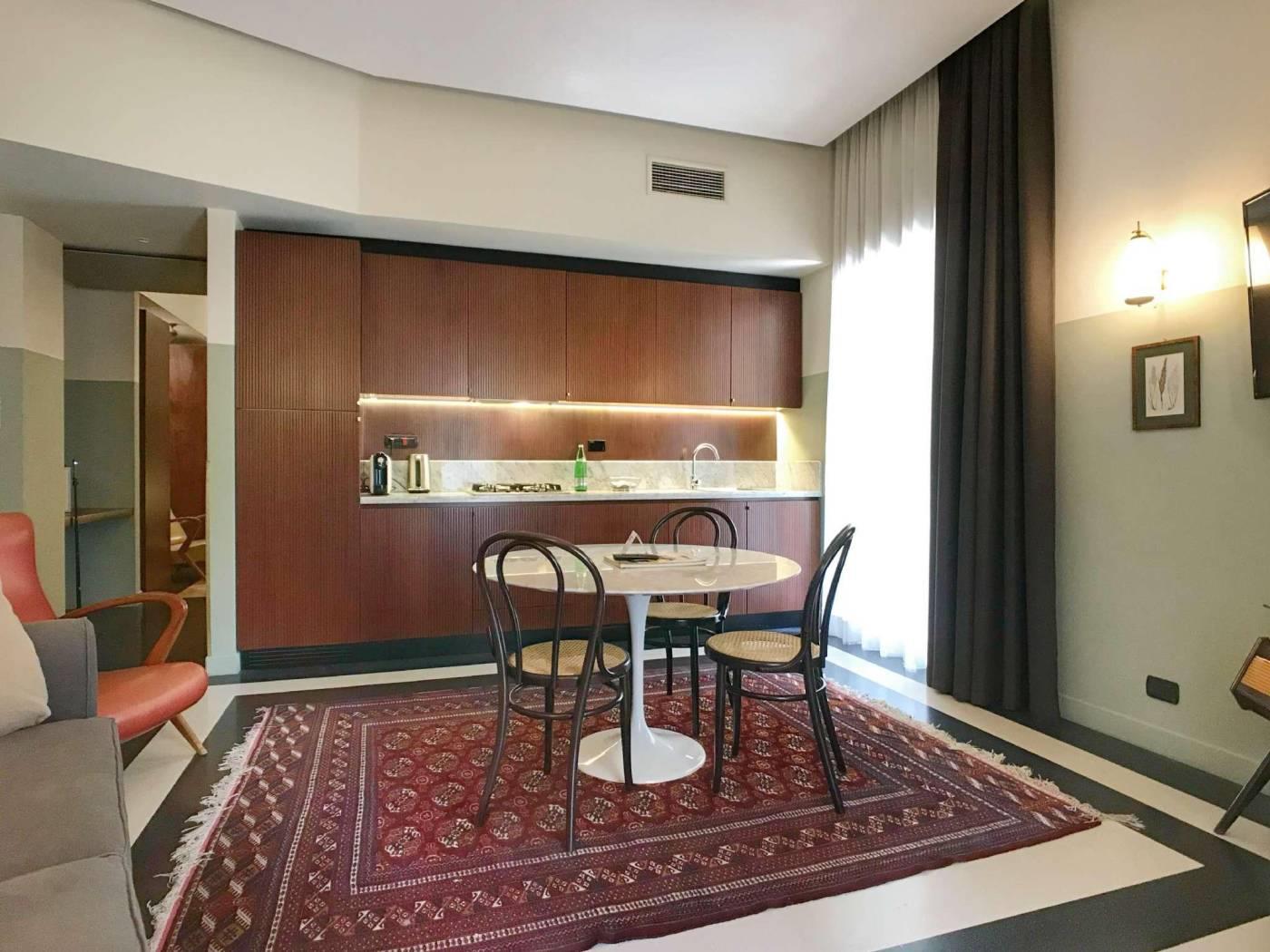 La tradizione della Roma bella ed elegante degli anni del Dopoguerra rivive in questi appartamenti grazie al riutilizzo dei pavimenti in graniglia tipici dell’epoca, i bagni con mattonelle e marmi, la scelta dei materiali e degli oggetti d’arredo parlano la lingua del gusto italiano. Gli spazi sono tutti arredati in maniera diversa e sono dotati di porta blindata, con smart card per l’accesso e nuovi infissi antirumore e a taglio termico. I pavimenti sono in marmette bicolore o parquet. I tappeti sono antichi; gli specchi, i tavolini, i comodini e le tolette sono art deco. Le cucine sono nuove appositamente disegnate, con piani in marmo e ante in legno, completamente attrezzate