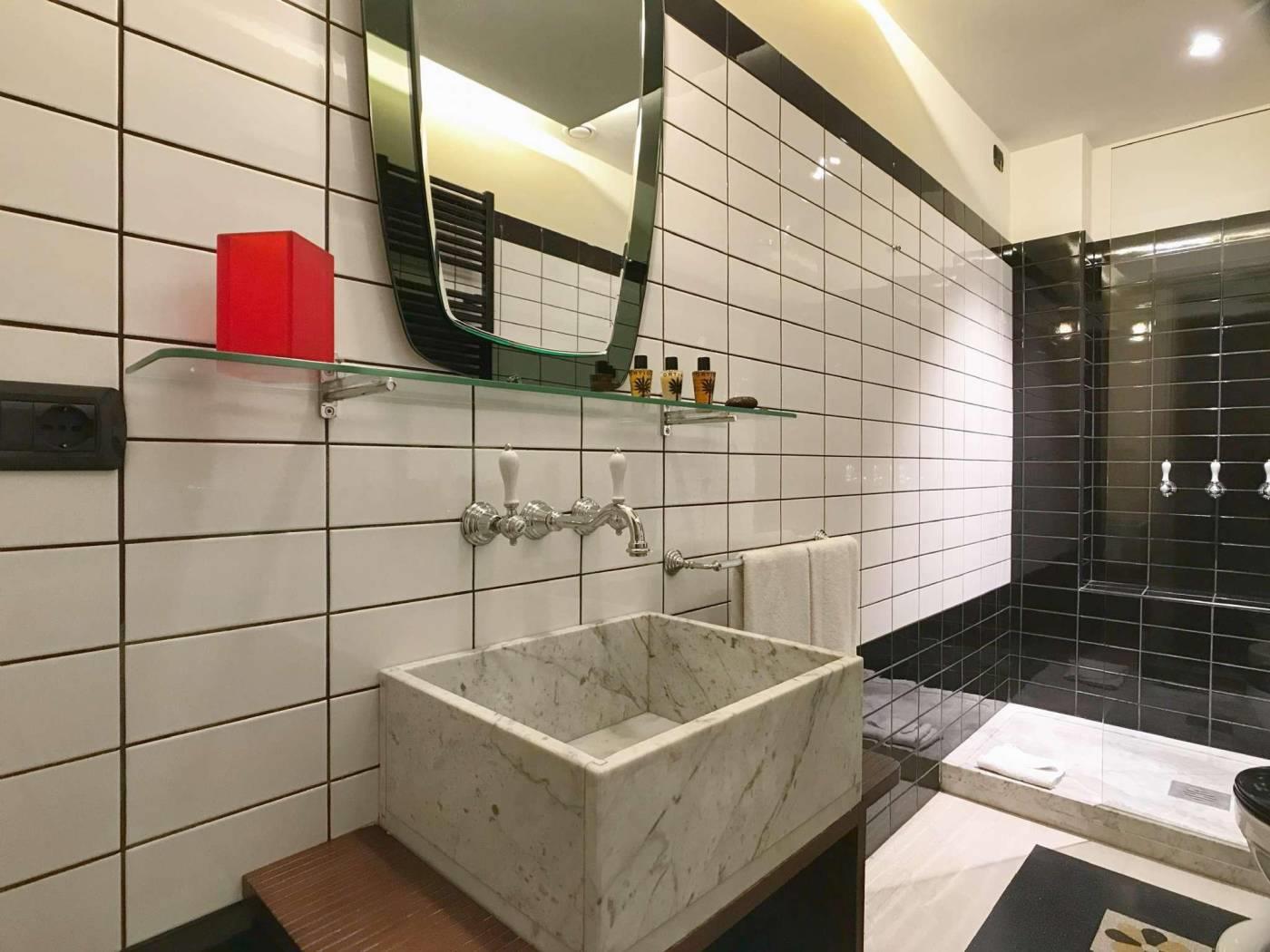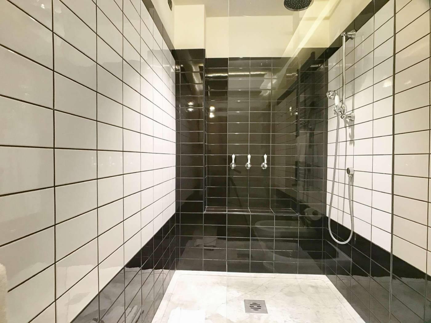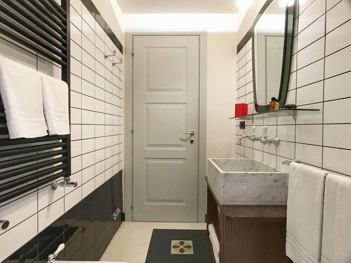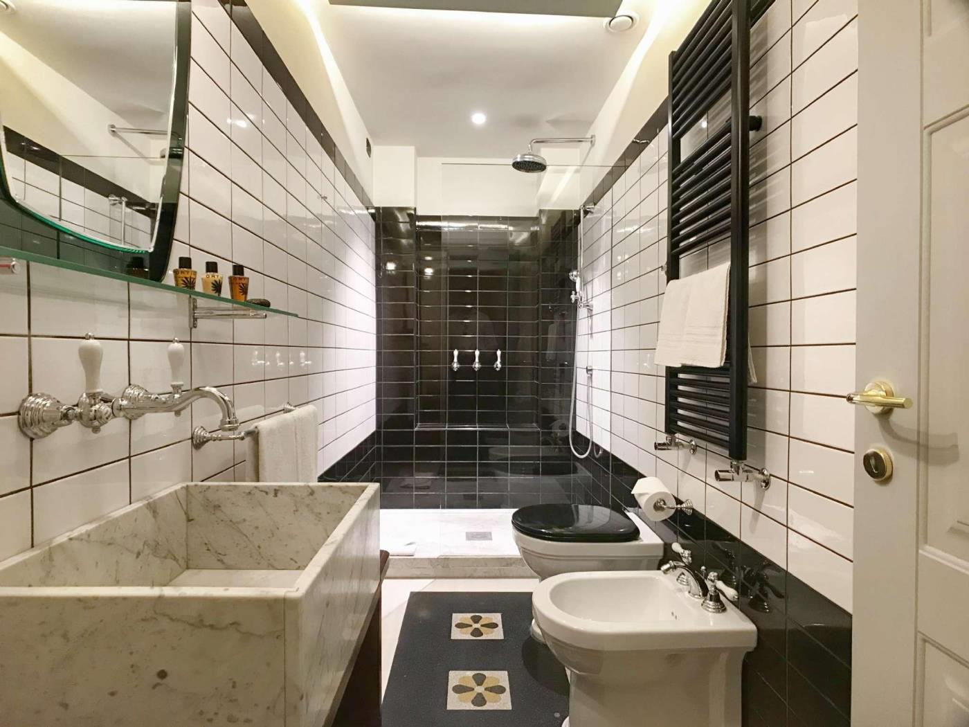 Il bagno con ampio piatto doccia in marmo o vasca è completo di tutto.